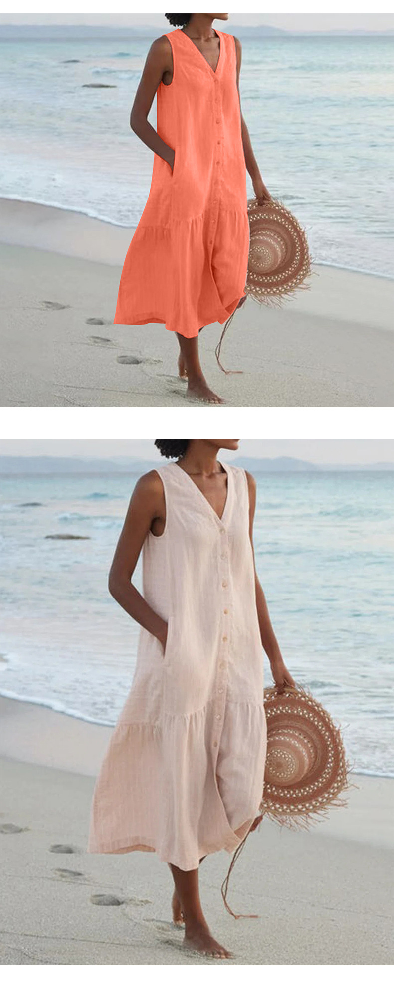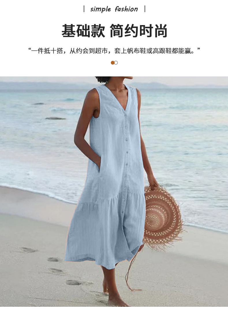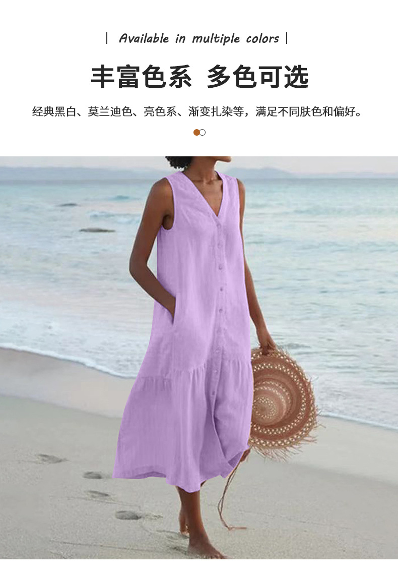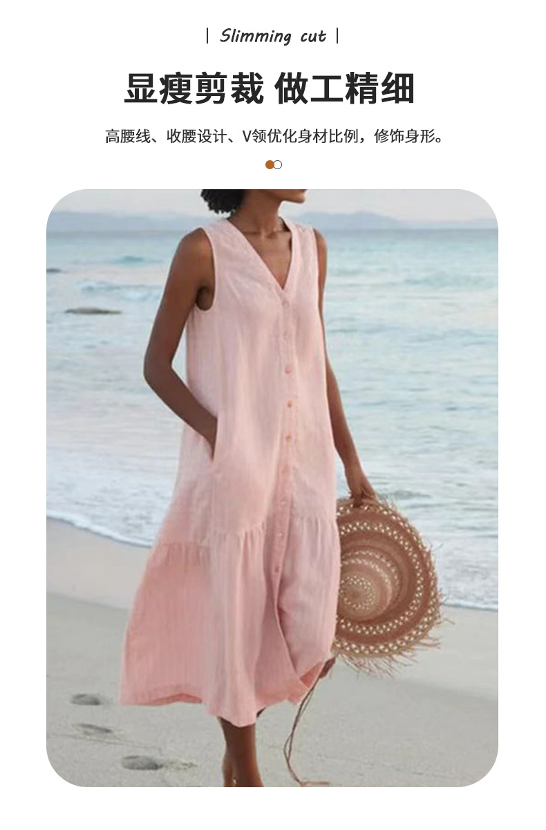 2025 여름 대외 무역 솔리드 컬러 코튼 서스펜더 스타일 통근 트렌드 롱 스커트 루즈 허리 브이넥 핑크 드레스