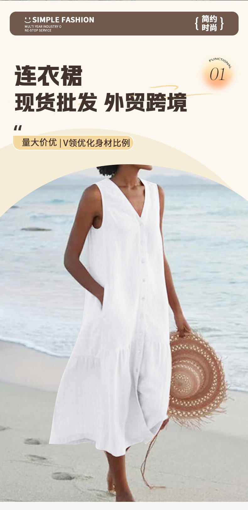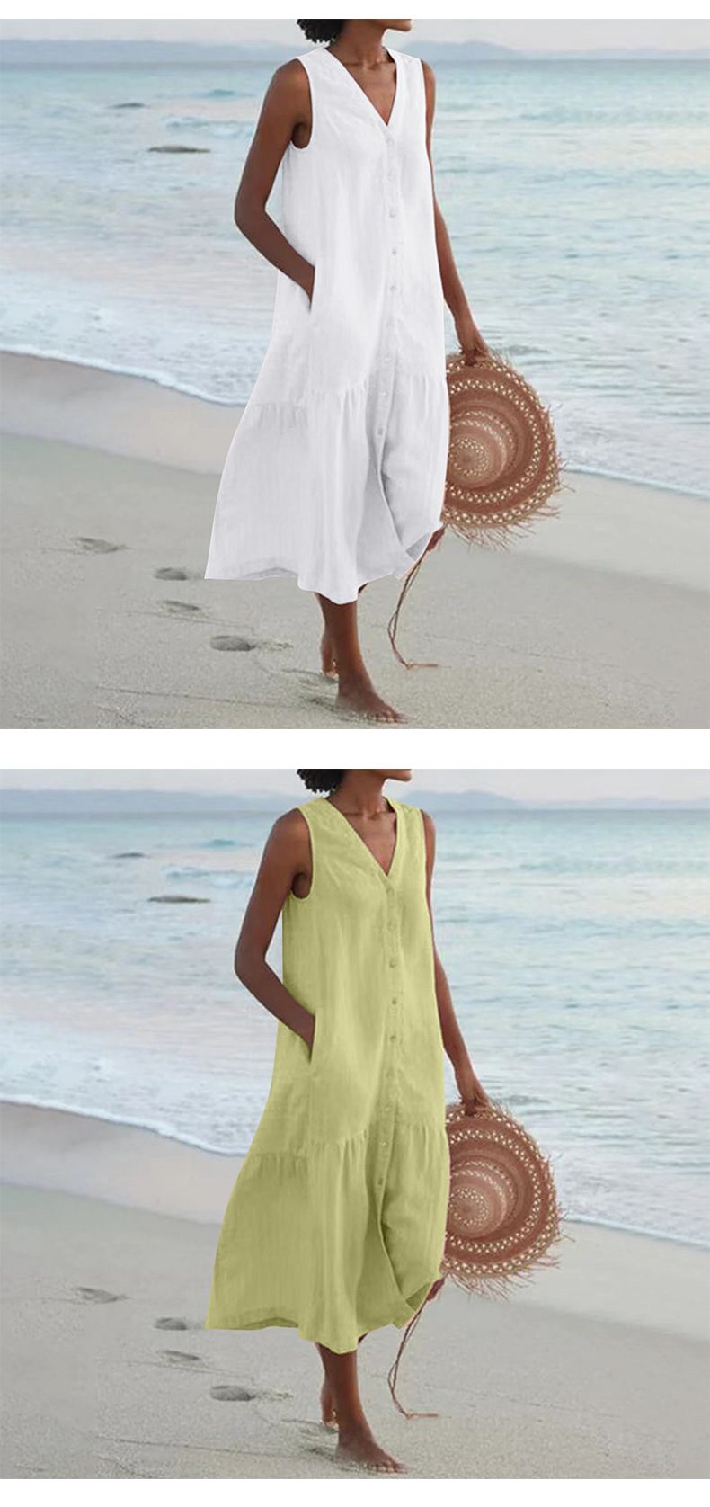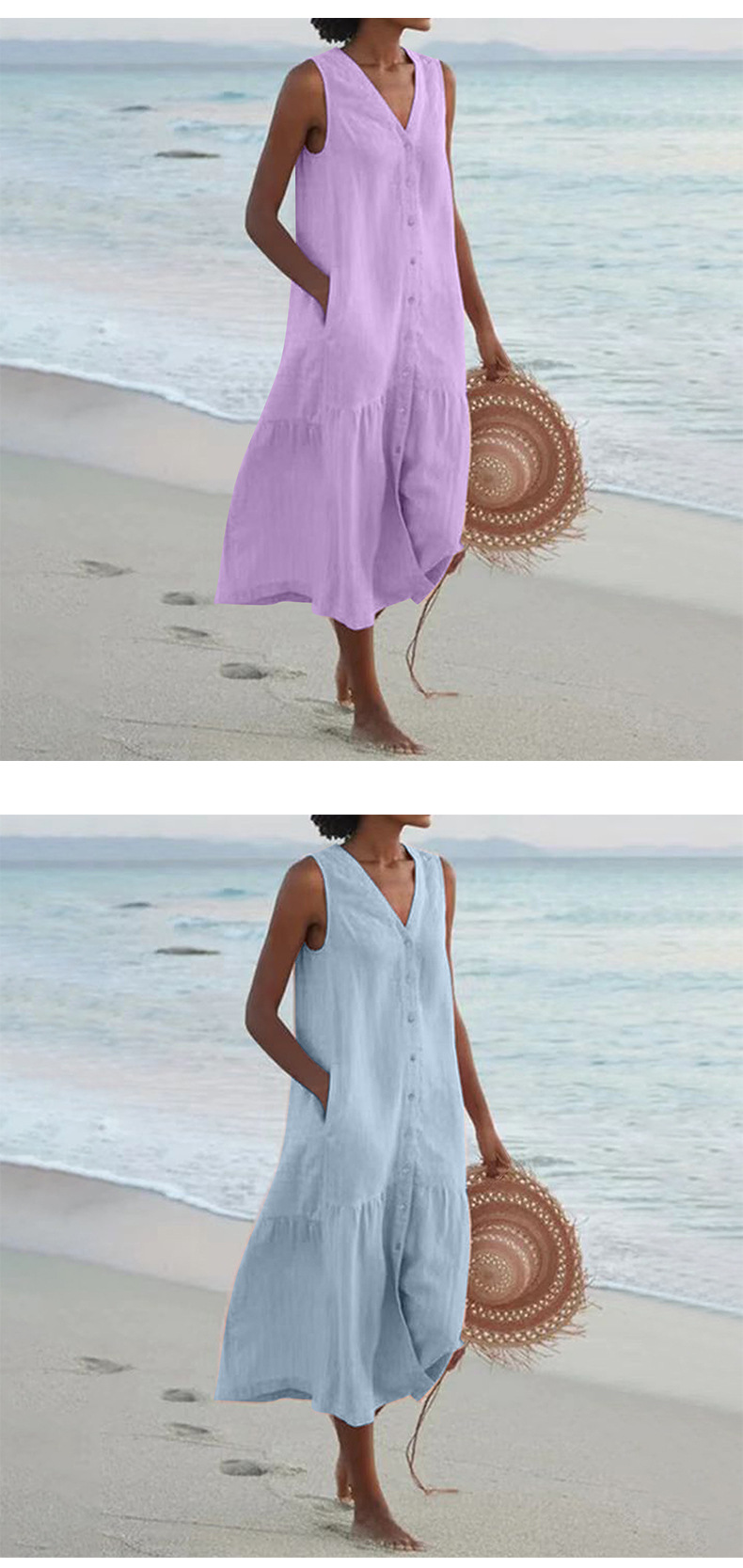 2025 여름 대외 무역 솔리드 컬러 코튼 서스펜더 스타일 통근 트렌드 롱 스커트 루즈 허리 브이넥 핑크 드레스
