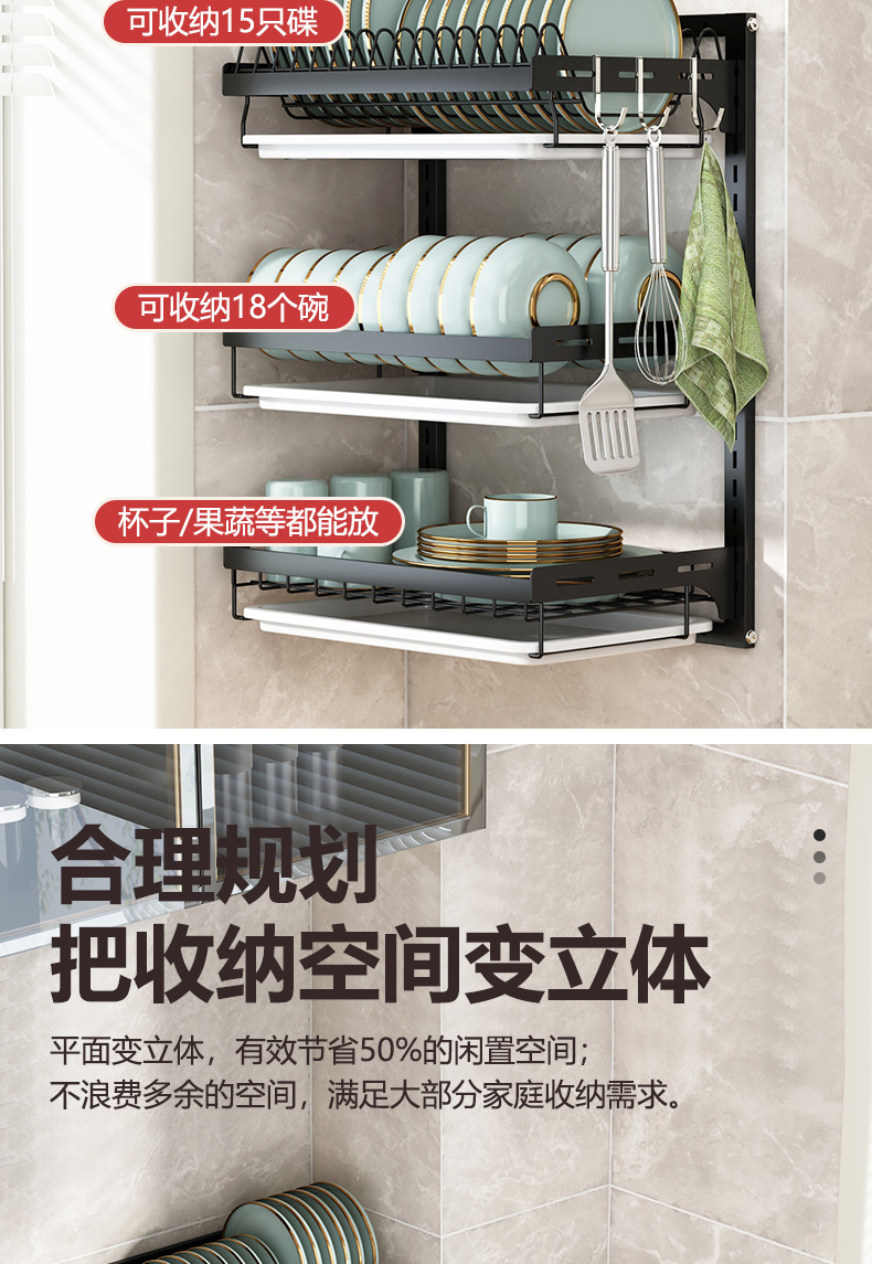 벽걸이형 3 단 접시 선반 + 젓가락 선반 + 커터 도마 선반