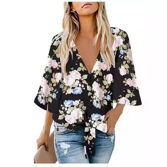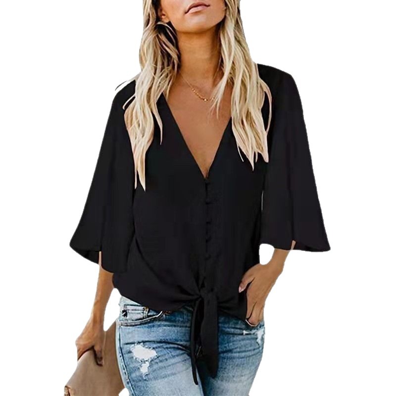 유럽과 미국의 국경 간 여름 기질 통근 자외선 차단 루즈한 쉬폰 유럽과 미국의 브이넥 타이 셔츠 해변 휴가 대외 무역