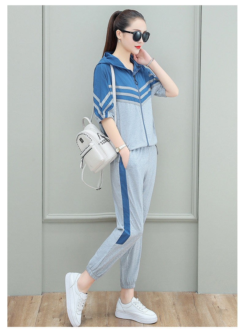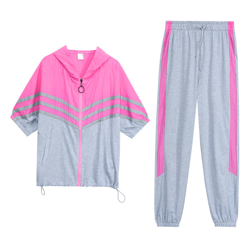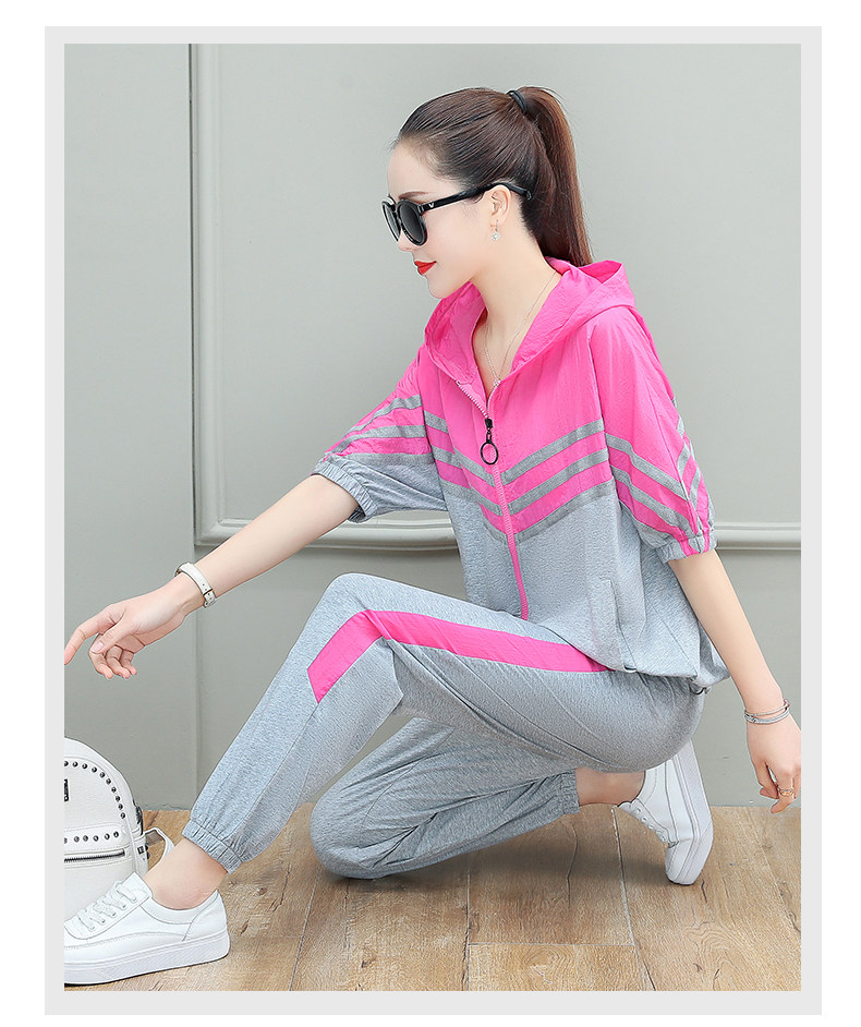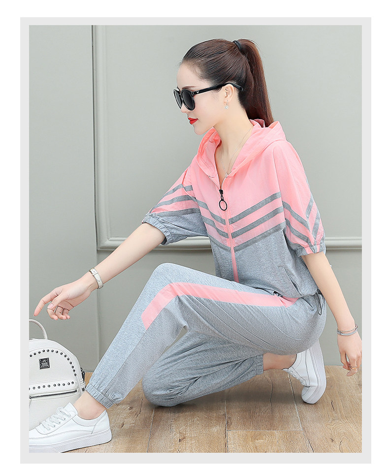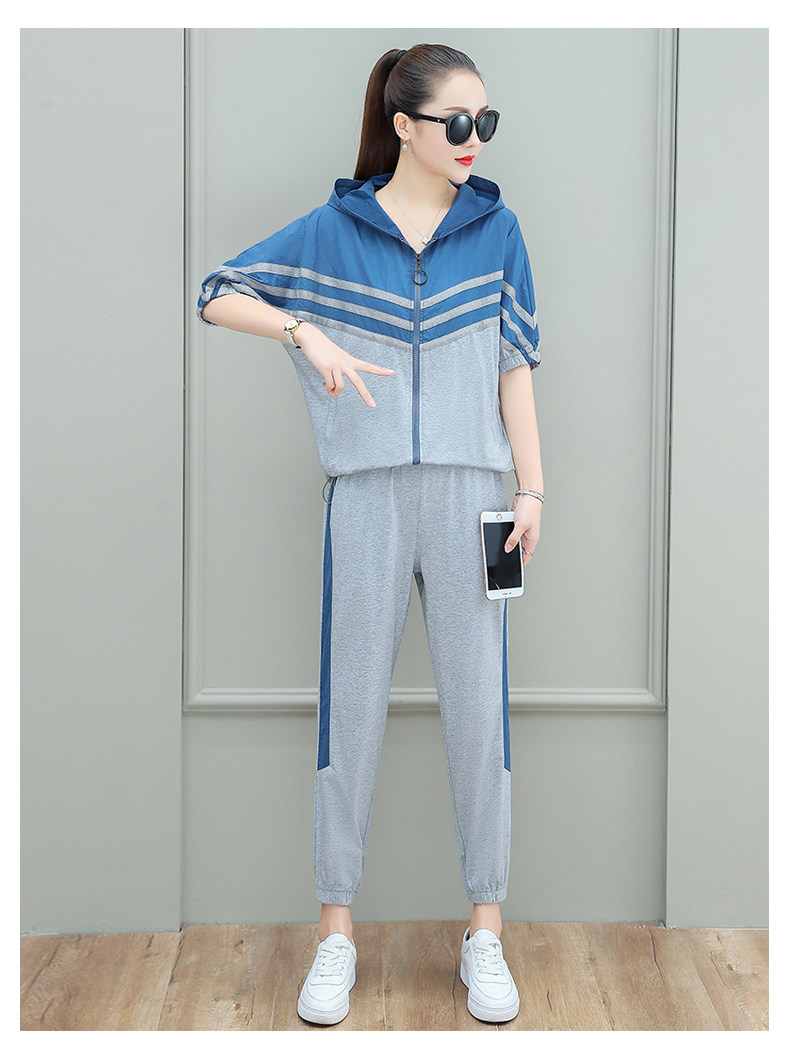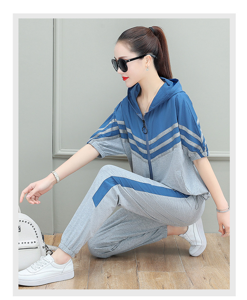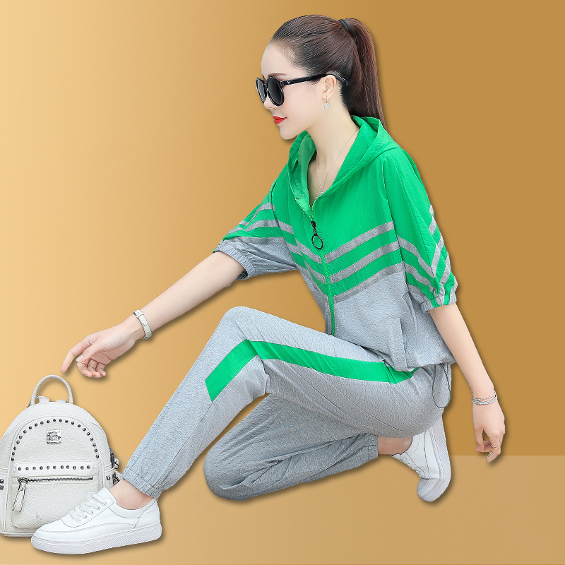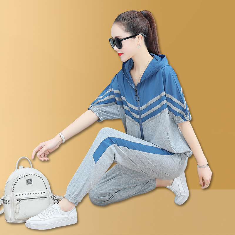 스포츠웨어 여자의 여름 세트 여자의 얇은 패션 여자의 점프 후드 반팔 스웨터 캐주얼 투피스 세트