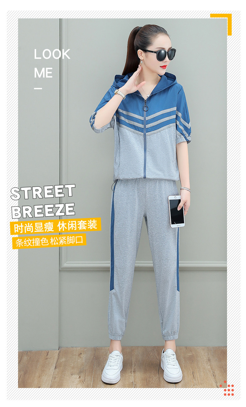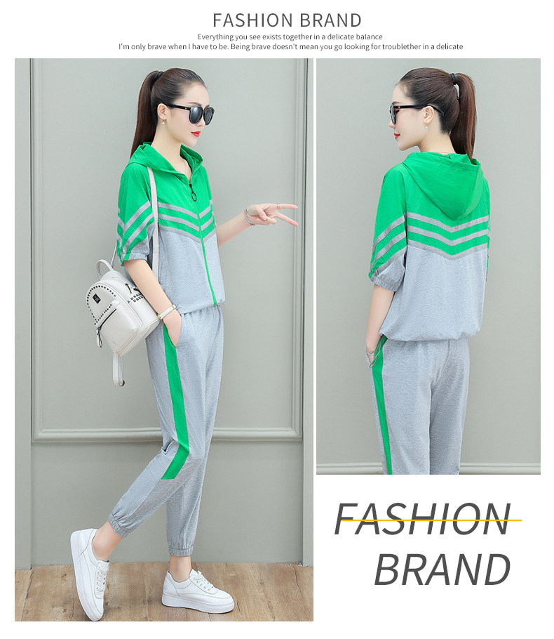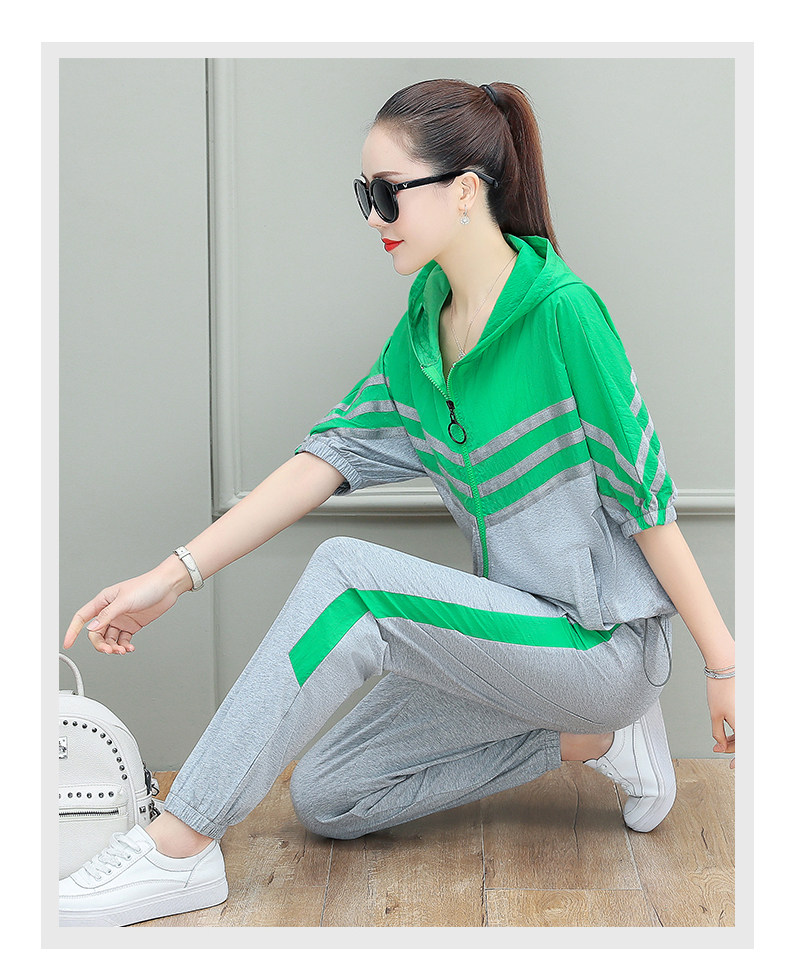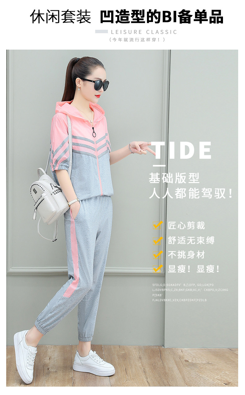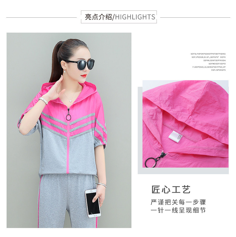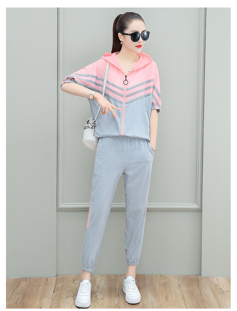 스포츠웨어 여자의 여름 세트 여자의 얇은 패션 여자의 점프 후드 반팔 스웨터 캐주얼 투피스 세트