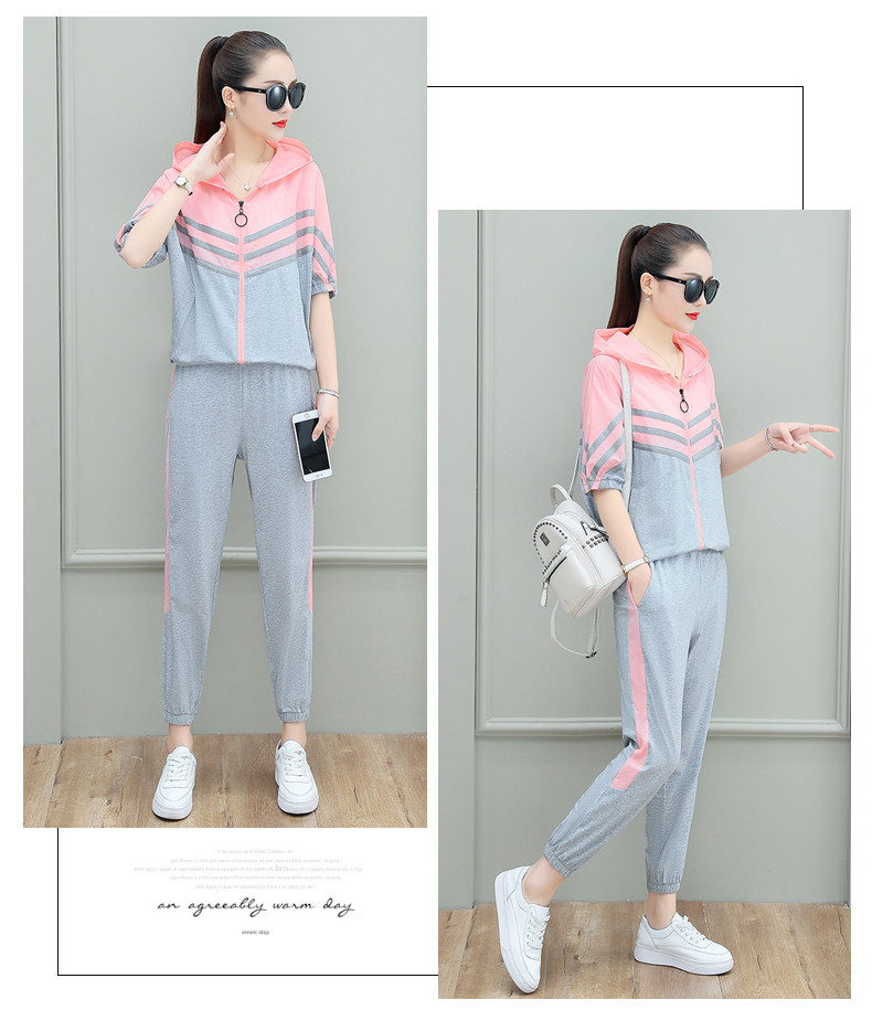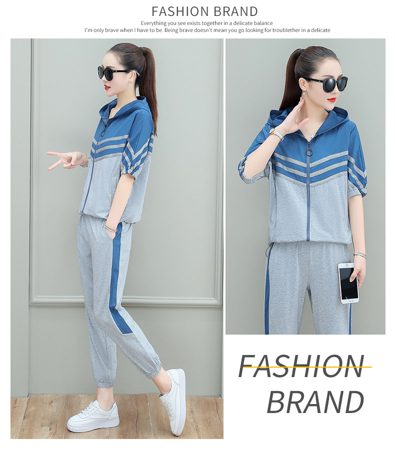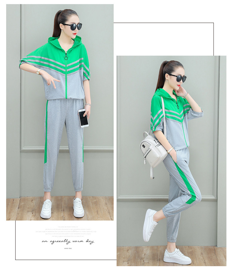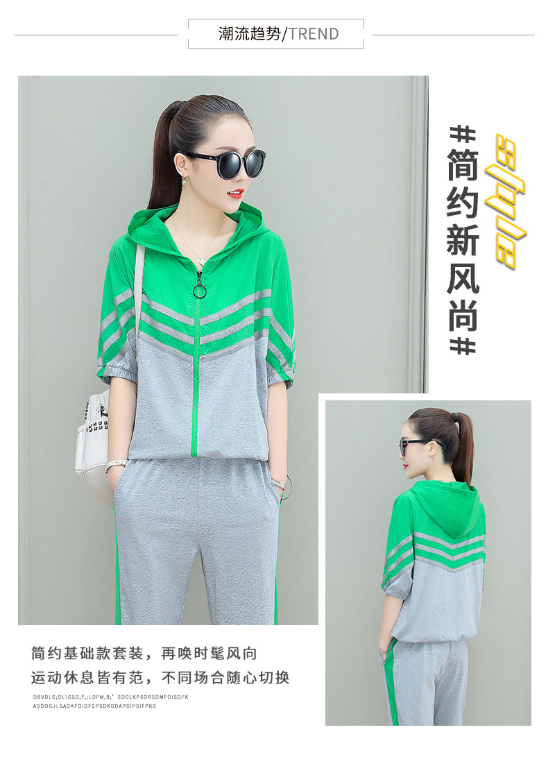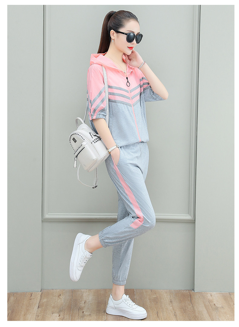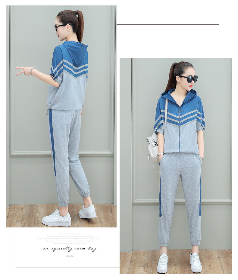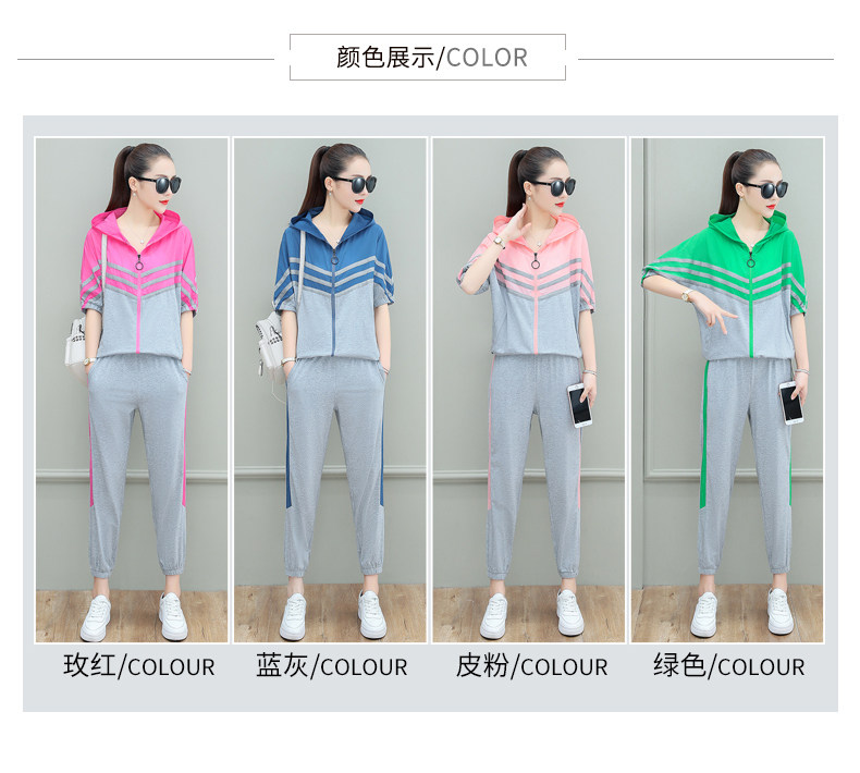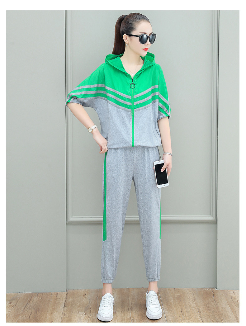 스포츠웨어 여자의 여름 세트 여자의 얇은 패션 여자의 점프 후드 반팔 스웨터 캐주얼 투피스 세트
