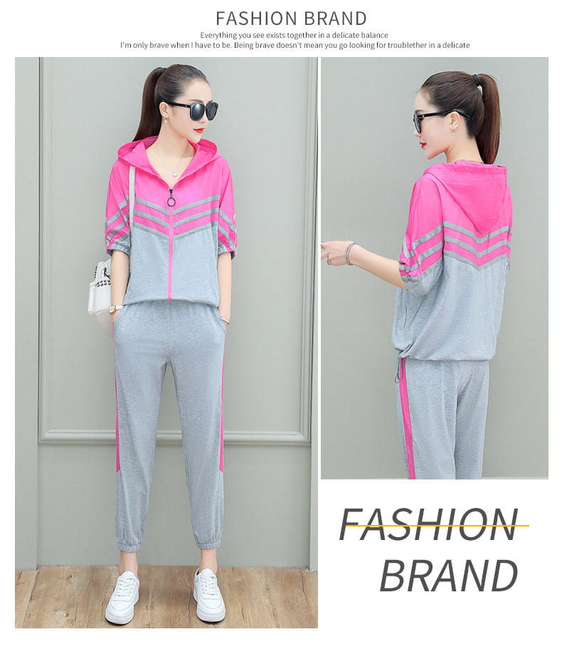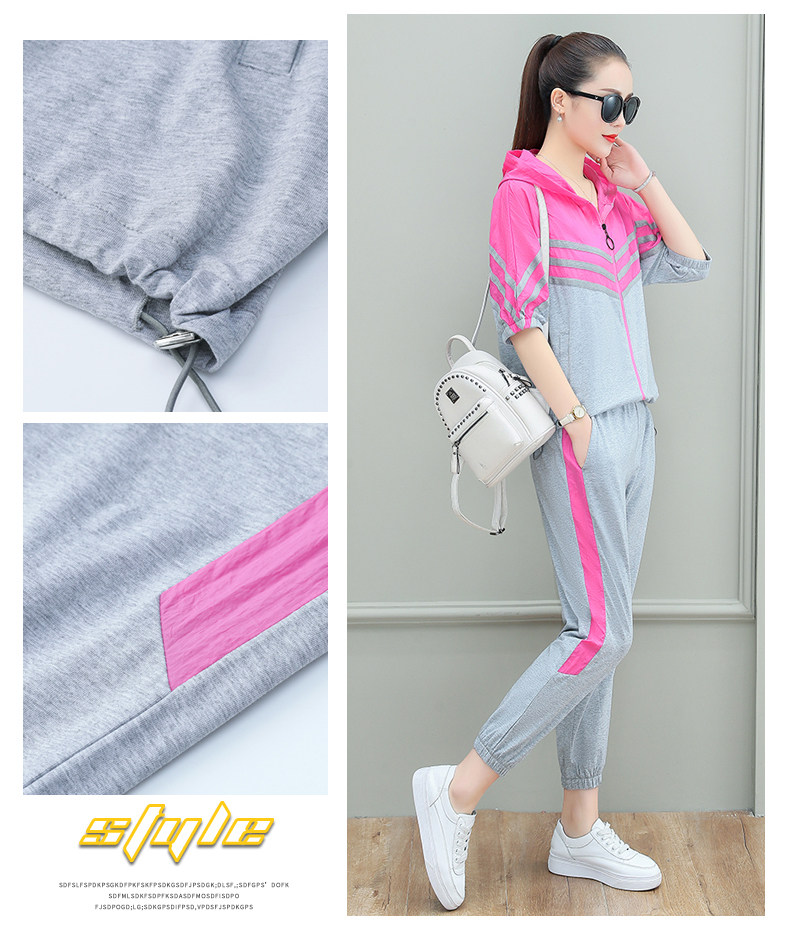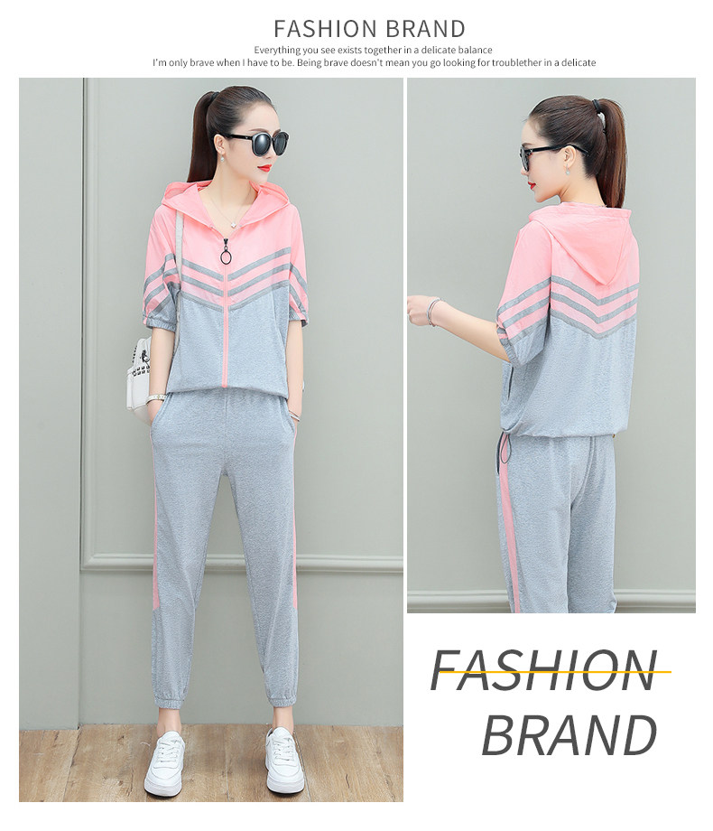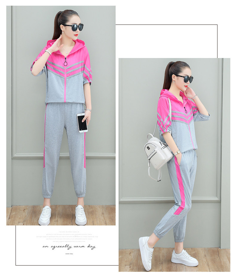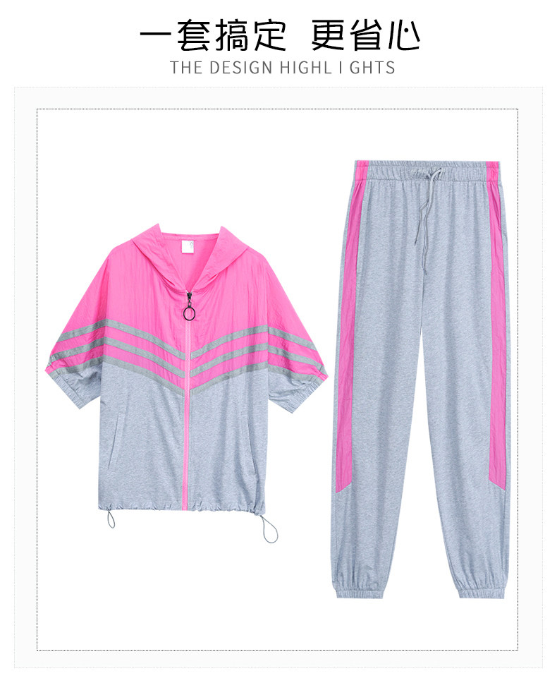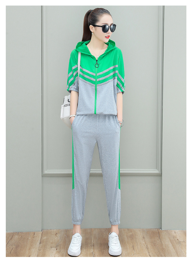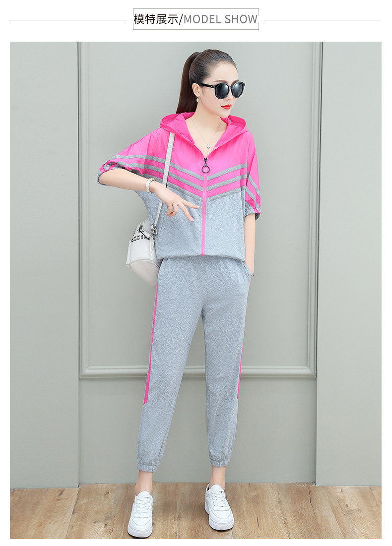 스포츠웨어 여자의 여름 세트 여자의 얇은 패션 여자의 점프 후드 반팔 스웨터 캐주얼 투피스 세트