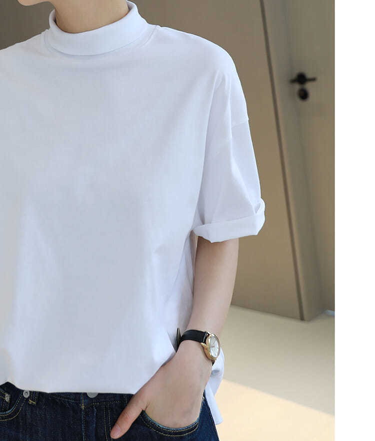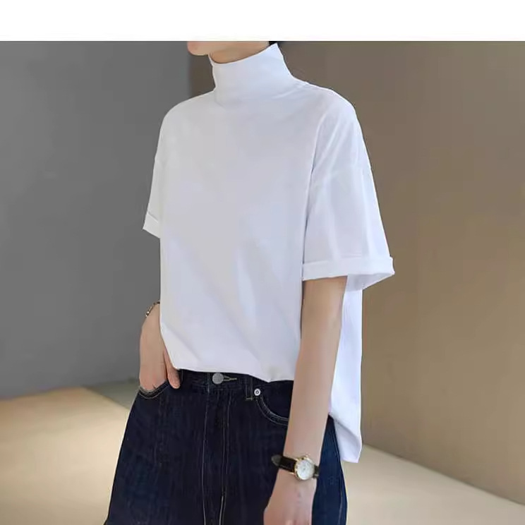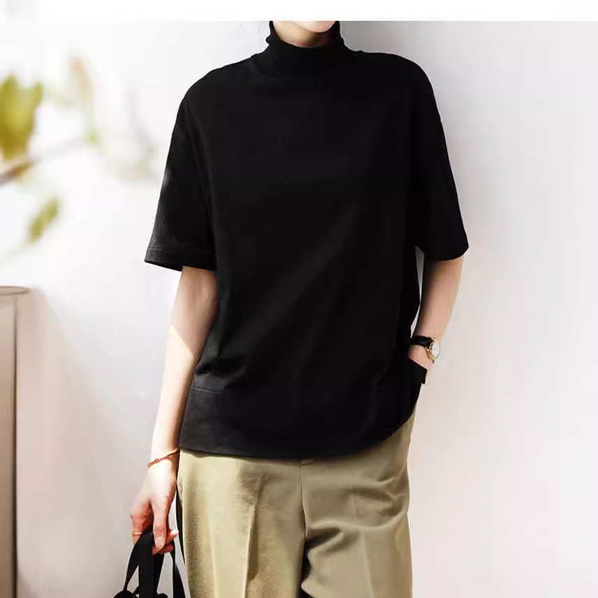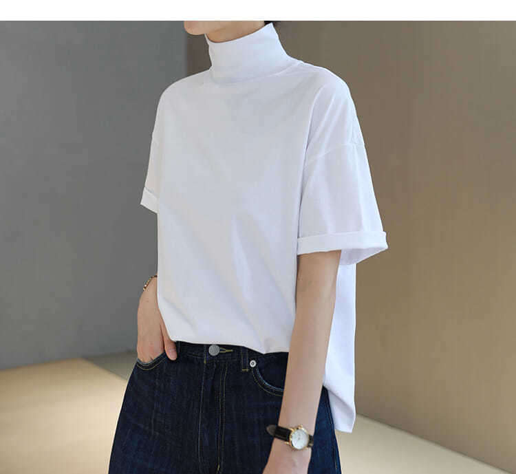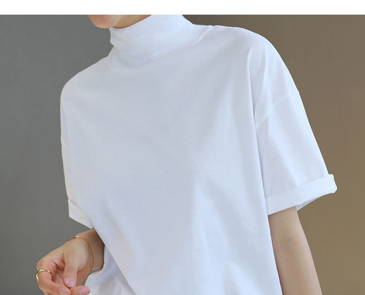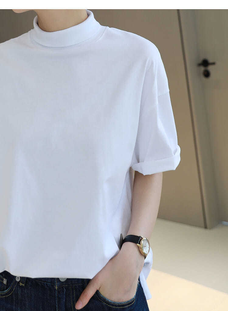 2026 여름 반팔 패셔너블한 하프넥 캐주얼 루즈핏 티셔츠 여성용 한국 스타일 단색 학생 상의