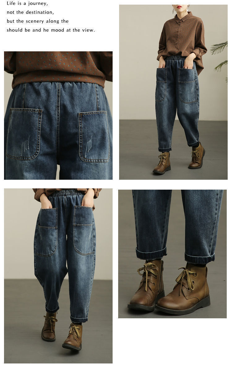 [재고] 봄, 여름, 가을 탄성 허리 Harlan 바지 복고풍 오래 된 어두운 청바지 여성의 느슨한 넓은 다리 바지
