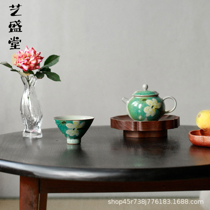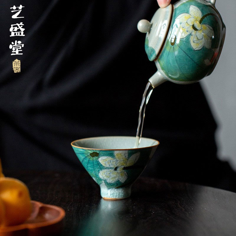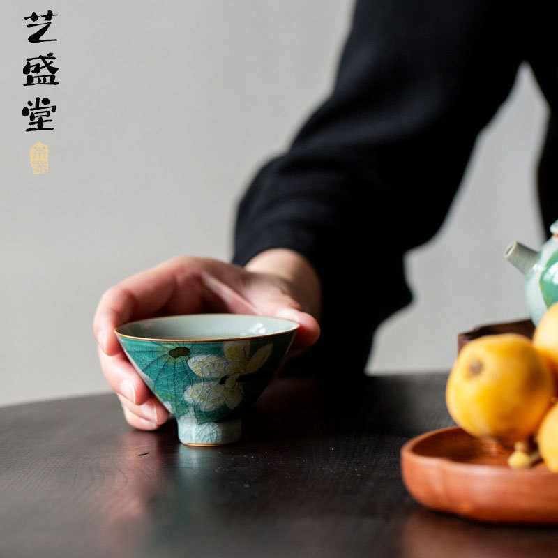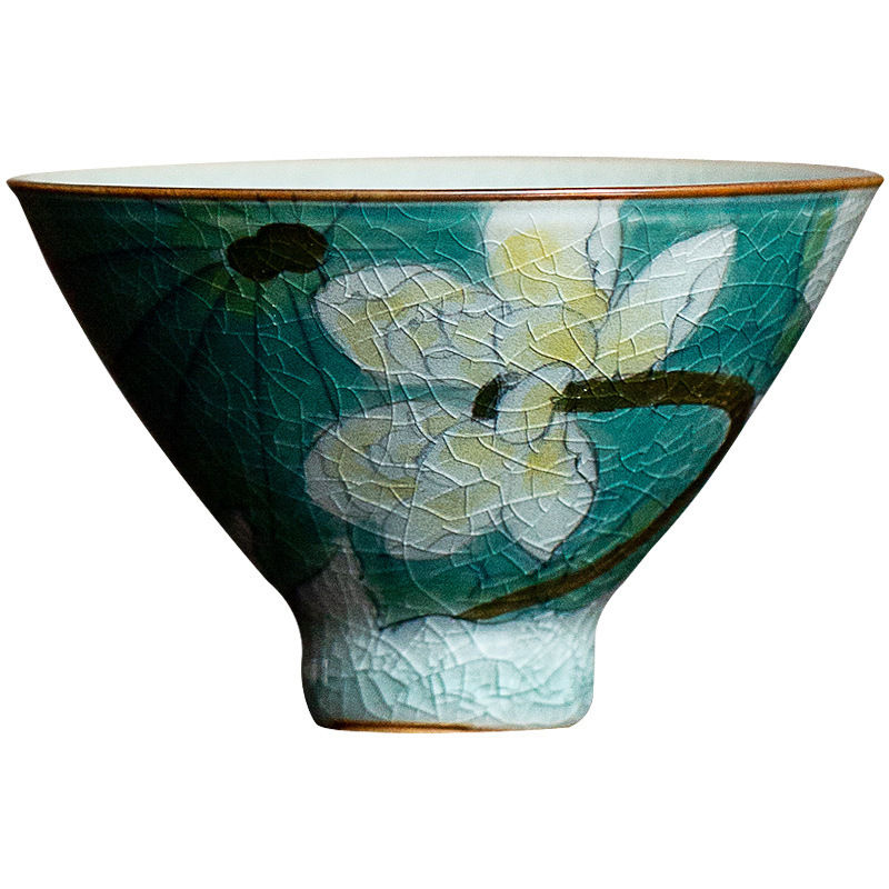 손으로 그린 얼음 갈라진 연꽃 모자 차 시음 컵 마스터 컵 홈 차 그릇 언더글레이즈 컬러 오픈 볼 쿵푸 차 세트