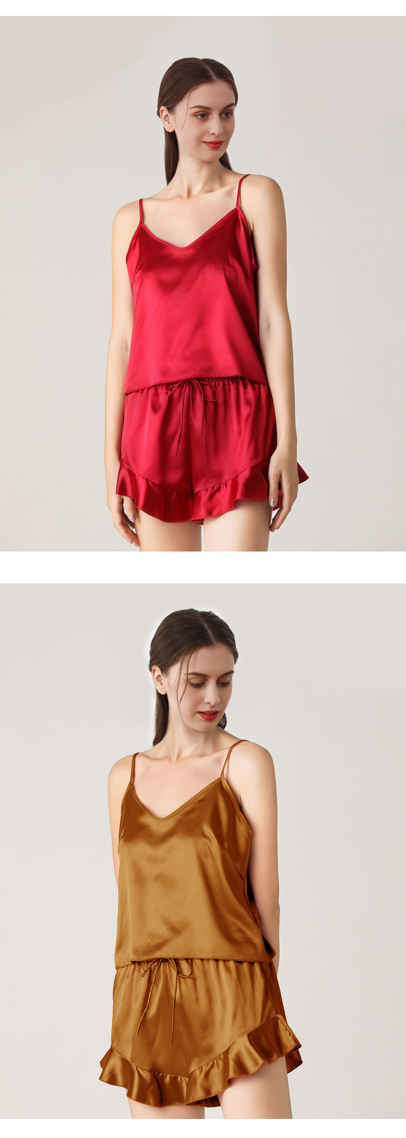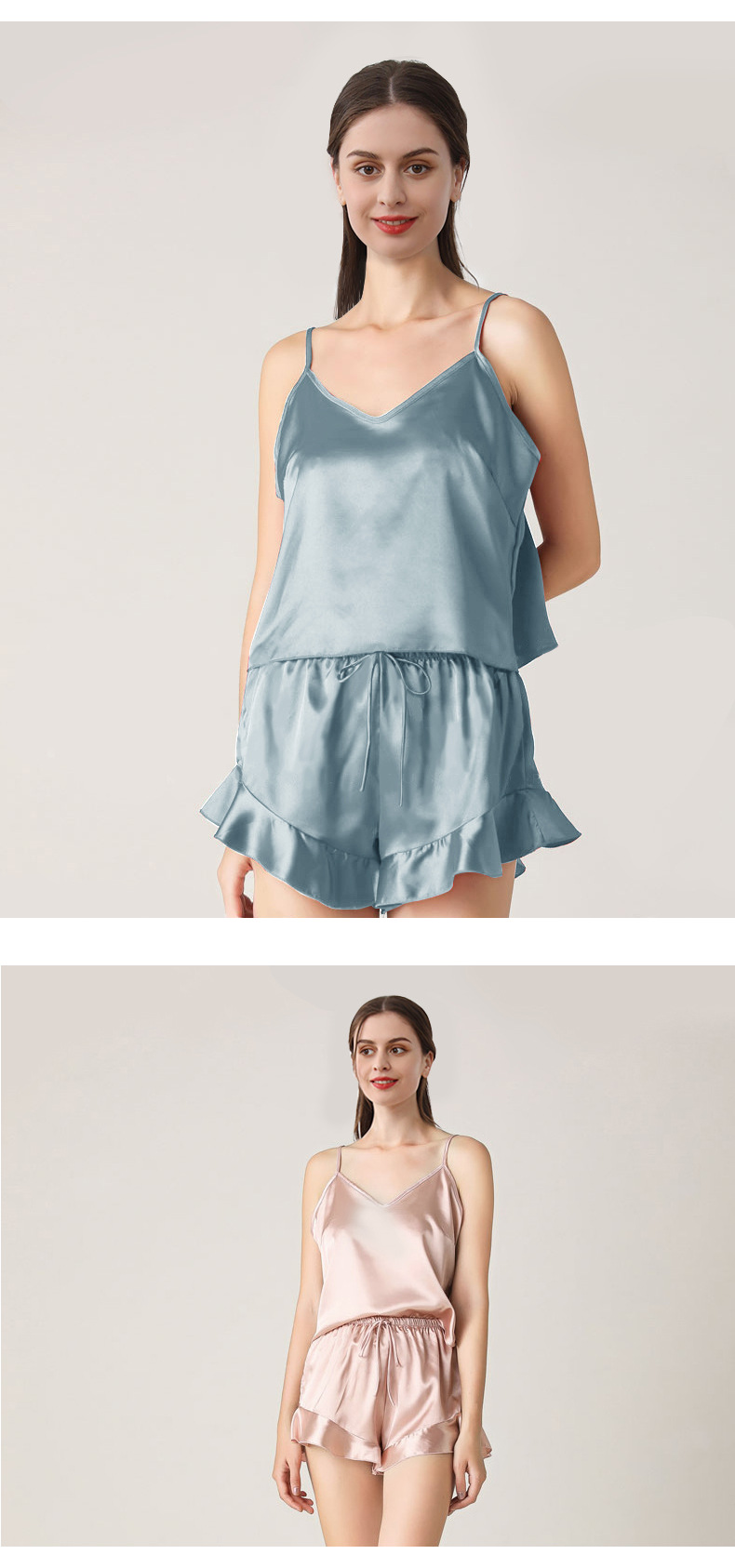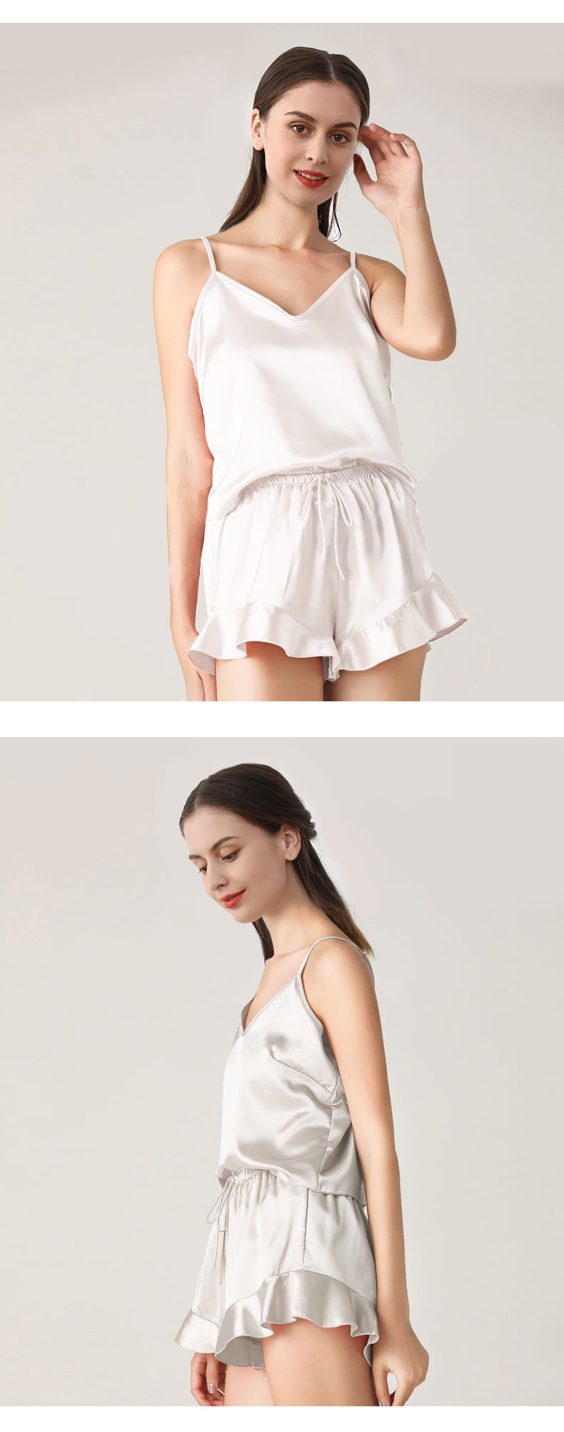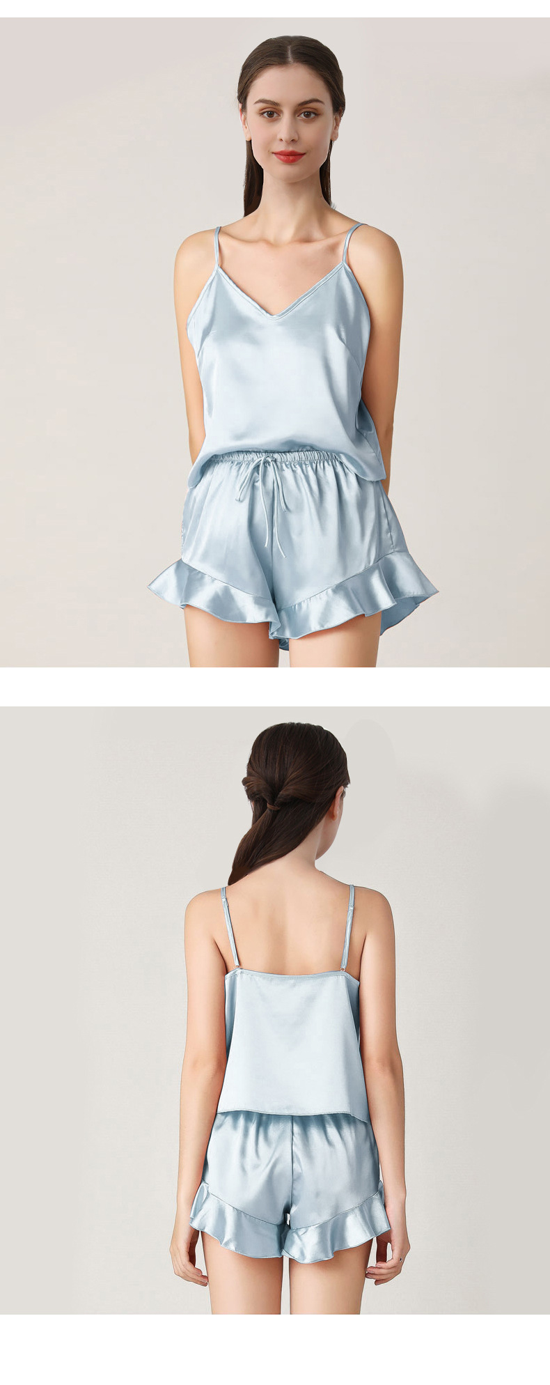 19 Mumi 헤비급 실크 잠옷 100% 뽕나무 실크 프릴 서스펜더 반바지 정장 여성의 섹시한 홈웨어