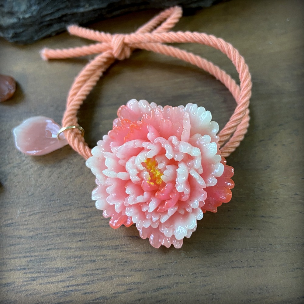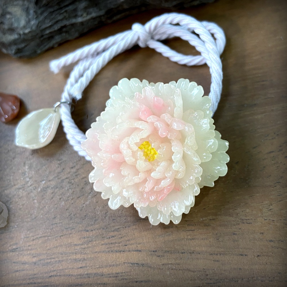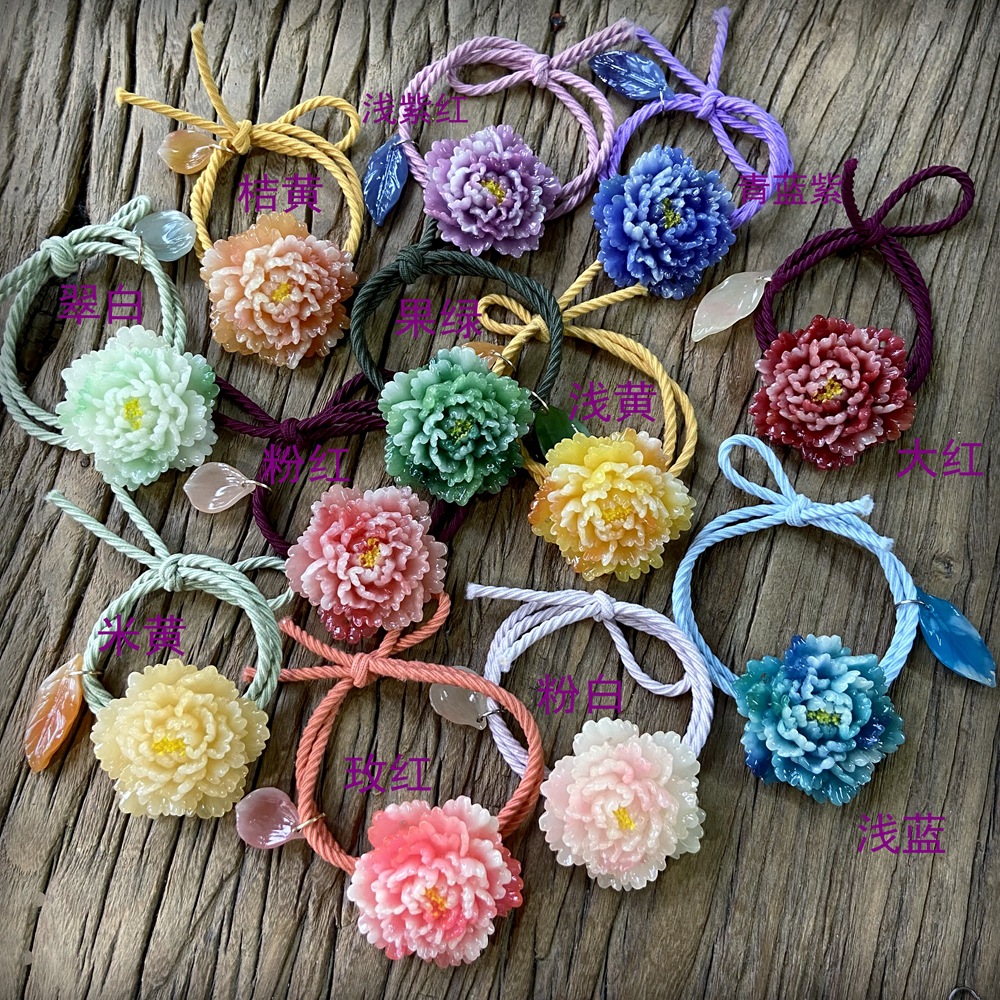 产品名称:牡丹花发圈发绳 牡丹花尺寸:37*37mm 重量:12克 产品编号:TXB-011 产品材质:仿玉水晶树脂 用途:女用头饰,儿童头饰
