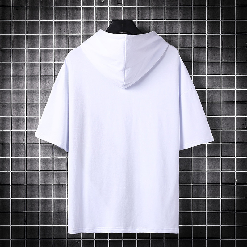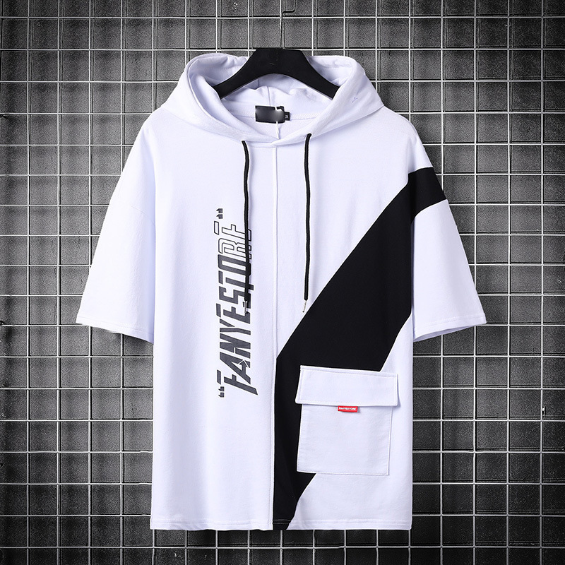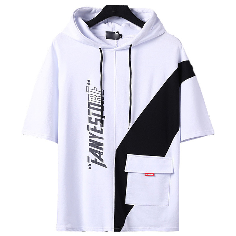 2022 여름 캐주얼 새로운 후드 반팔 티셔츠 남성용 얇은 디자인 감각 반팔 스티치 스웨터 플러스 사이즈 남성복