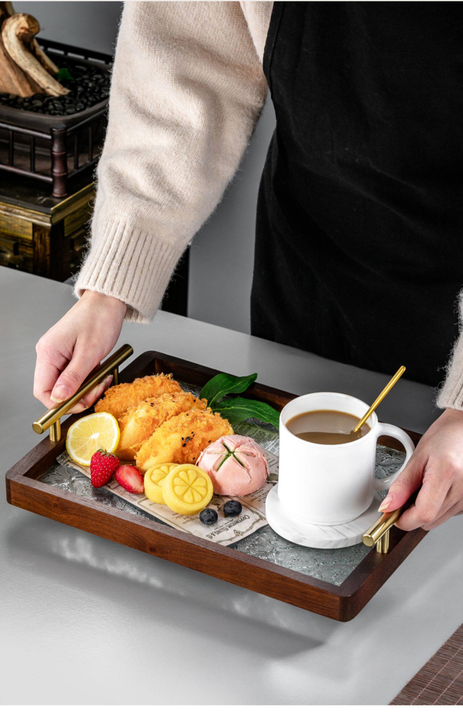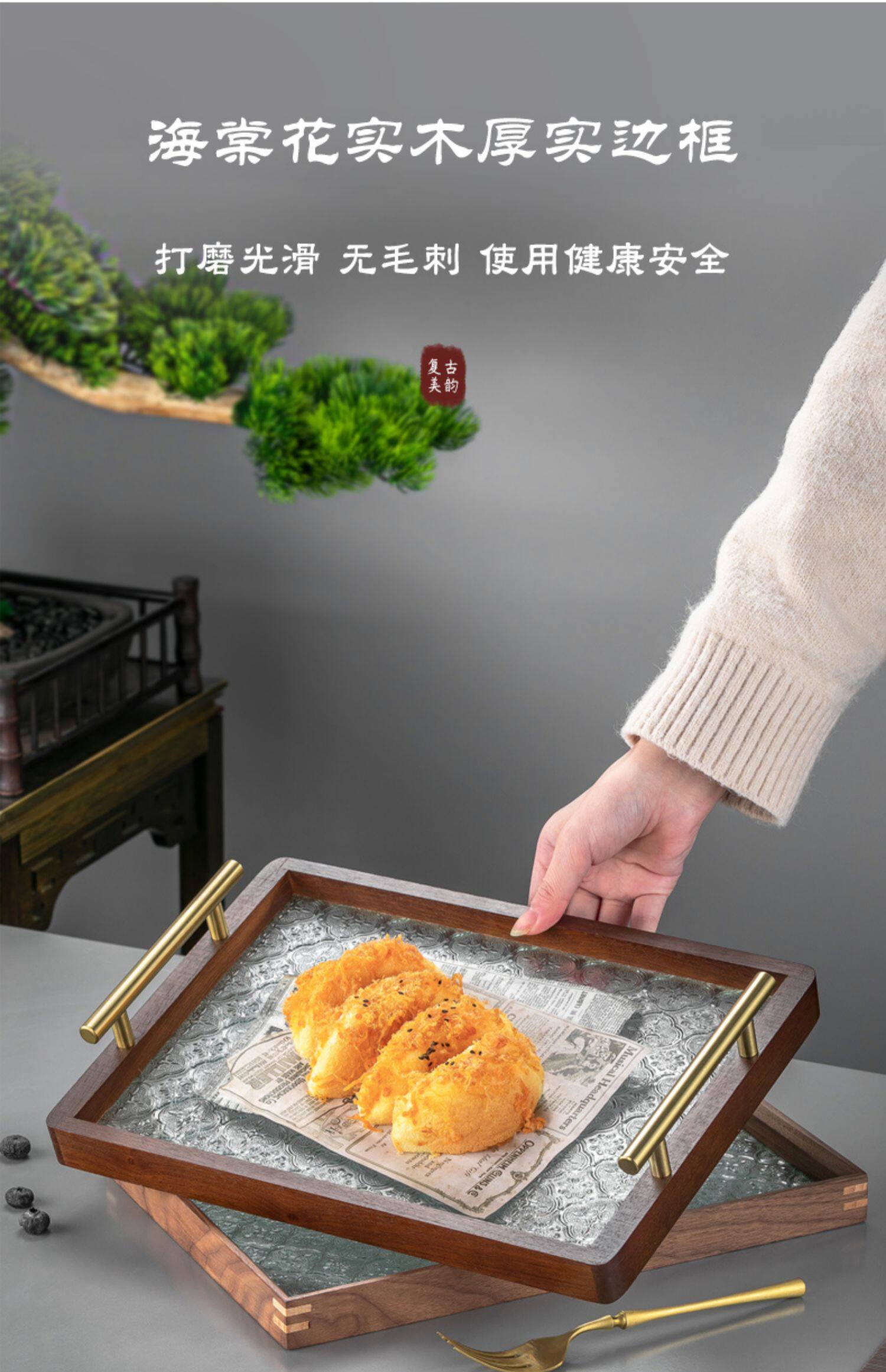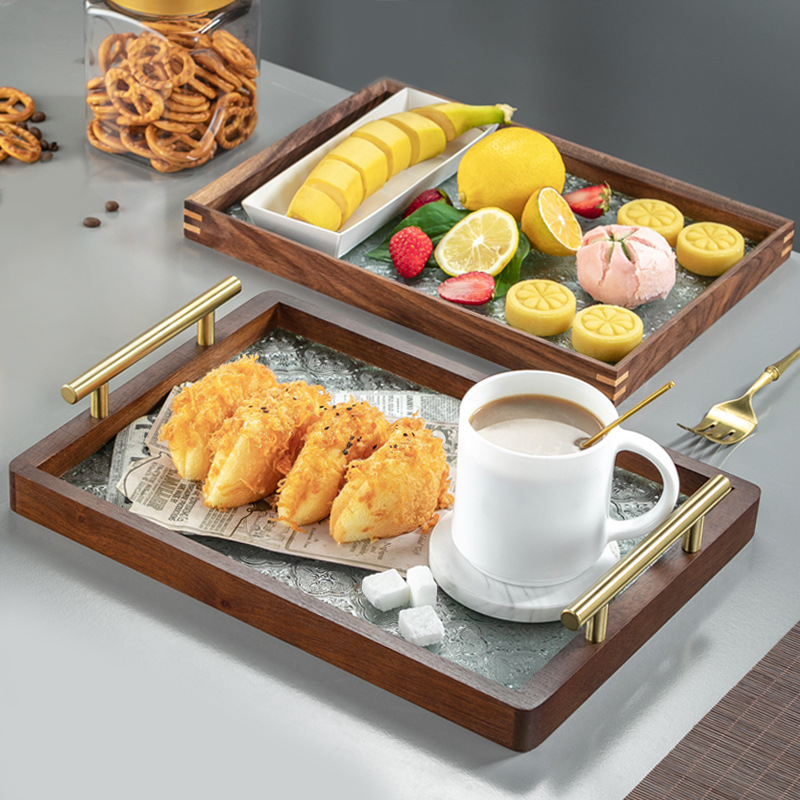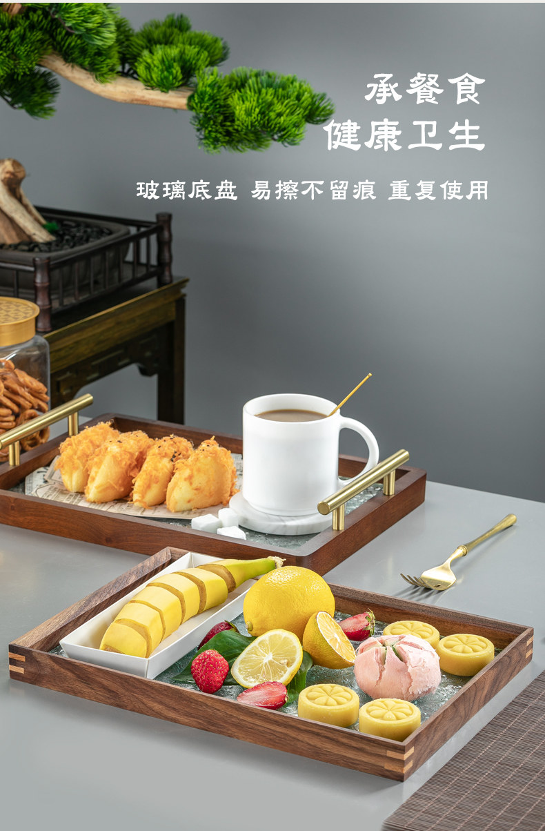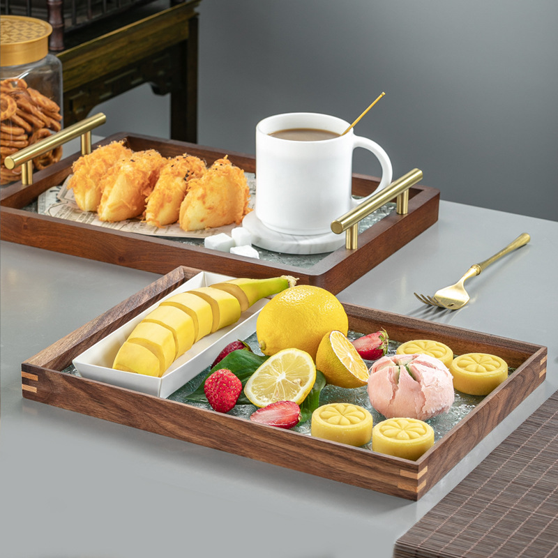 원목 유리 트레이 작은 직사각형 호두나무 컵 보관 과일 거실 티 테이블 간식 트레이 과일 트레이