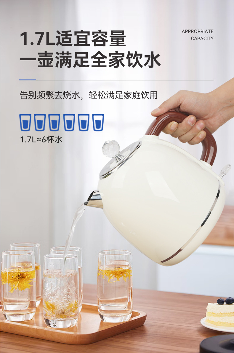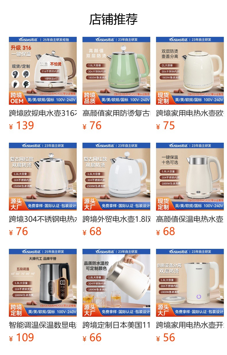 Youda 전기 주전자 국경 유럽 표준 주전자 304 스테인레스 스틸 더블 레이어 레트로 주전자 홈 도매 OEM