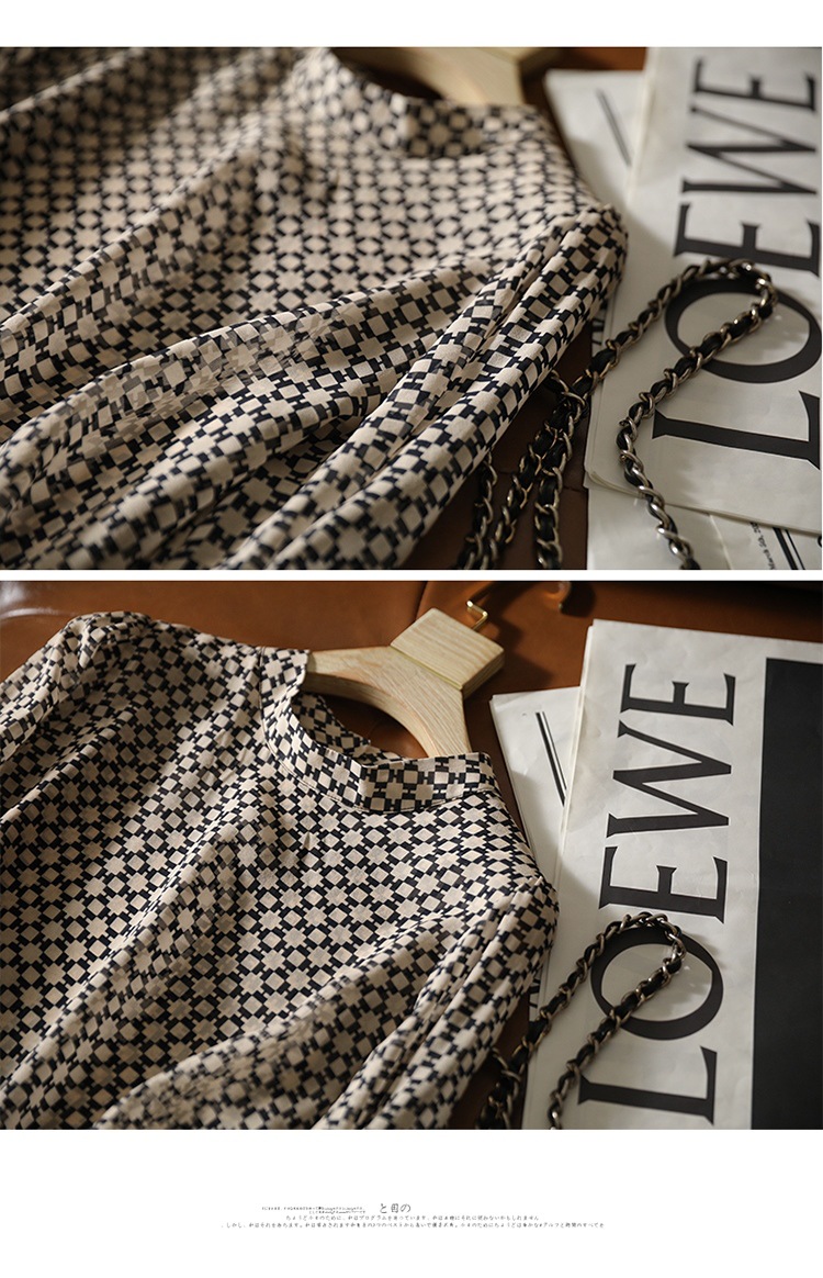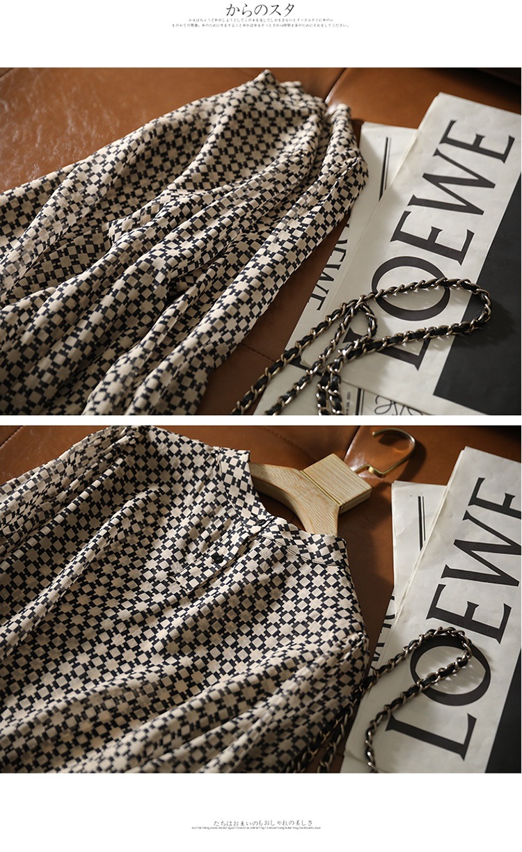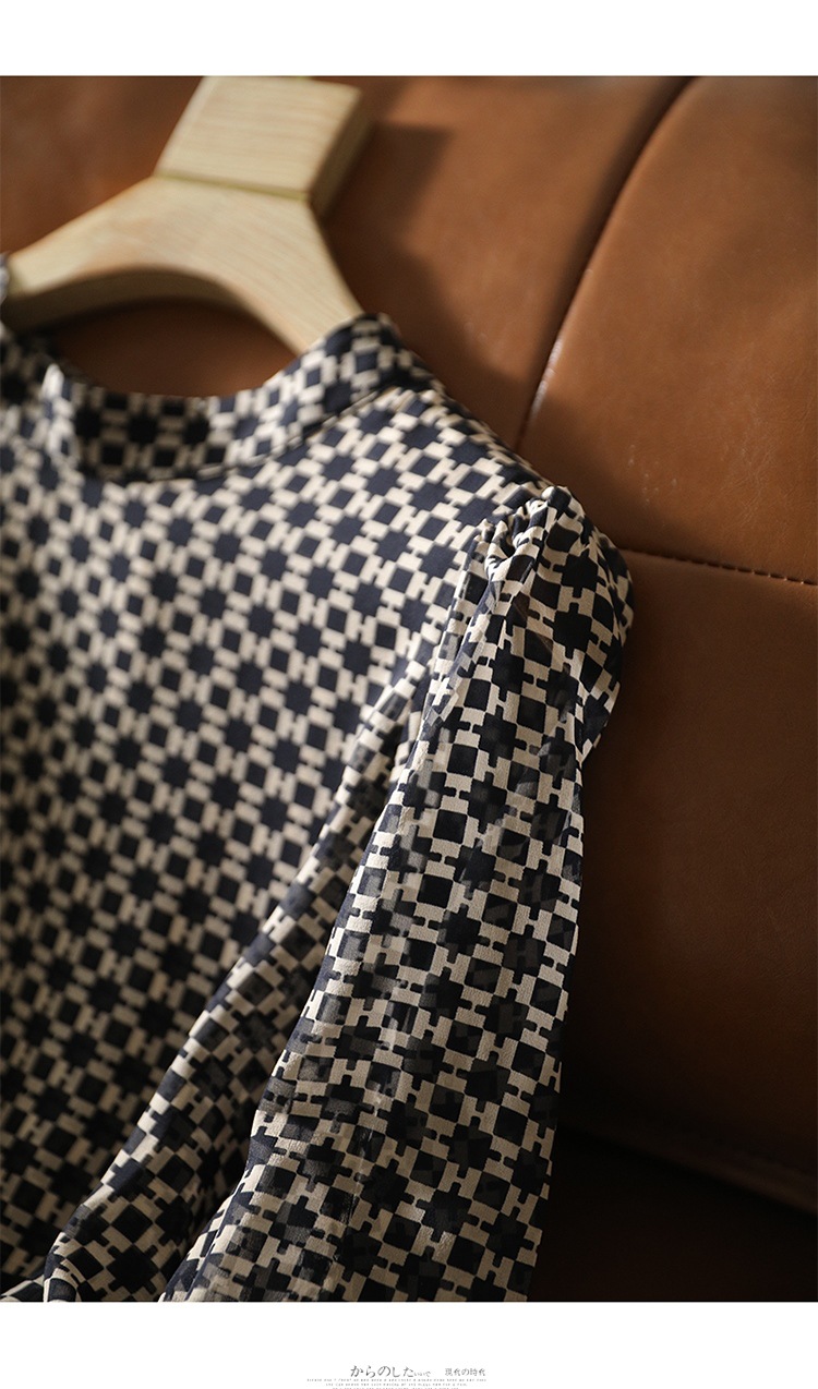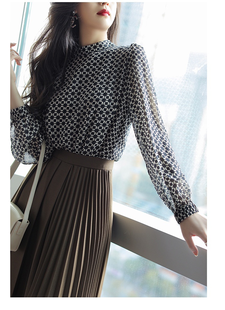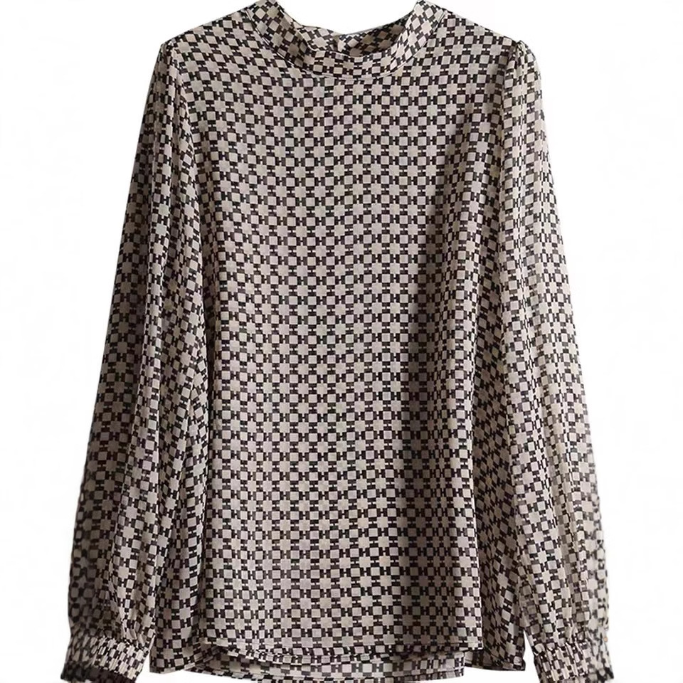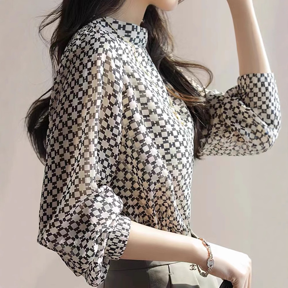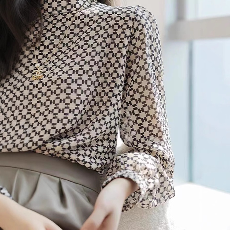 심플하고 우아하며 편안한 여성용 쉬폰 셔츠 2025 봄 여름 가을 캐주얼 프린트 반하이넥 긴팔 셔츠