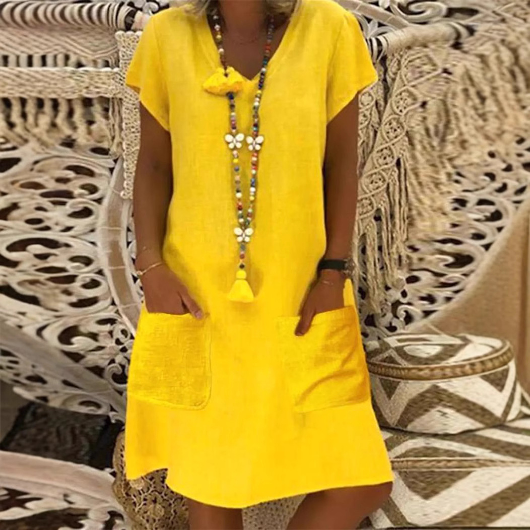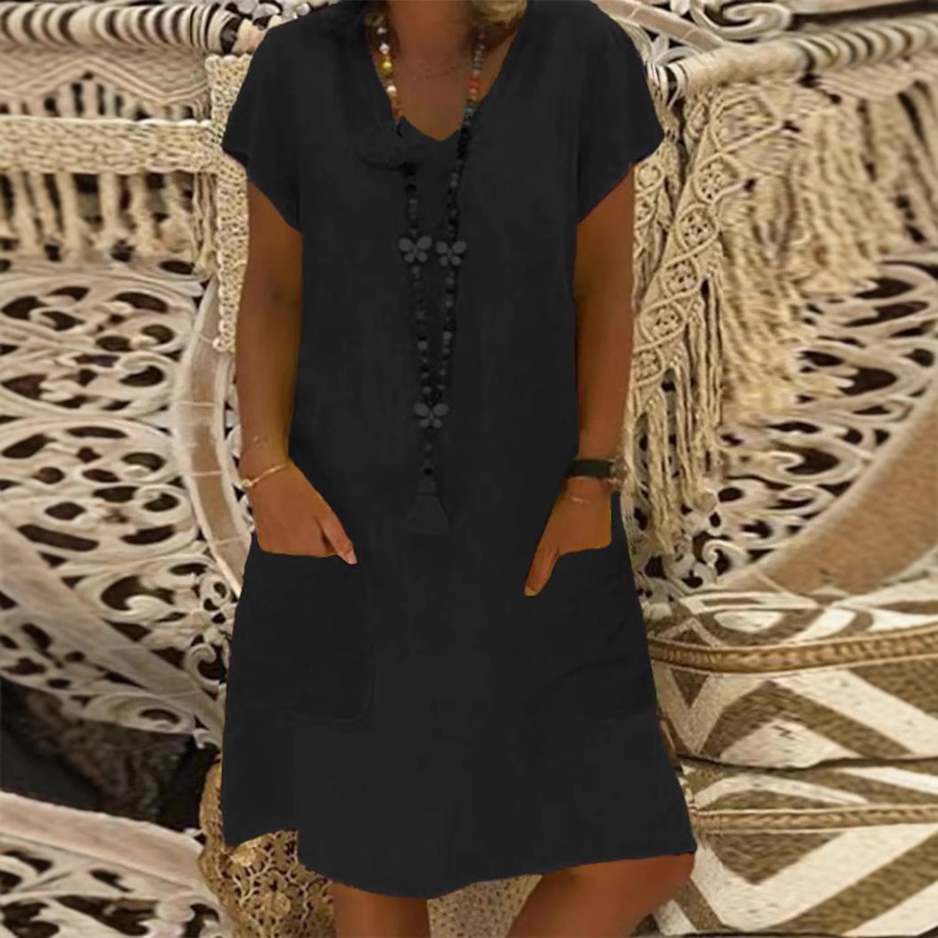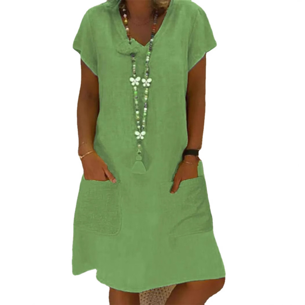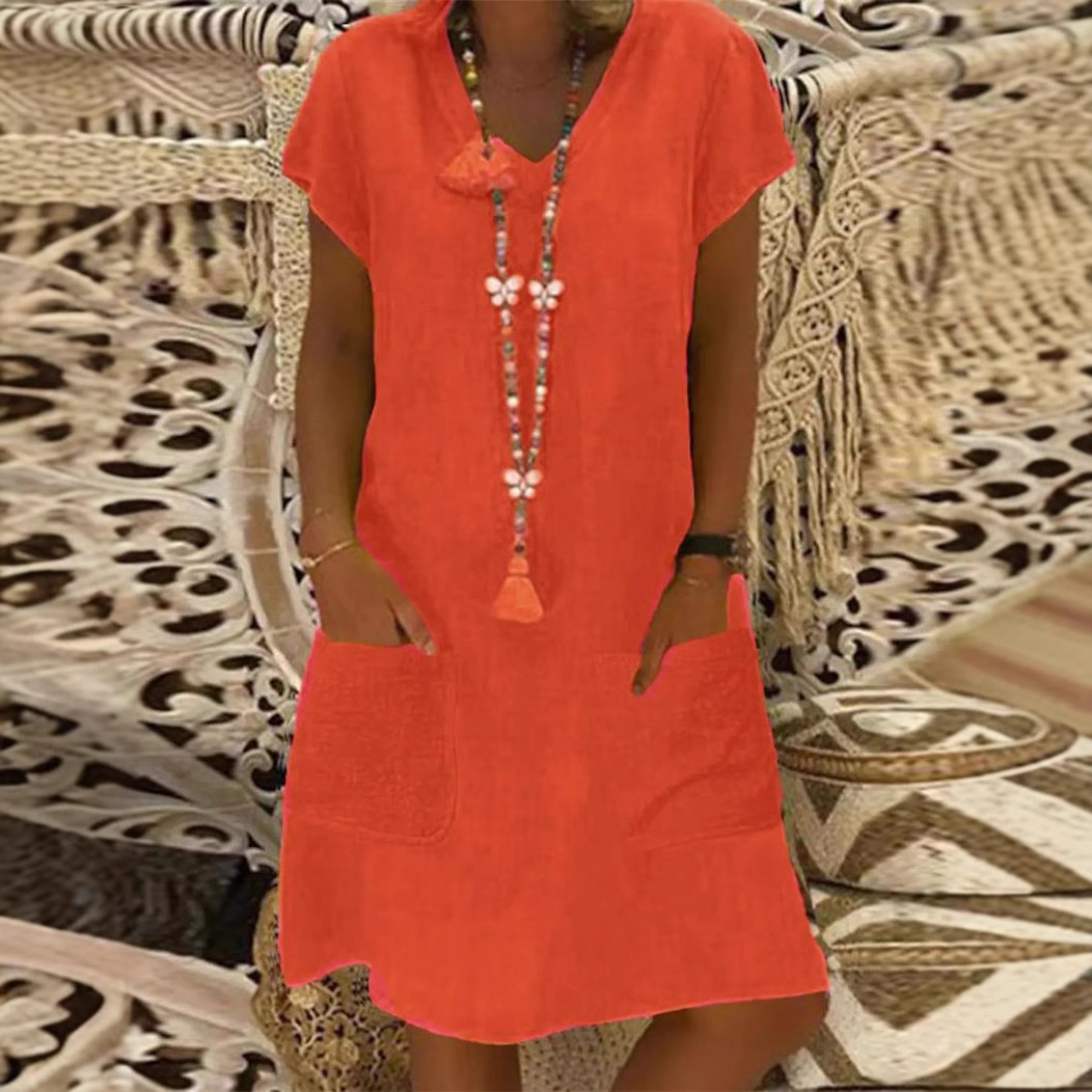 2025년 유럽 및 미국 여름 유행 위시, 알리익스프레스, 아마존, 독립 웹사이트용 반팔 브이넥 포켓 면마 원피스