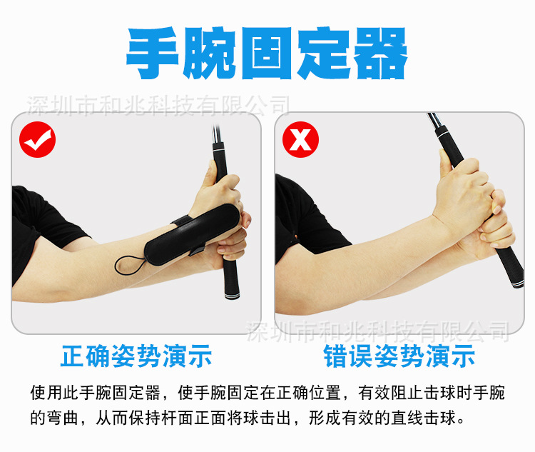 使用此手腕固定器,使手腕固定在正确位置,有效阻止击球时手腕 的弯曲,从而保持杆面正面将球击出,形成有效的