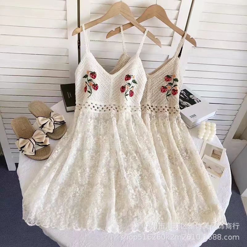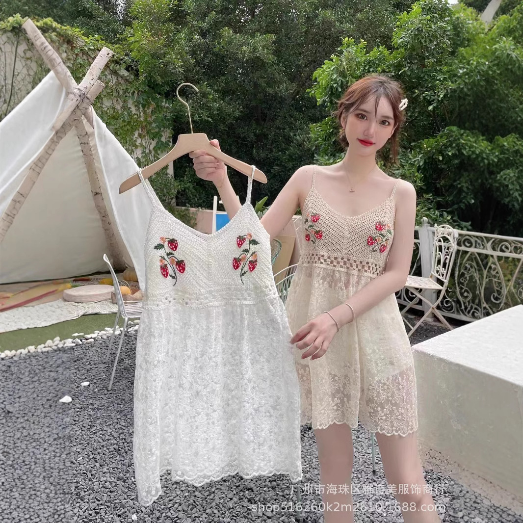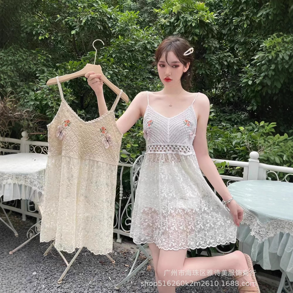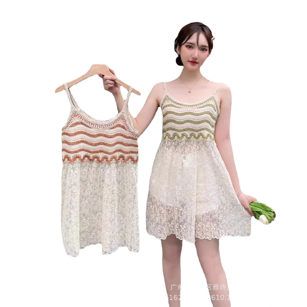 부드러운 스타일 달콤한 V 넥 니트 자수 조끼 홀터 스커트 해변 휴가 비치 스커트 스티치 메쉬 짧은 스커트 여성용