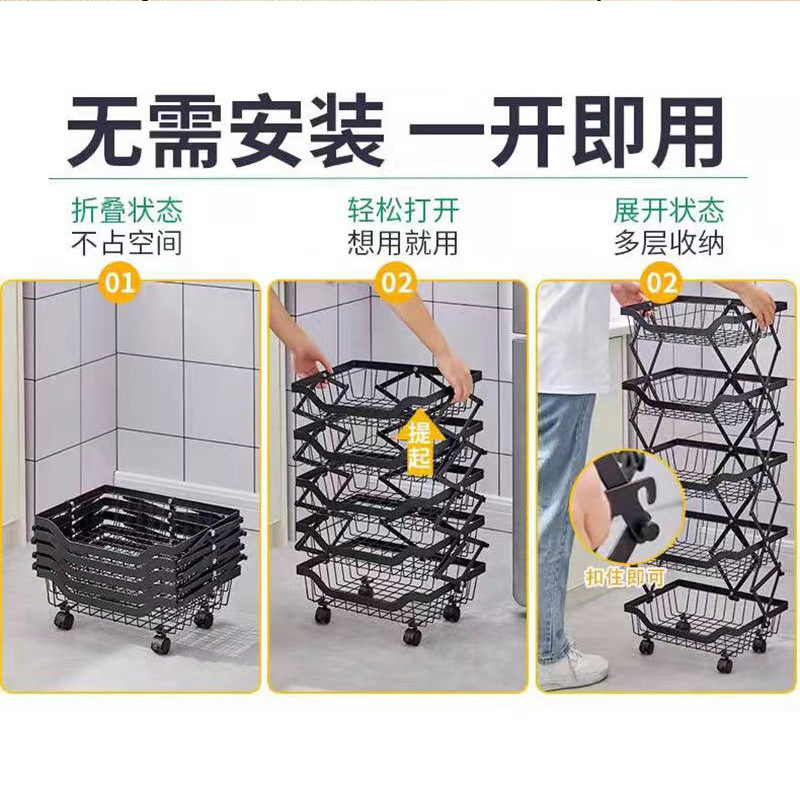 가정용 바닥 스탠딩 회전 다층 주방 수납 랙 접이식 블랙 탄소강 과일 및 야채 조미료 보관 랙