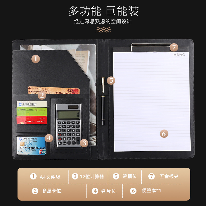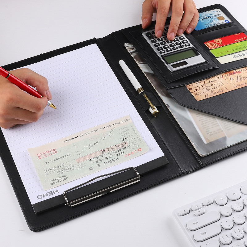 계산기 비즈니스 오피스 토크 싱글 클립 가죽 관리자 클립 룸이있는 A4 다기능 폴더 로고 추가 가능