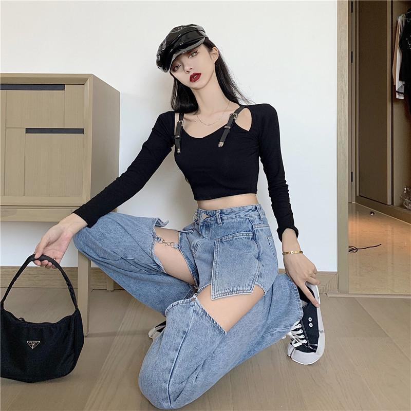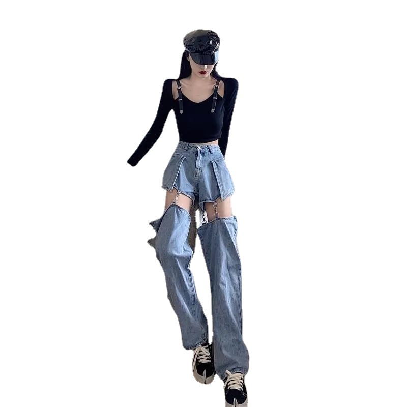 청바지 여자의 여름 새로운 느슨한 하이 웨이스트 슬리밍 와이드 레그 스트레이트 롱 팬츠 디자인 감각 분리형 트렌디 팬츠