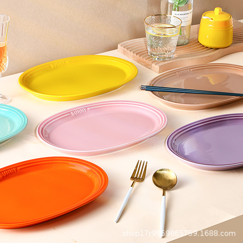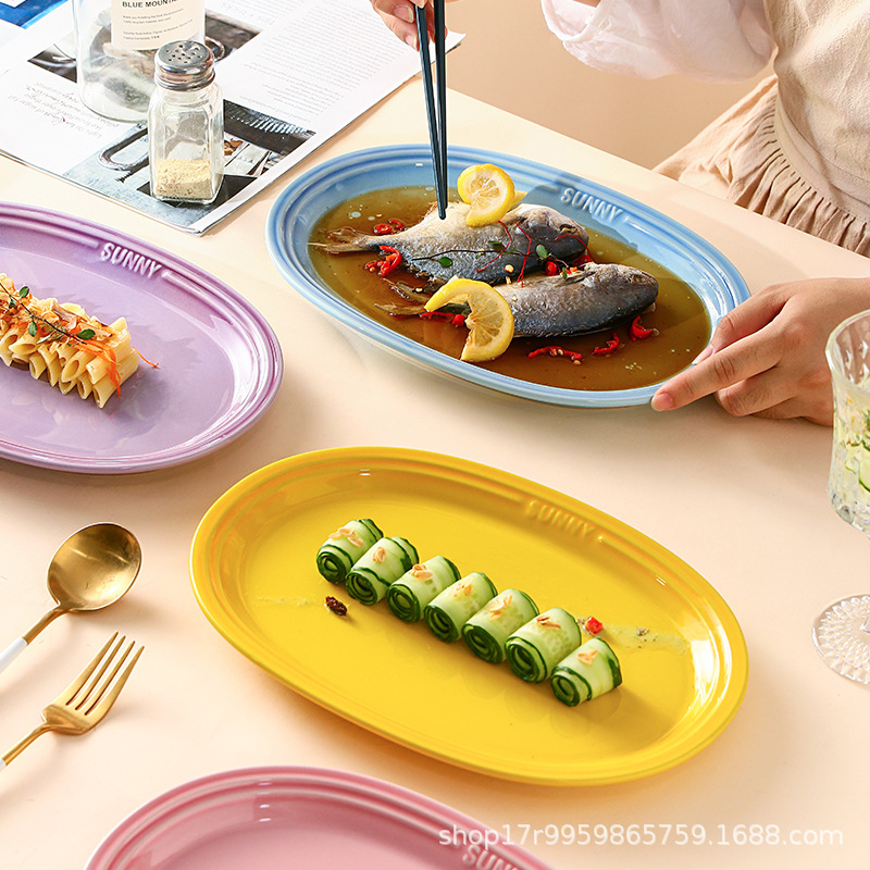 프랑스 신상품 레인보우 타원형 생선 접시 북유럽 가정용 접시 접시 찜 상자 찐 생선 접시 창조적 인 서양 접시