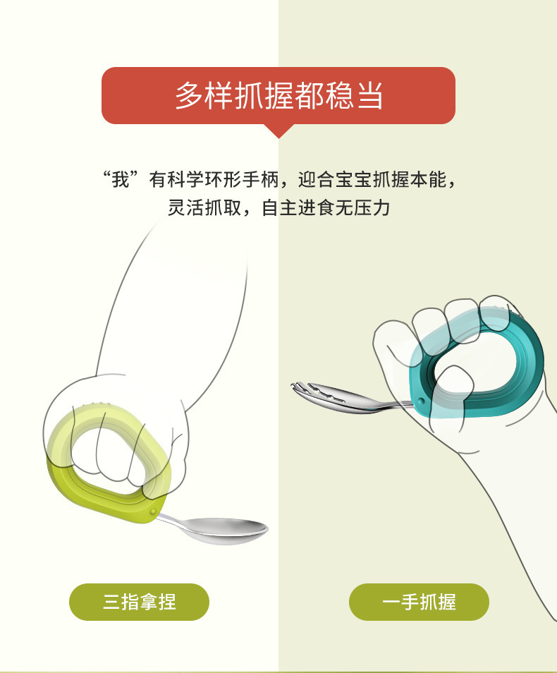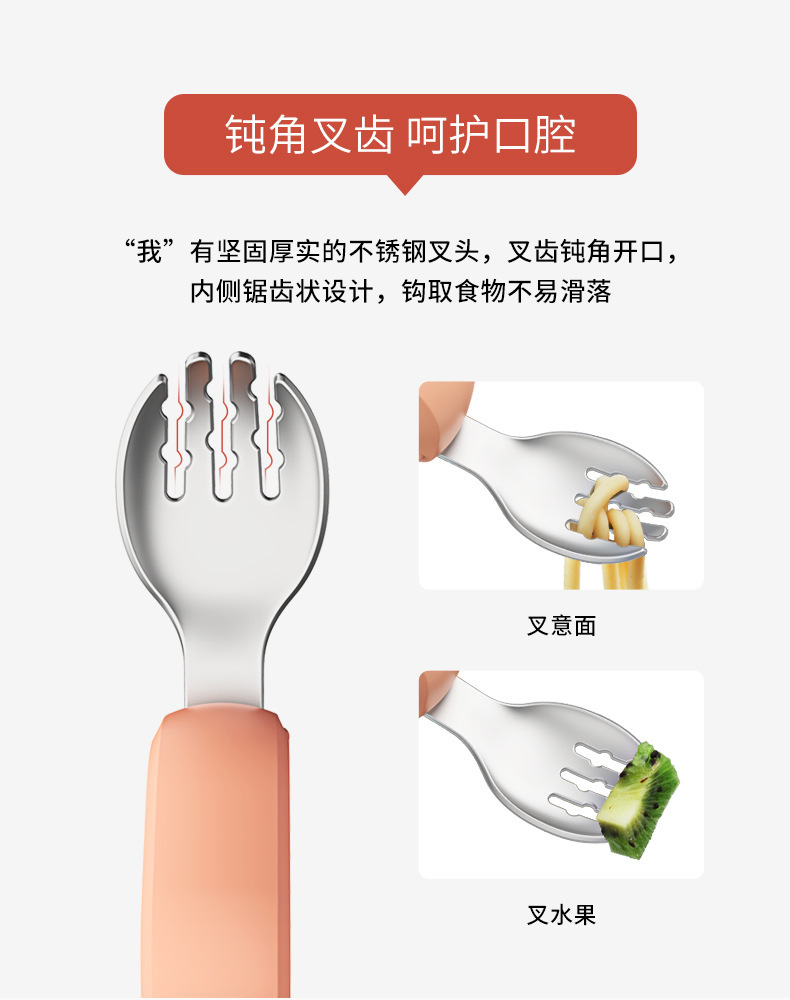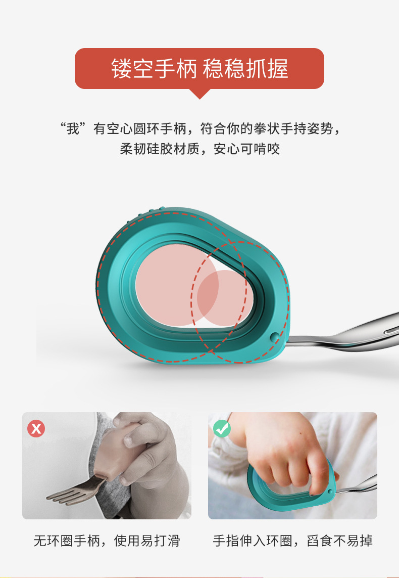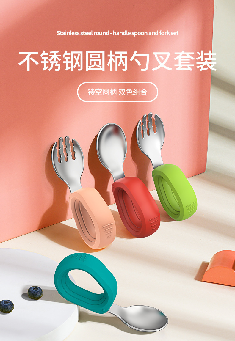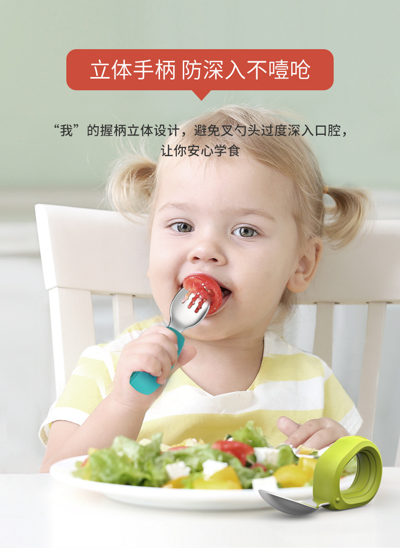 허궈 베이비 식기 스테인리스 스틸 어린이 식사 훈련용 스푼 유아용 이유식 실리콘 짧은 손잡이 포크 스푼