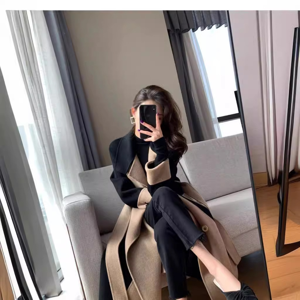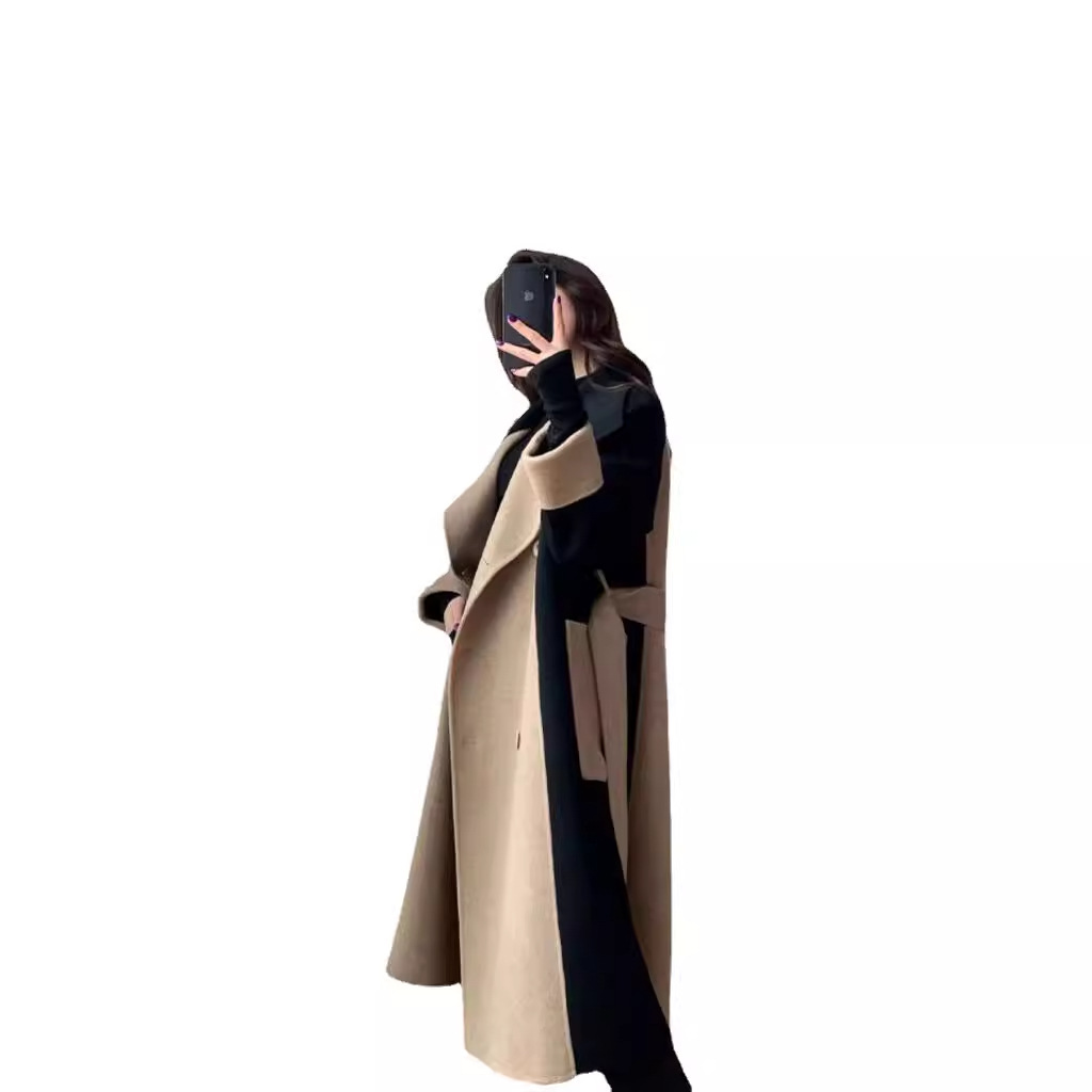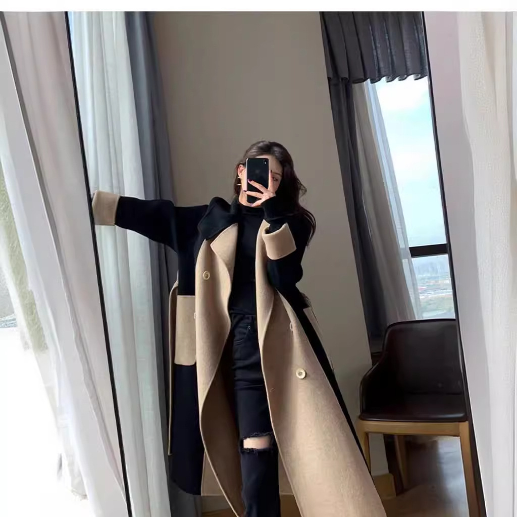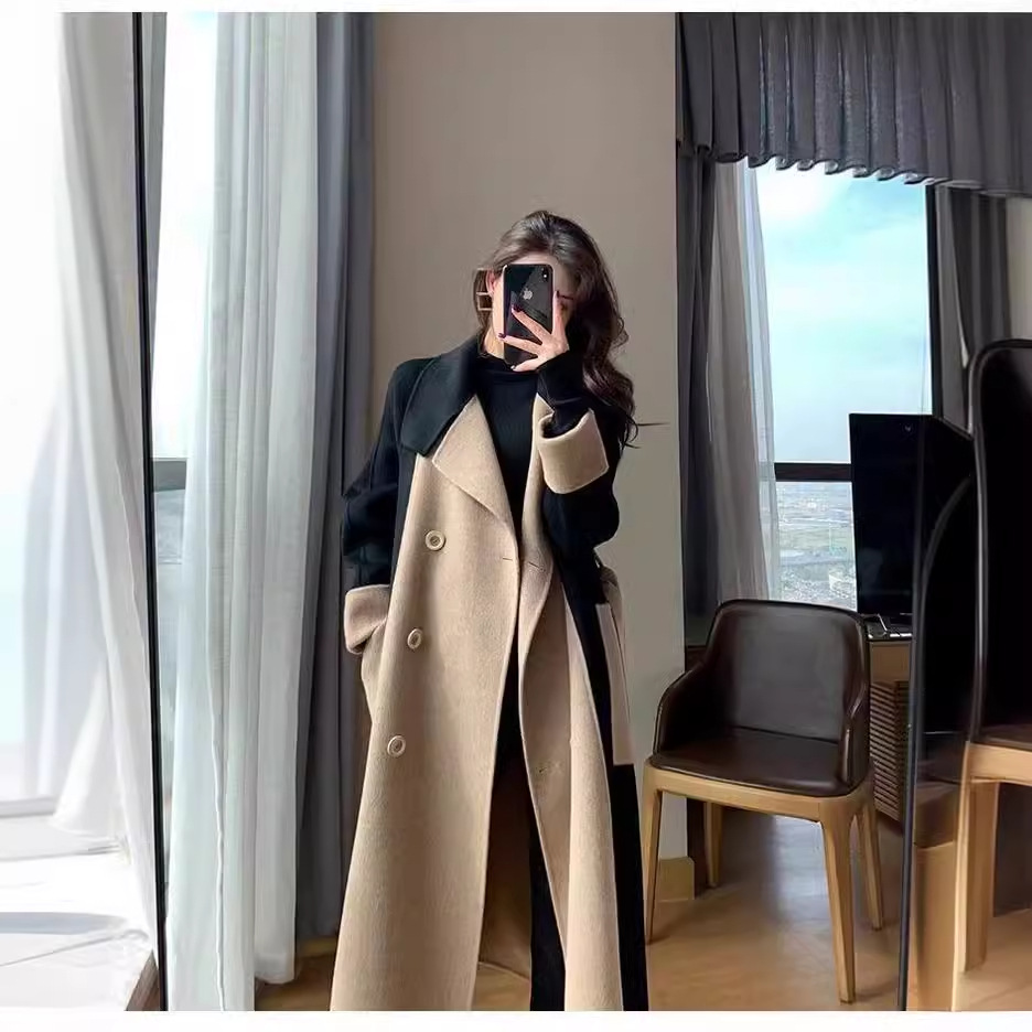 모직 코트 여성 긴 2025 겨울 새로운 양면 벨벳 울 컬러 매칭 햅번 스타일 슬림 코트