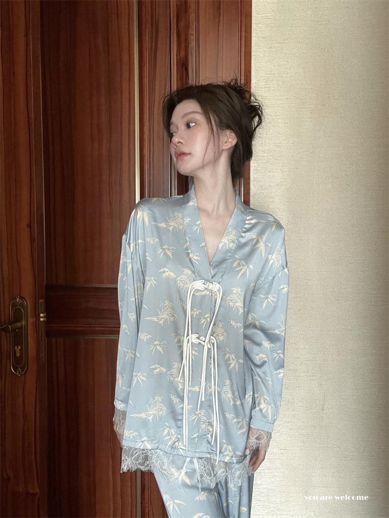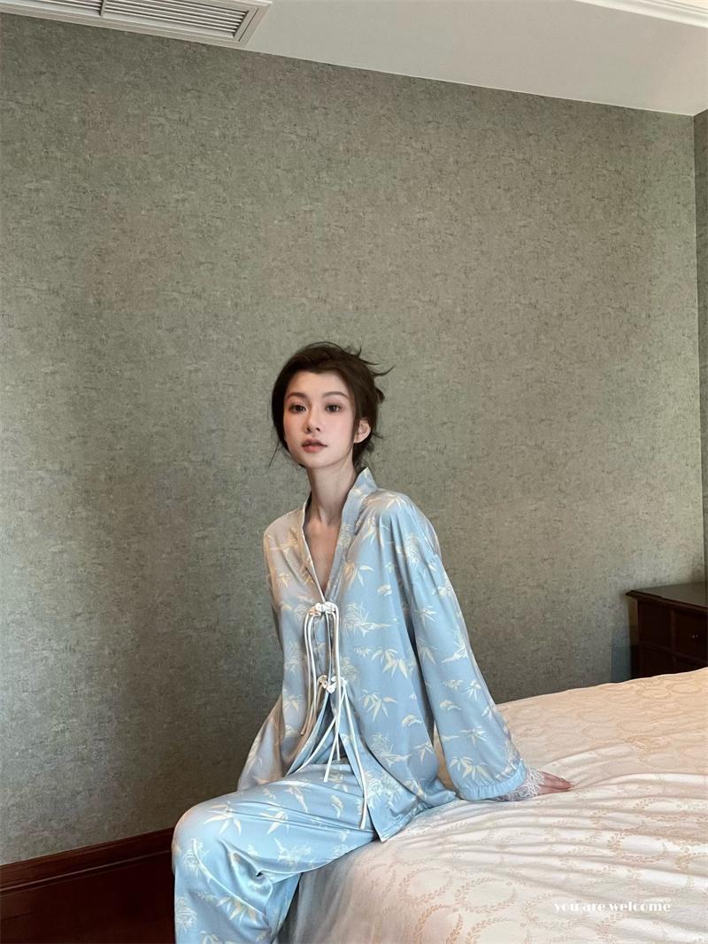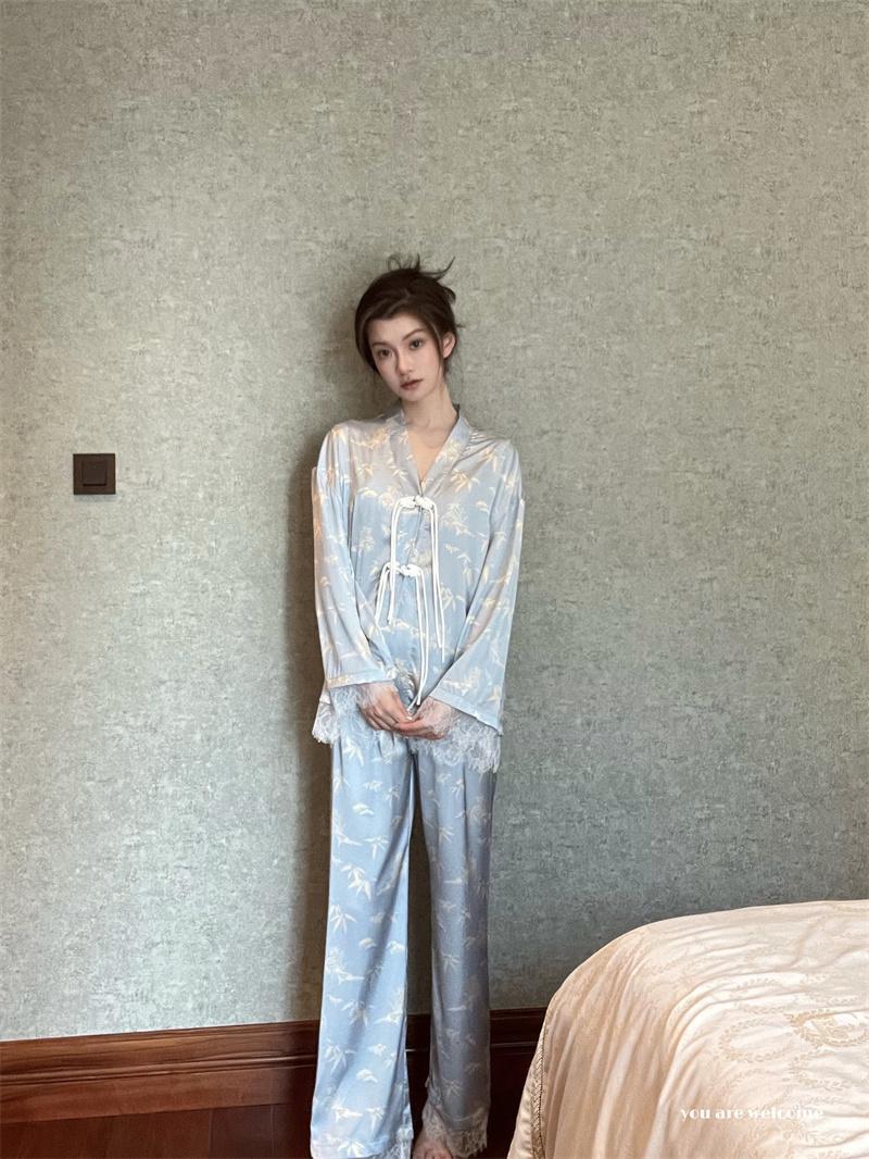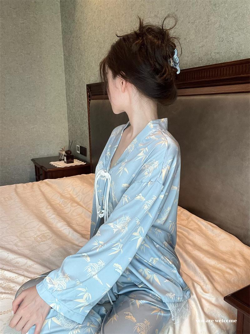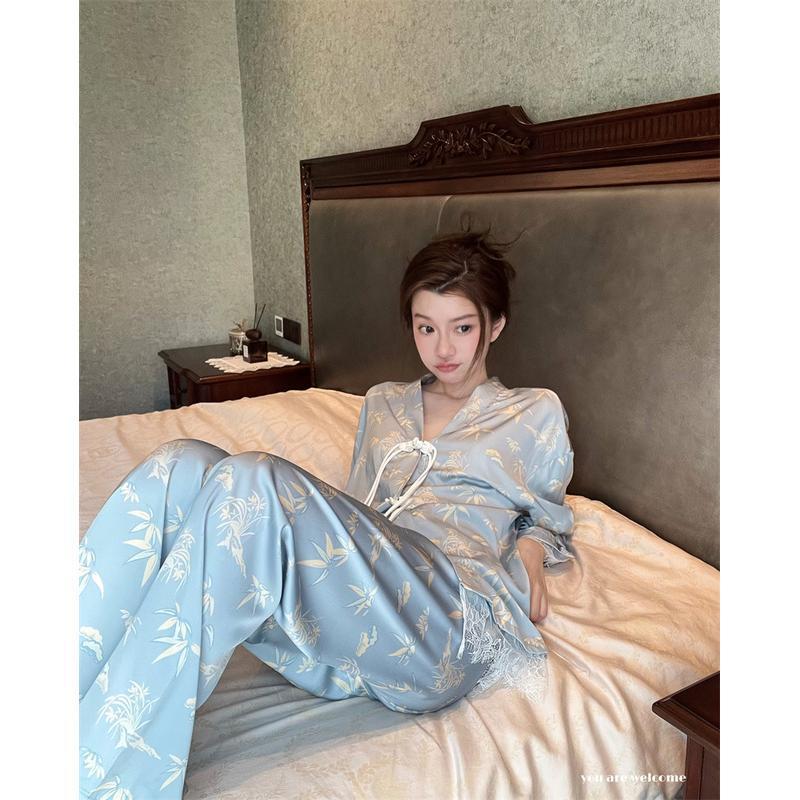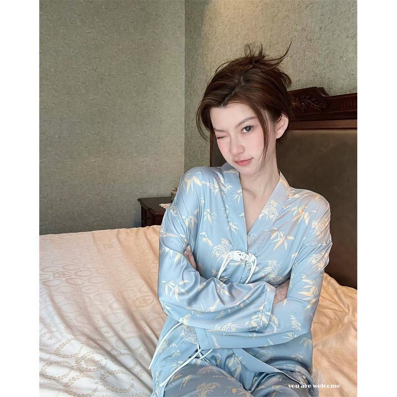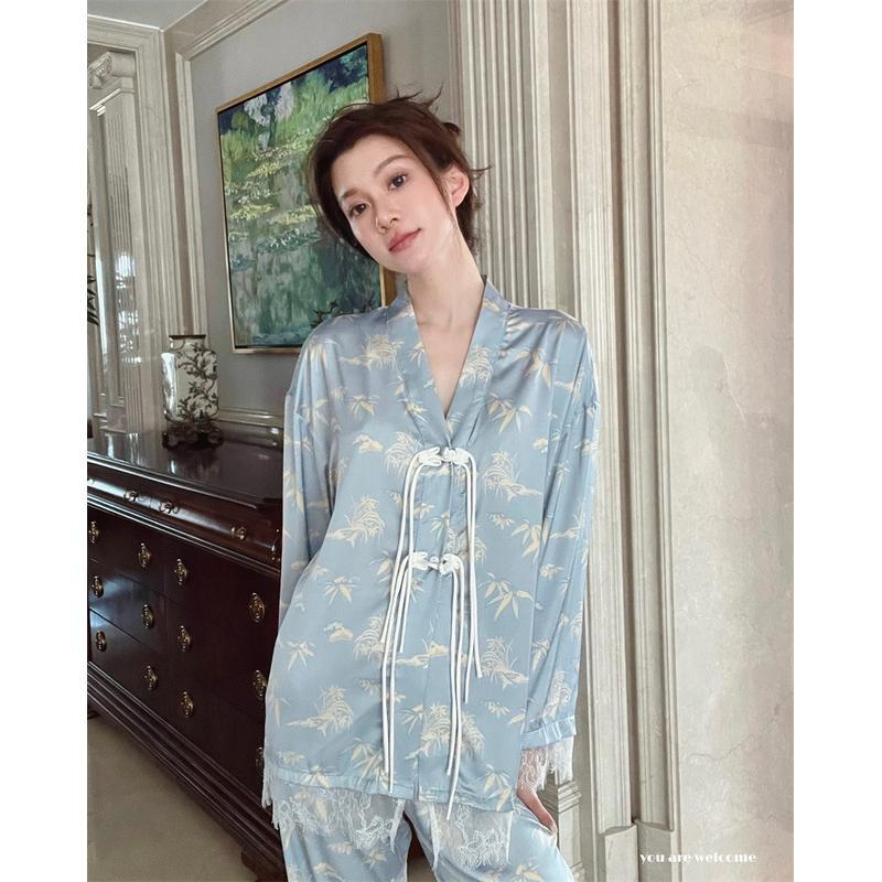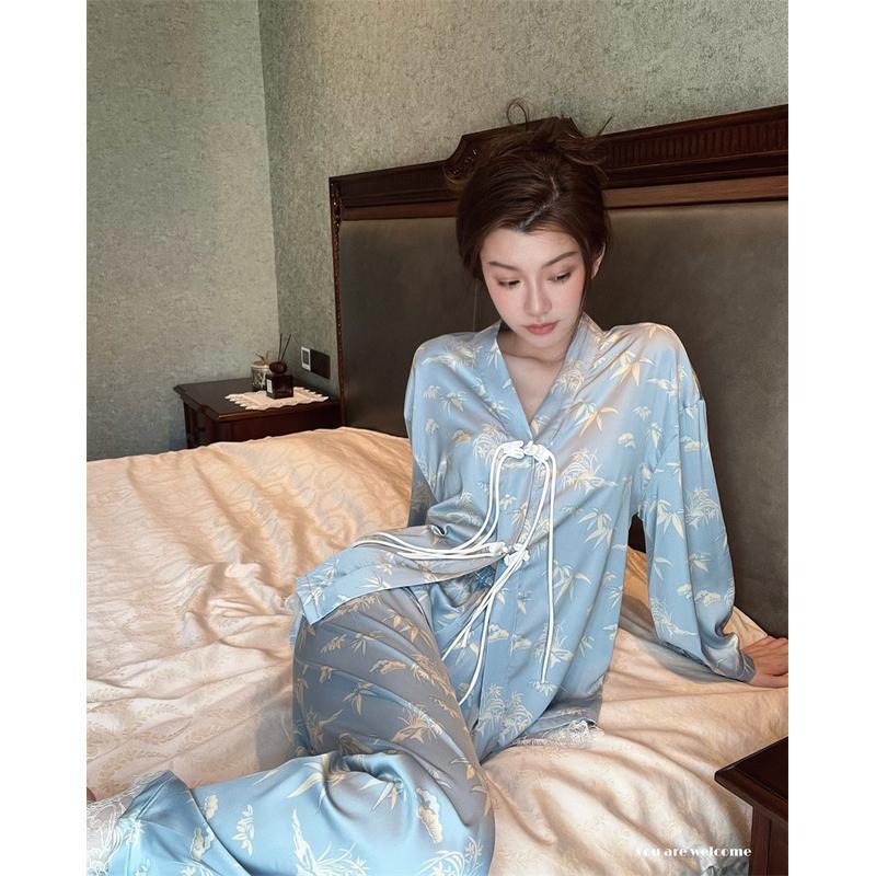 새로운 중국 스타일 국가 스타일 아이스 실크 잠옷 여자의 봄과 가을 고급 빛 럭셔리 사교계 우아한 블루 실크 투피스 세트