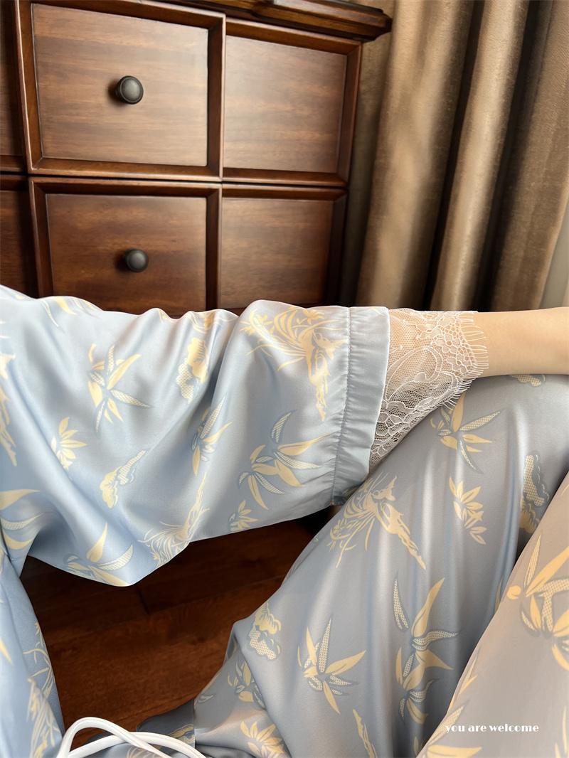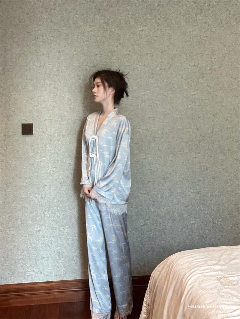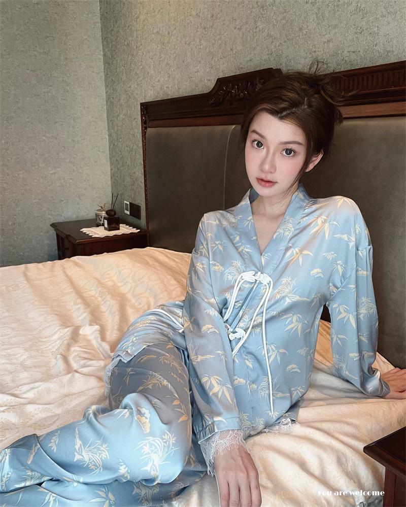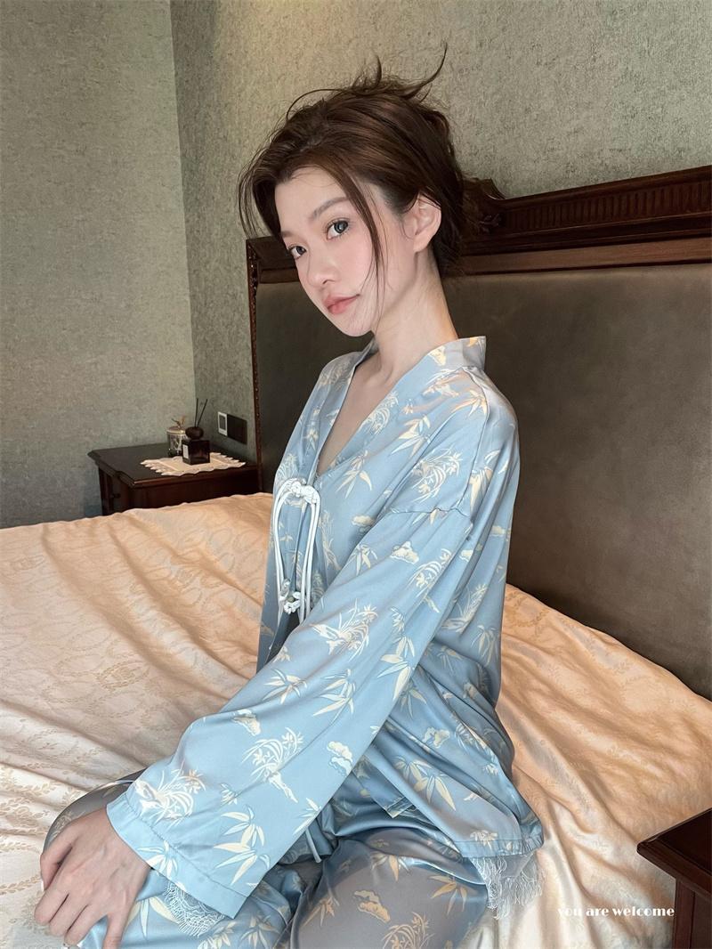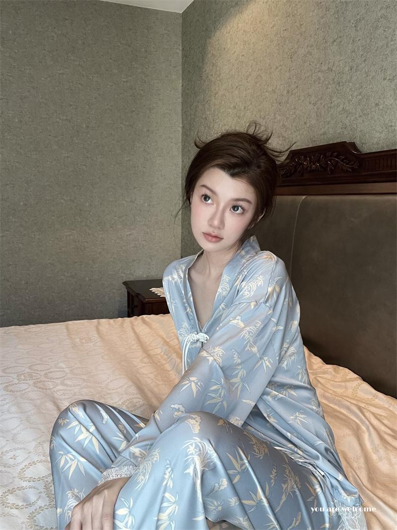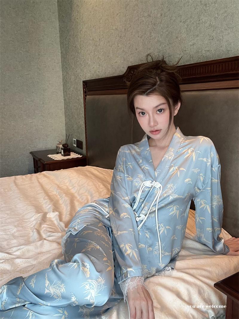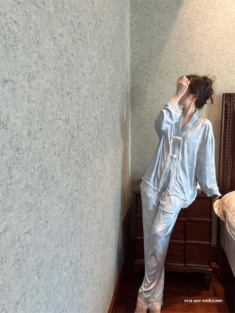 새로운 중국 스타일 국가 스타일 아이스 실크 잠옷 여자의 봄과 가을 고급 빛 럭셔리 사교계 우아한 블루 실크 투피스 세트