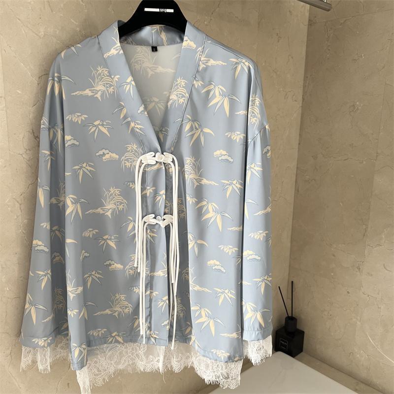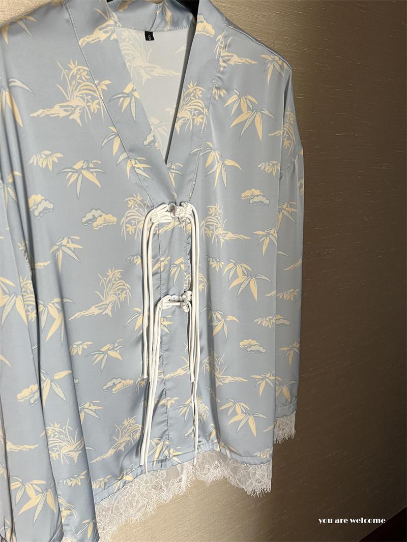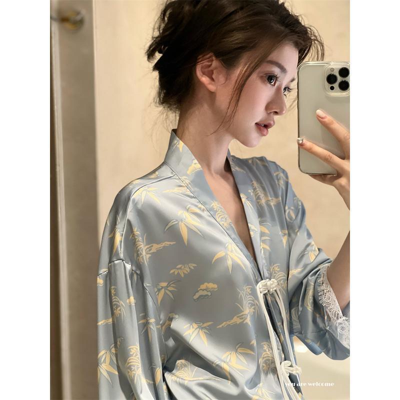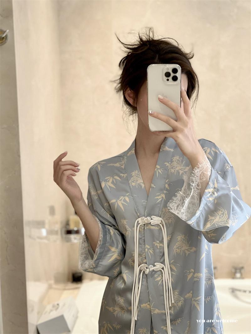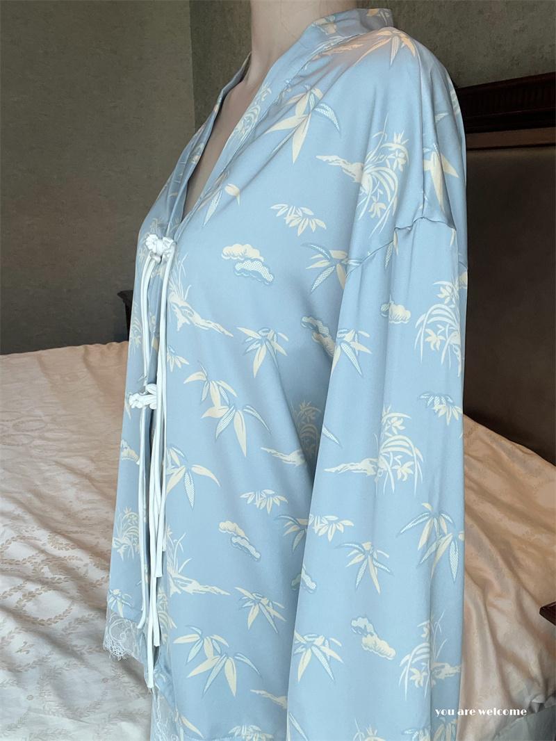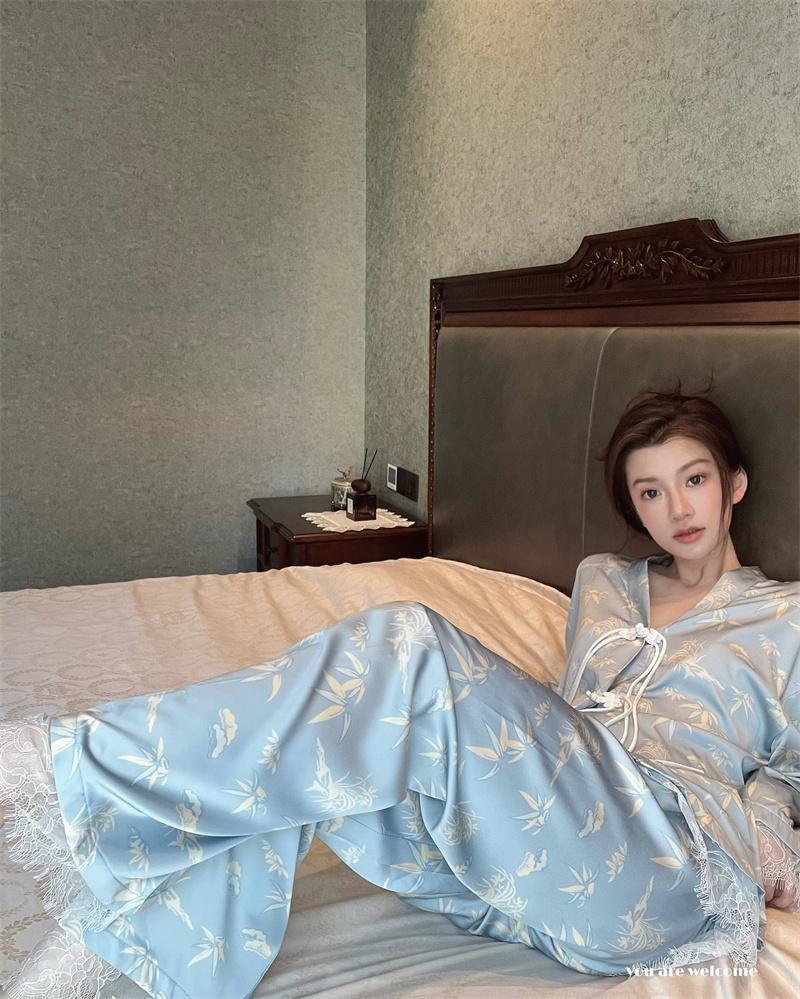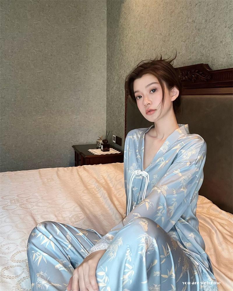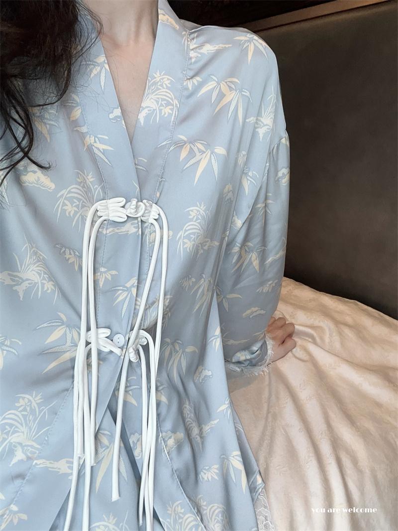 새로운 중국 스타일 국가 스타일 아이스 실크 잠옷 여자의 봄과 가을 고급 빛 럭셔리 사교계 우아한 블루 실크 투피스 세트