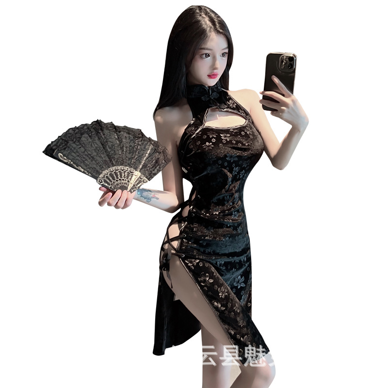 매력적인 토끼 섹시 속옷 섹시 빈티지 벨벳 슬림 핏 잠옷 사이드 스트랩 유혹 치파오 유니폼 세트 2374