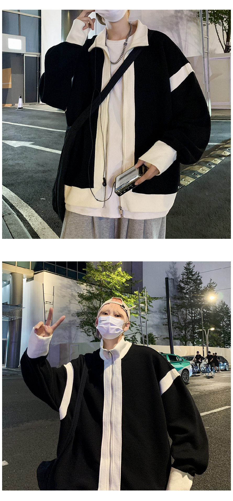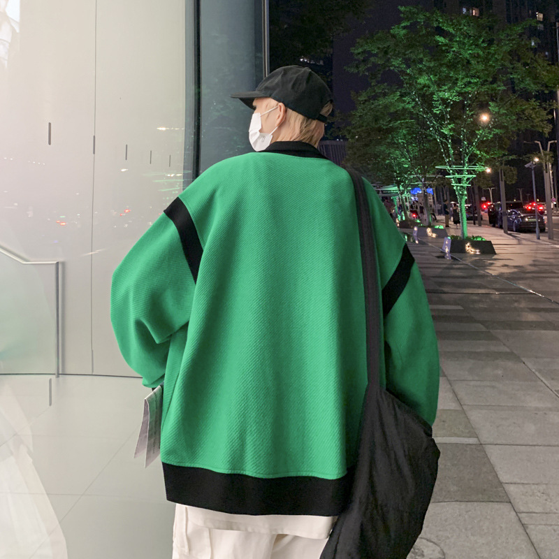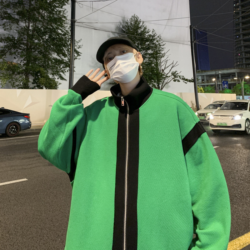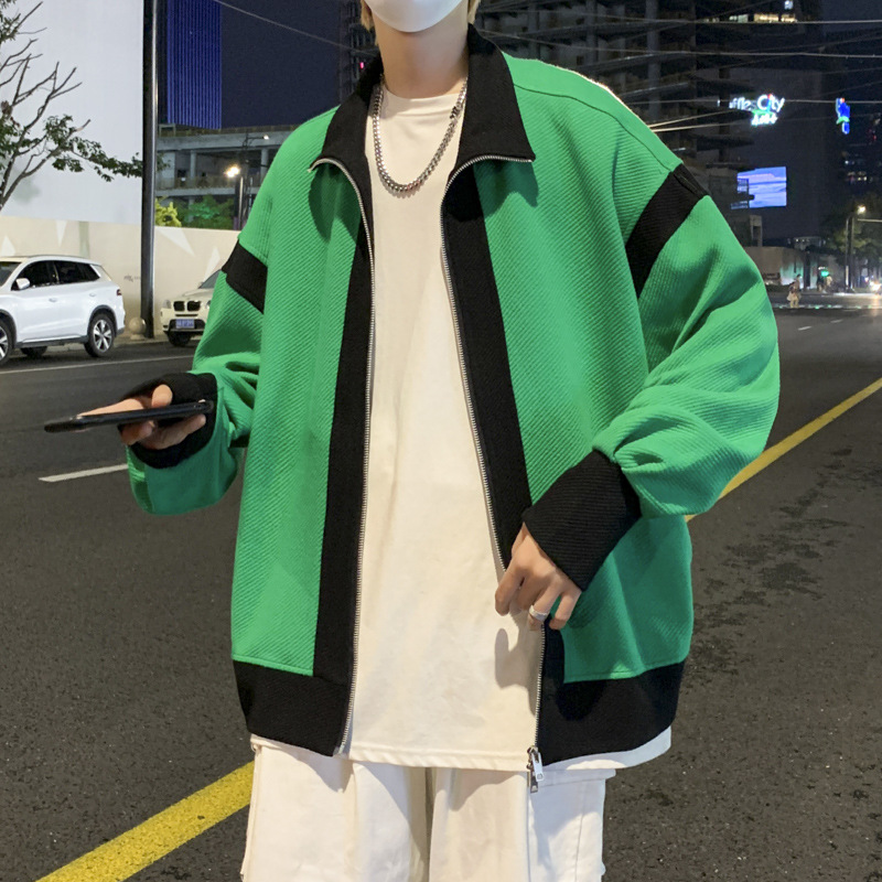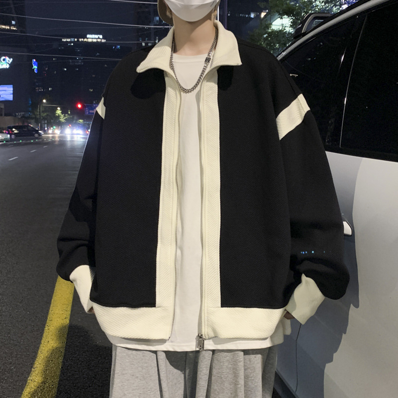 더블 지퍼 재킷 남자의 가을 느슨한 유행 브랜드 홍콩 스타일 스티칭 컬러 매칭 재킷 Ruffian 잘 생긴 캐주얼 니트 탑