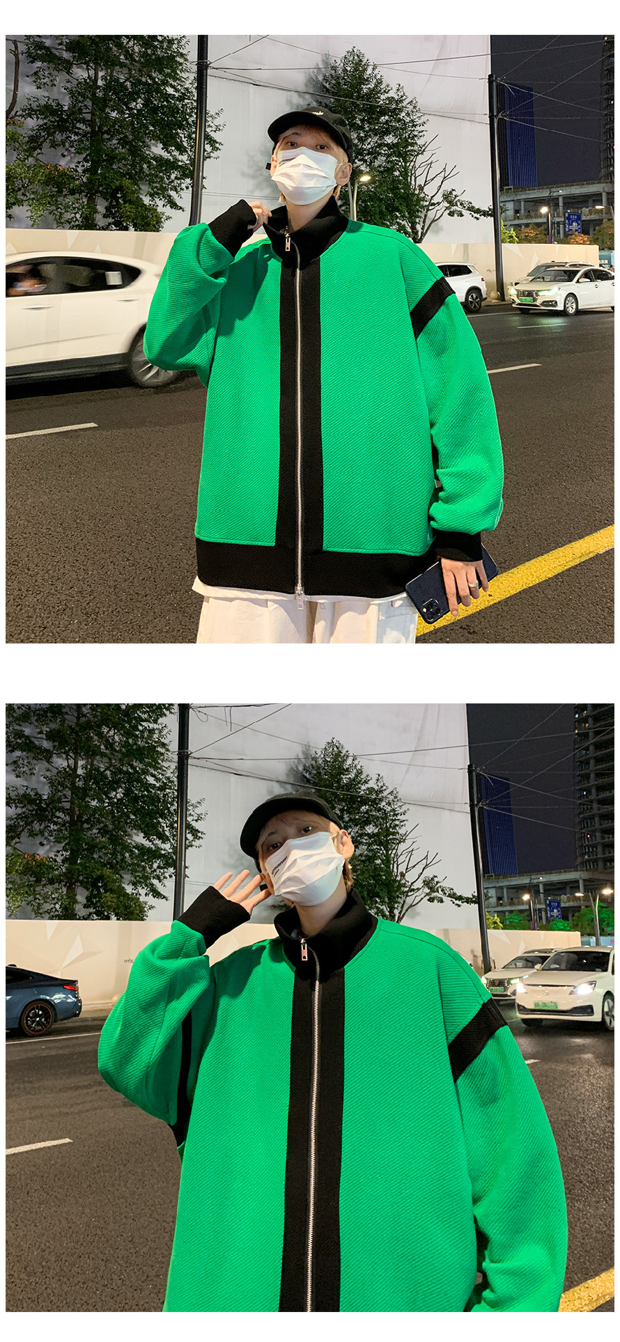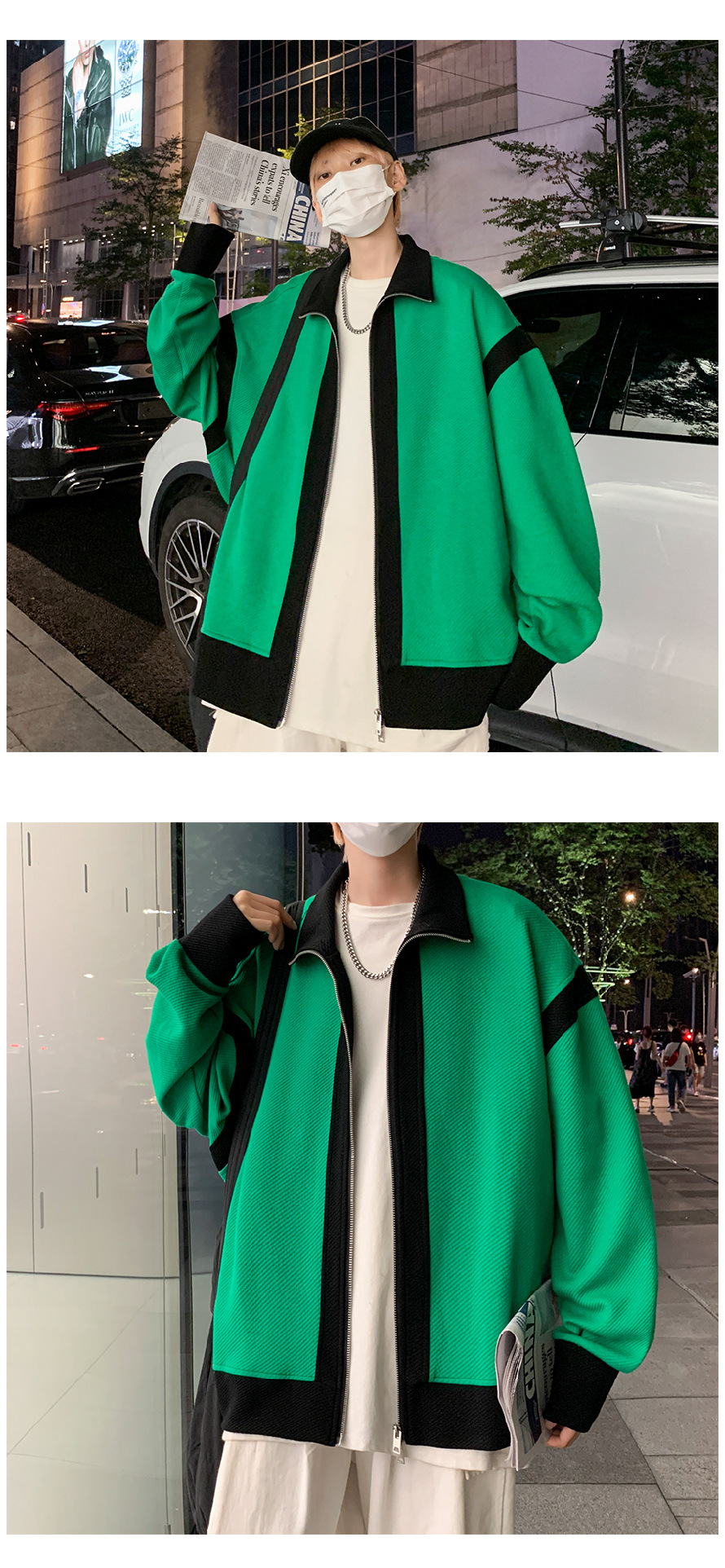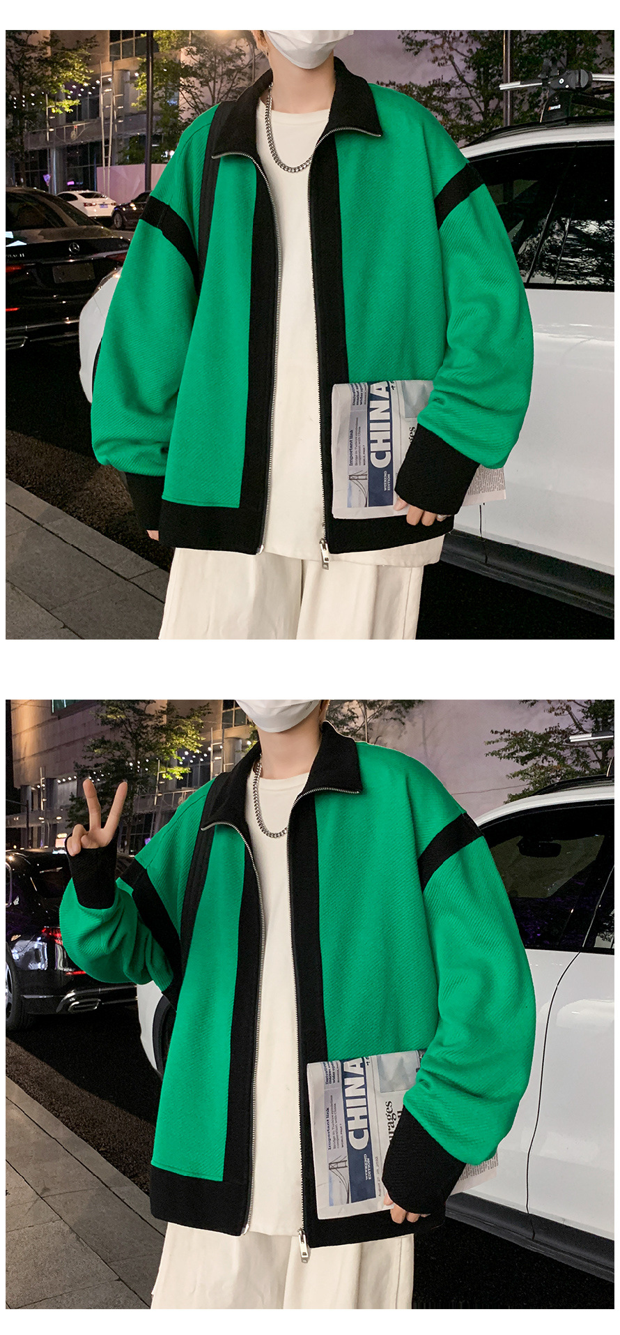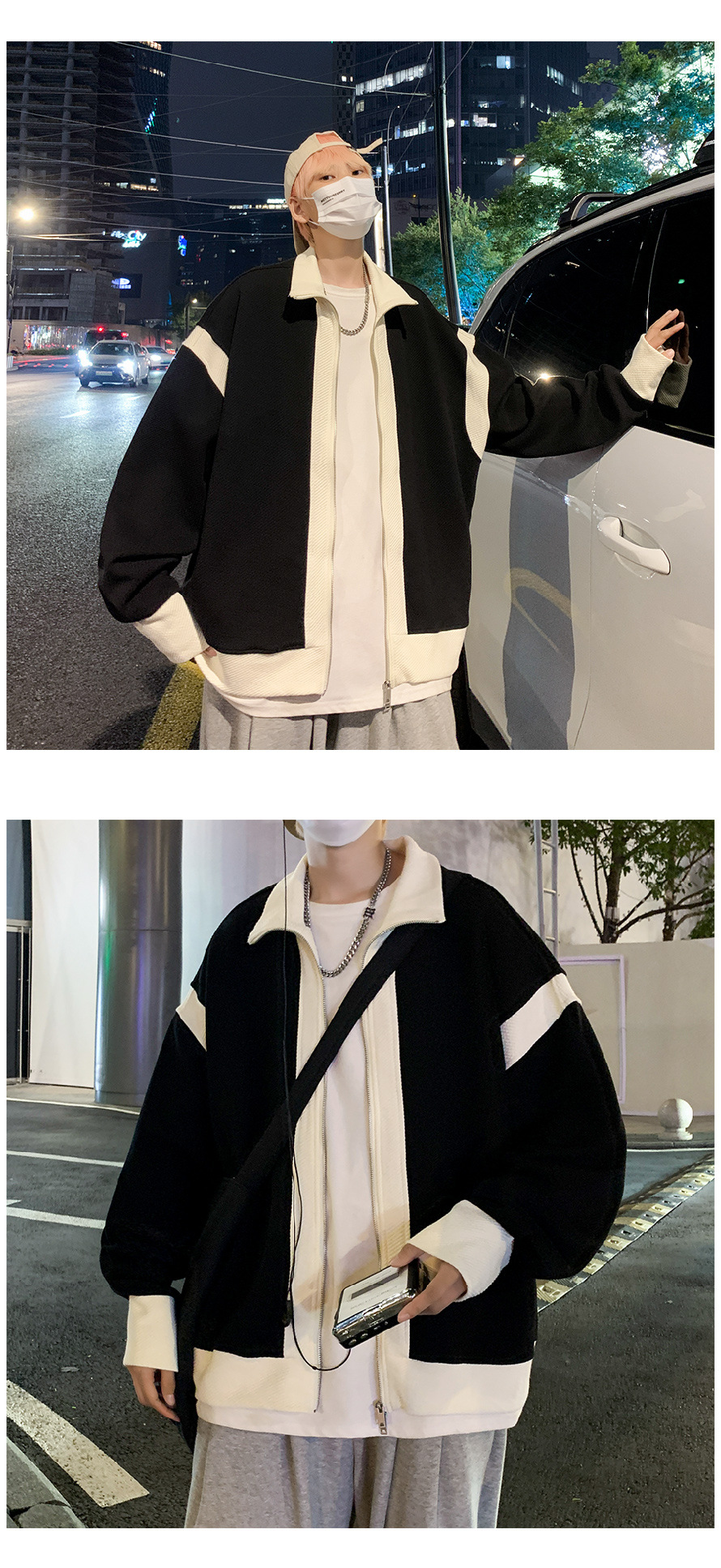 더블 지퍼 재킷 남자의 가을 느슨한 유행 브랜드 홍콩 스타일 스티칭 컬러 매칭 재킷 Ruffian 잘 생긴 캐주얼 니트 탑