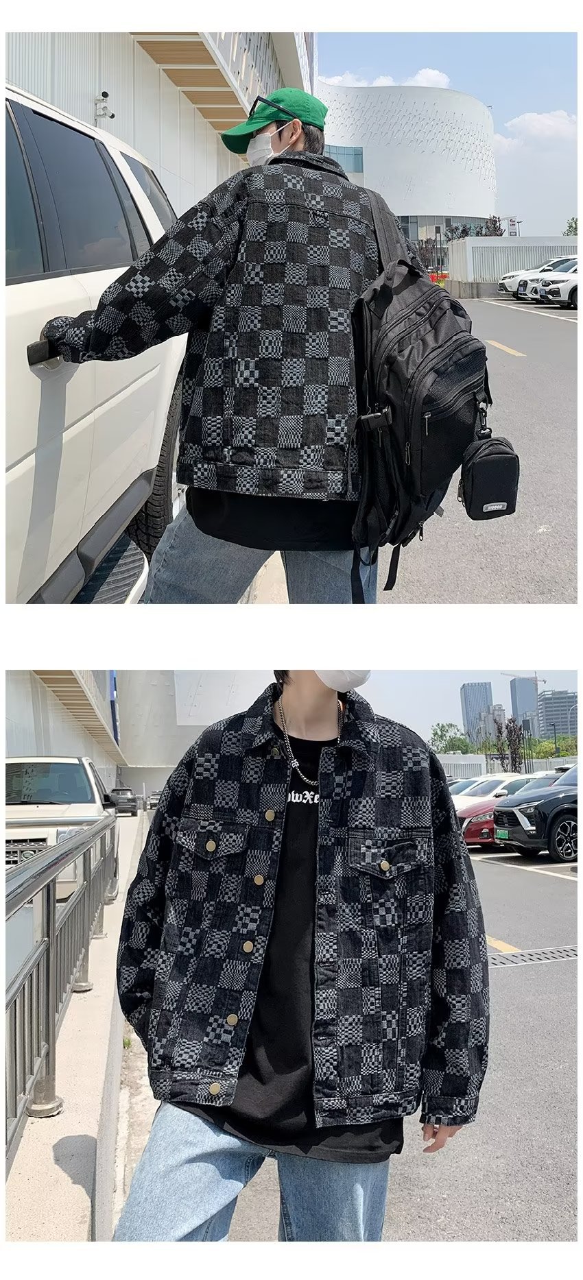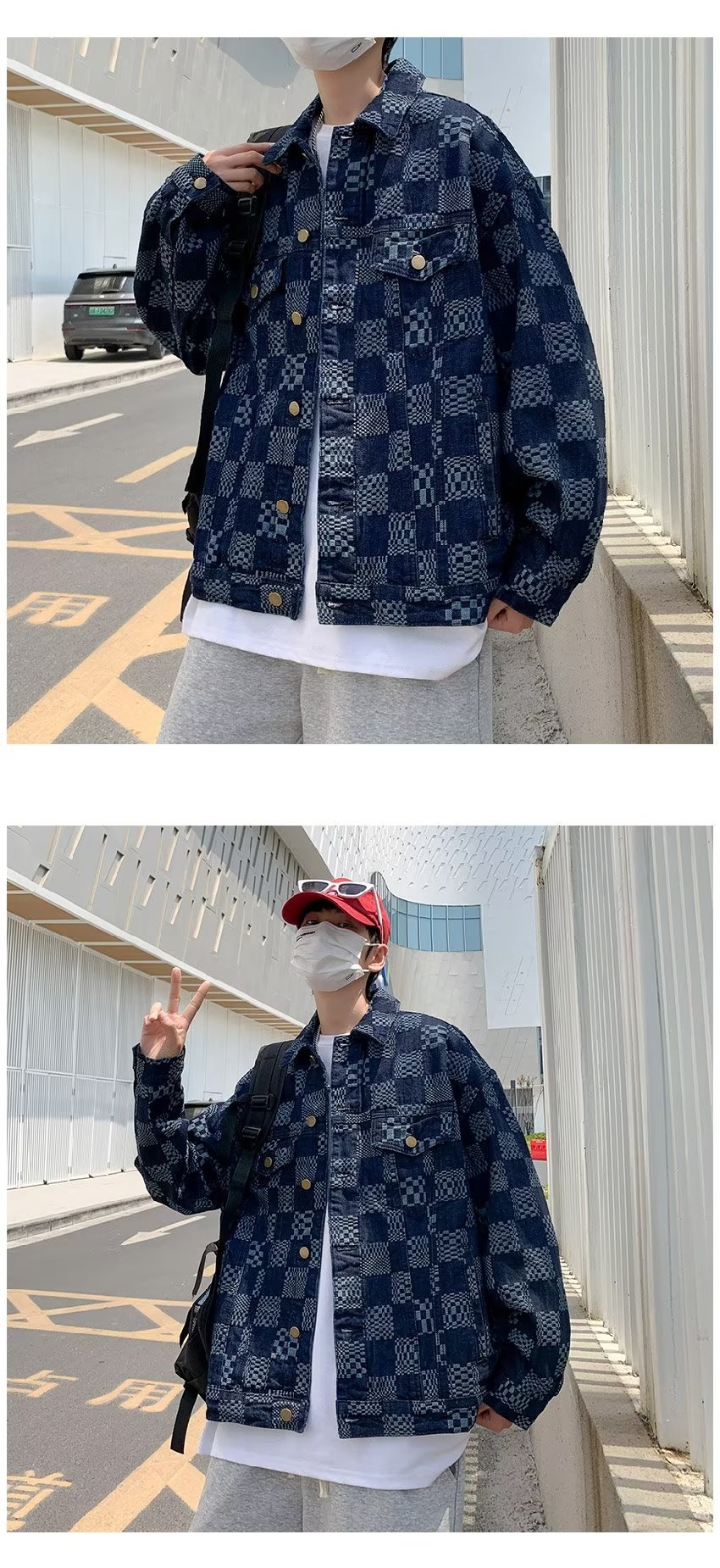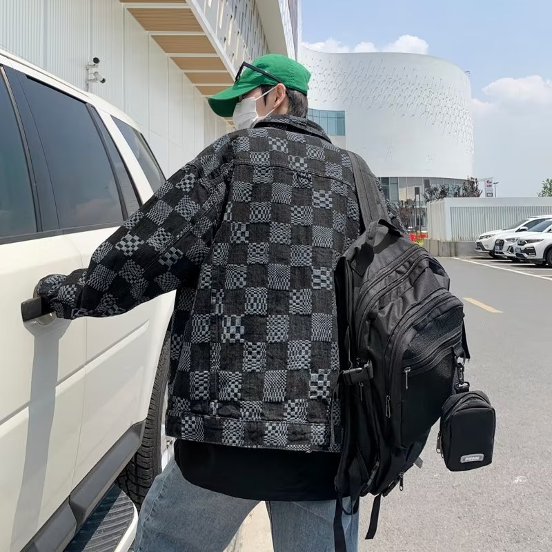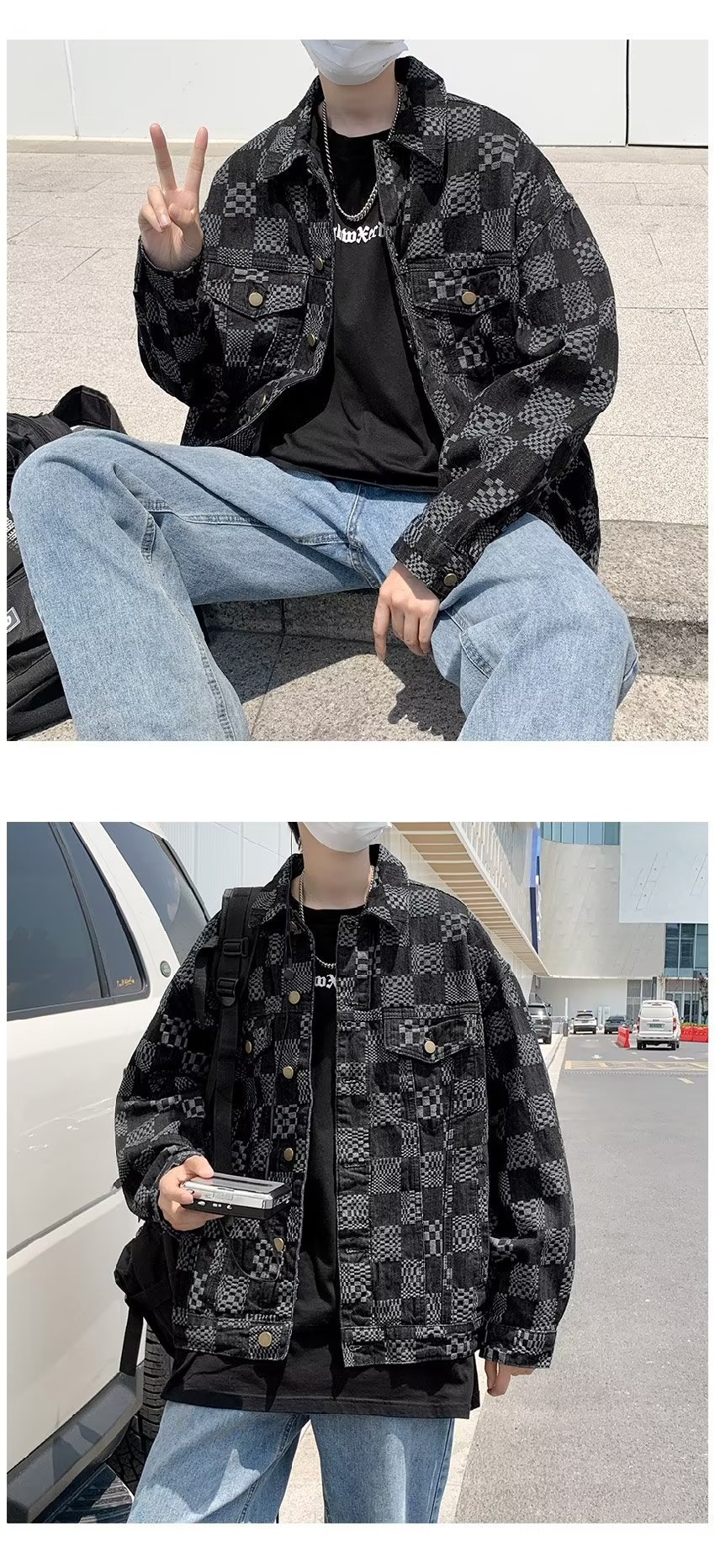 하이 엔드 감각 개인 자카드 데님 재킷 남자의 가을과 겨울 커플 남자와 여자의 느슨한 체스 판 격자 무늬 캐주얼 재킷 유행
