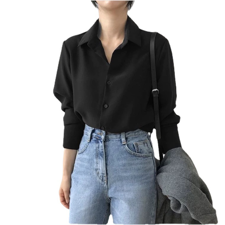 블랙 쉬폰 셔츠 여성용 느슨한 폴로 칼라 긴 소매 탑 전문 OL 단색 홍콩 스타일베이스 우아한 셔츠 여성