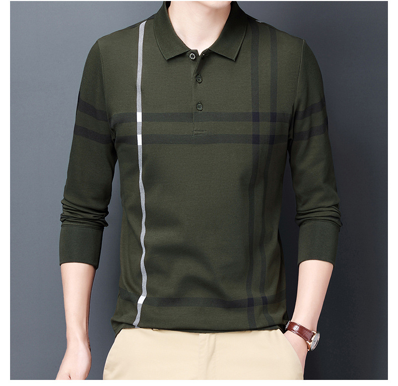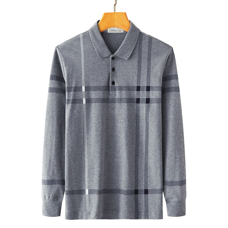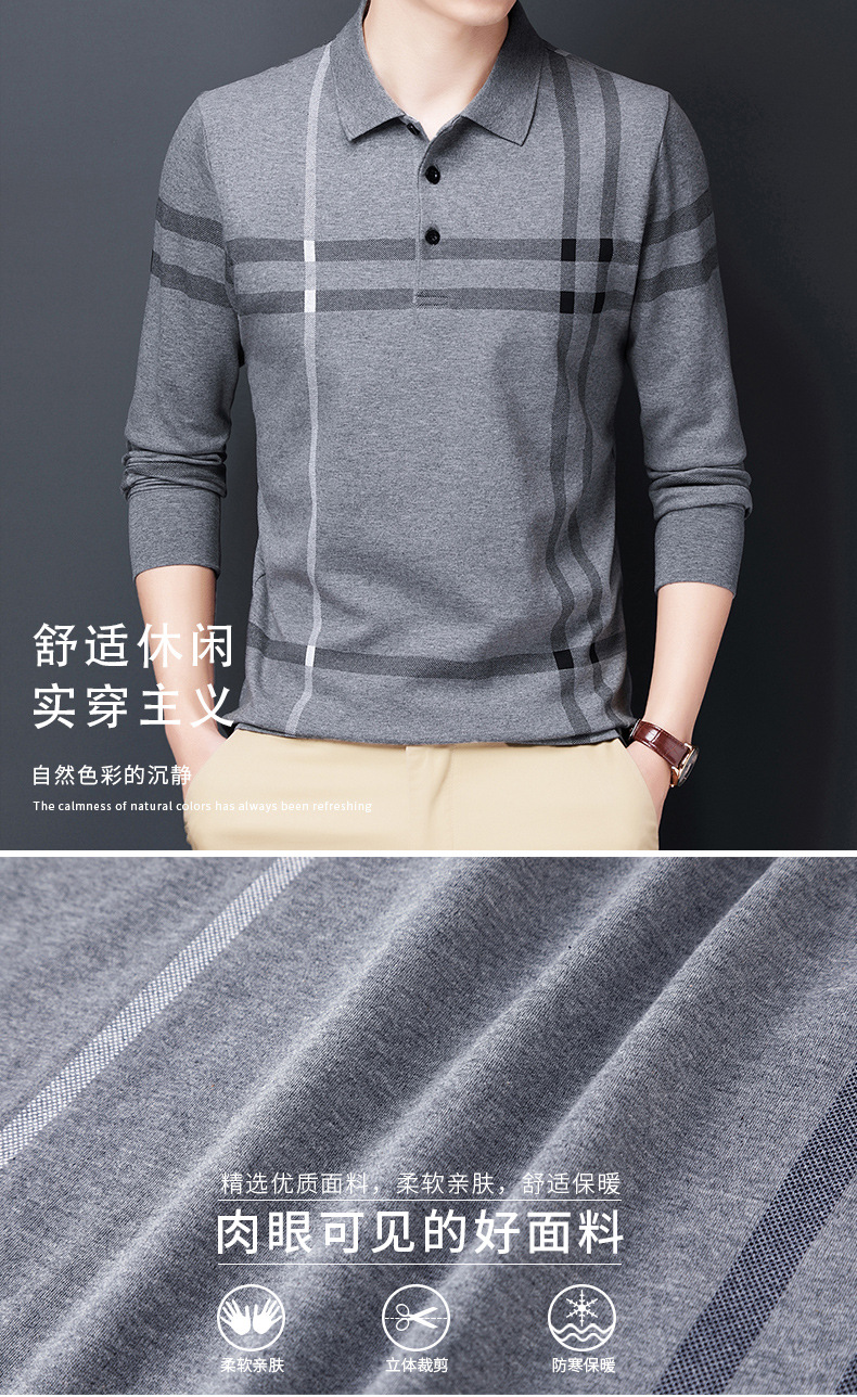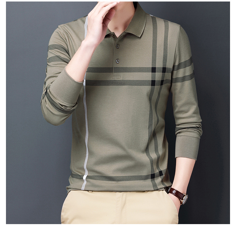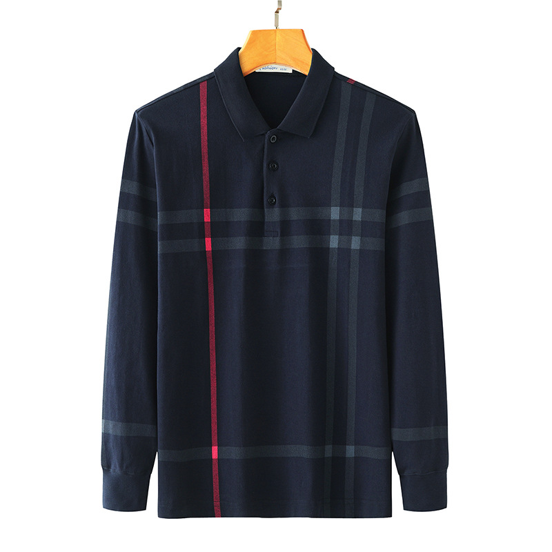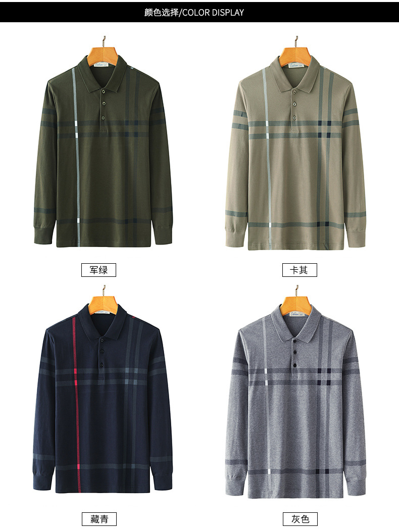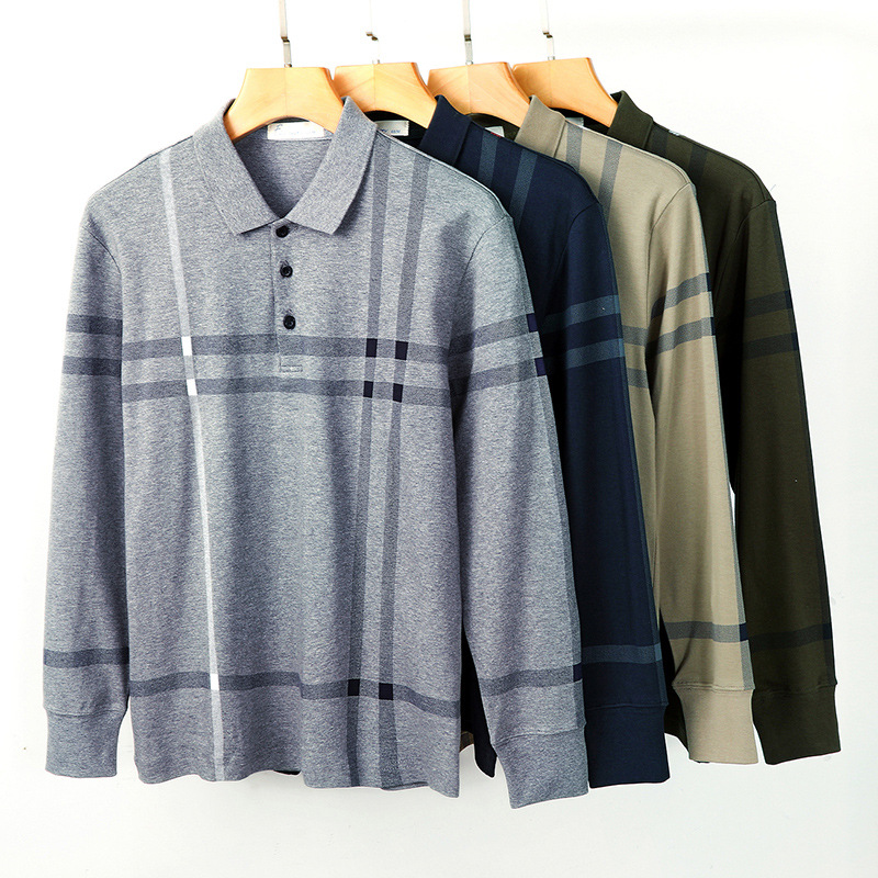 봄철 긴팔 순면 티셔츠 남성용 스트라이프 베이스 레이어 탑 루즈핏 캐주얼 라펠 카라 면 티셔츠 중년 남성 아메리칸 스타일