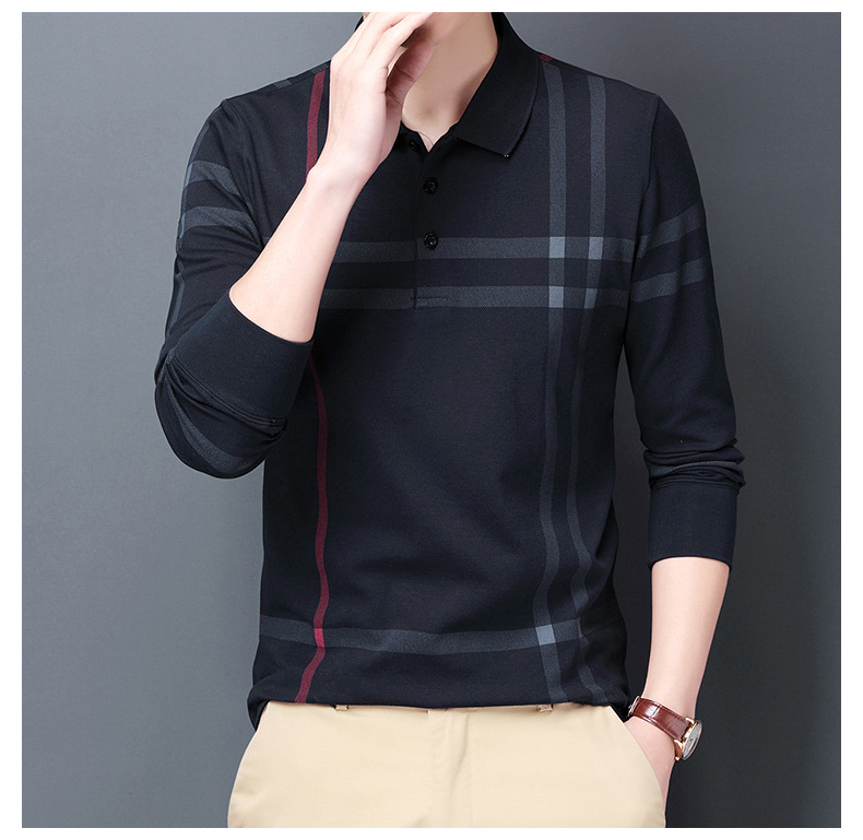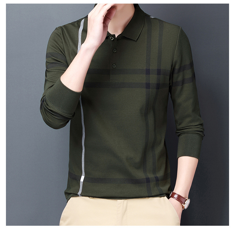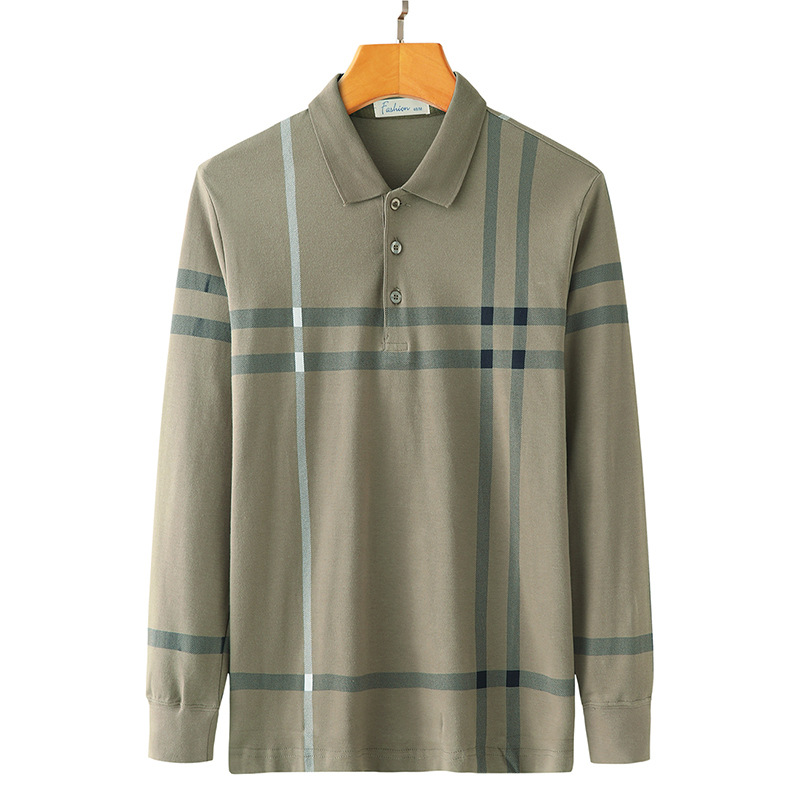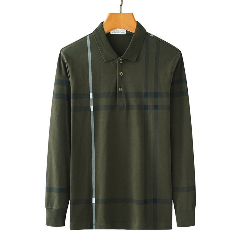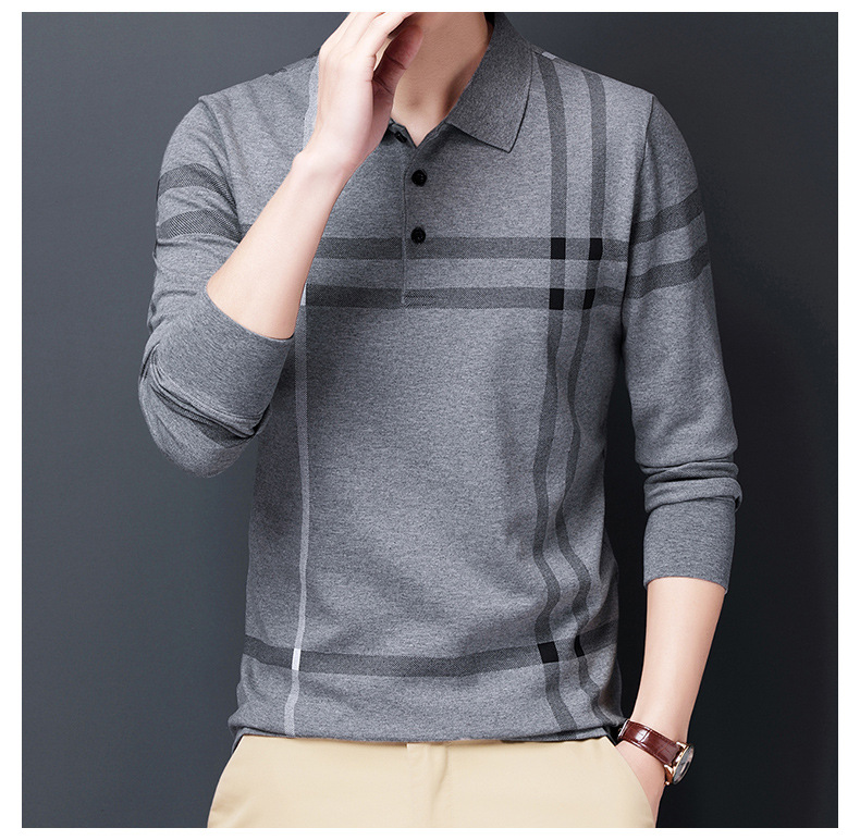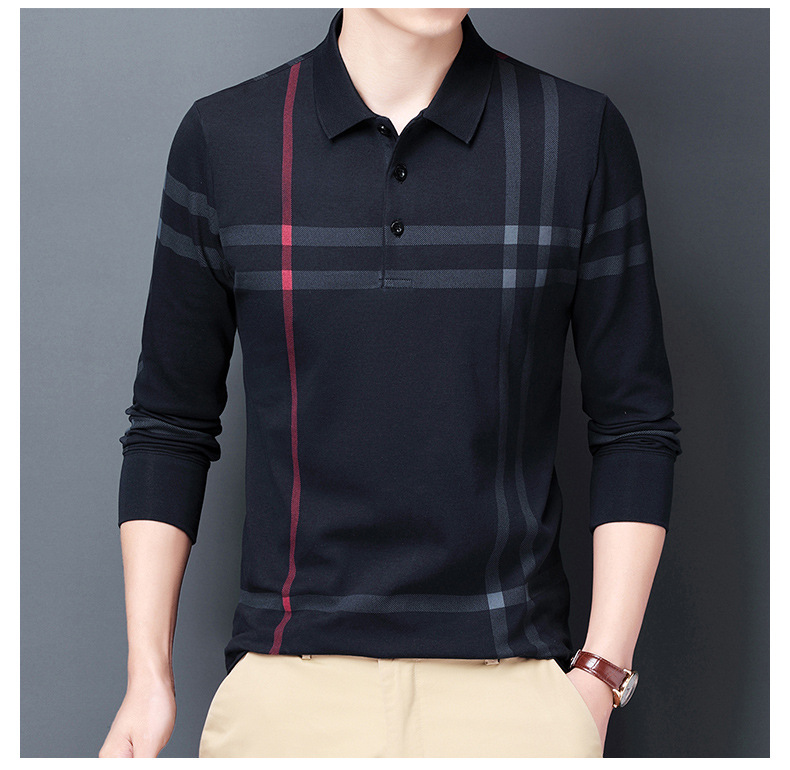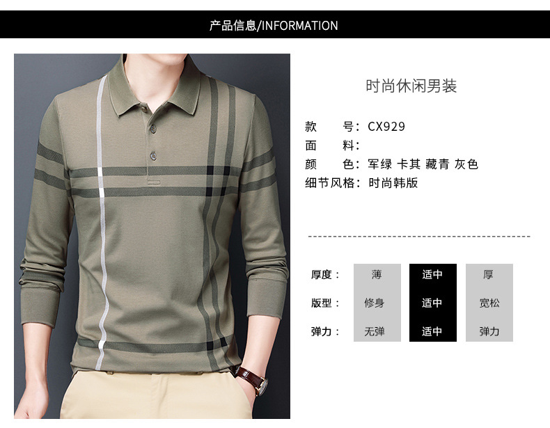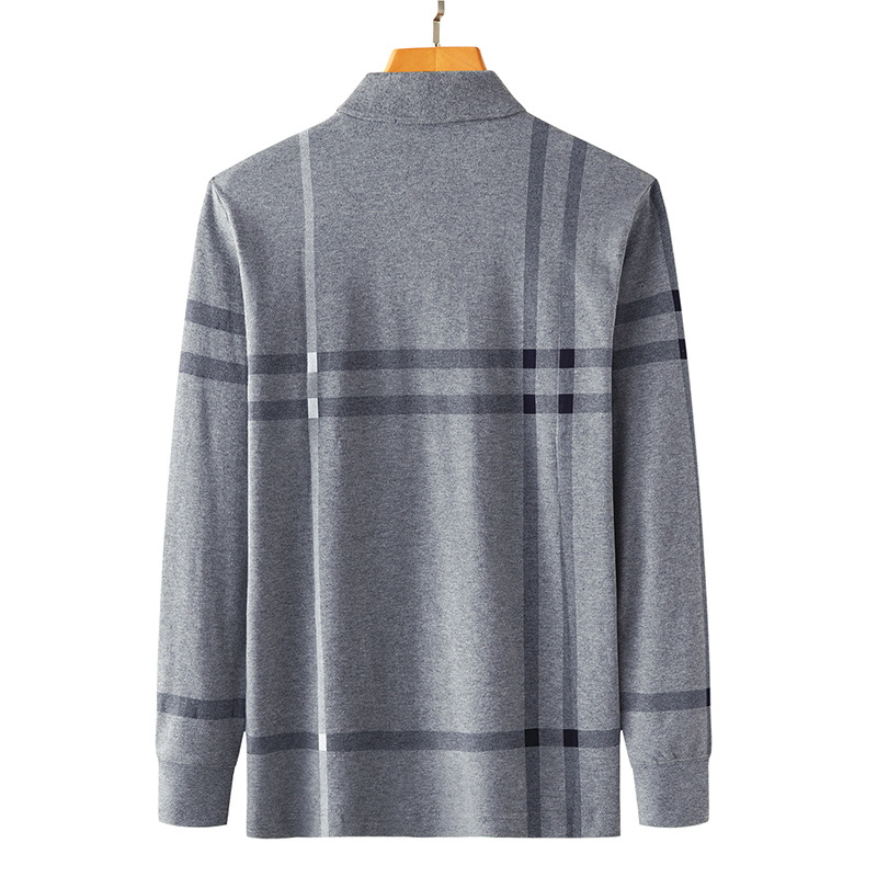 봄철 긴팔 순면 티셔츠 남성용 스트라이프 베이스 레이어 탑 루즈핏 캐주얼 라펠 카라 면 티셔츠 중년 남성 아메리칸 스타일