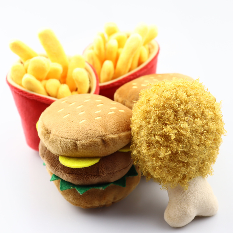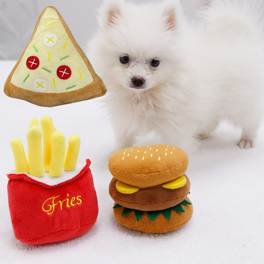새로운 애완 동물 장난감 햄버거 튀김 피자 소리 장난감 개 고양이 치아 갈기 애완 동물 용품 완화 재고