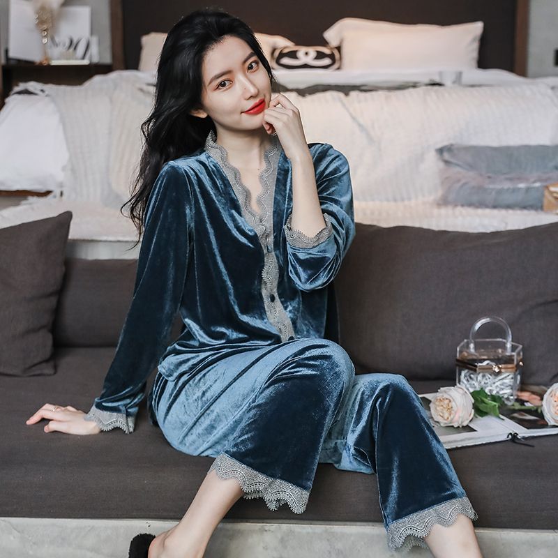 여성용 잠옷 가을 겨울 2022 신상 긴팔 가디건 세트 봄 벨벳 레이스 홈웨어 편안한 실내복