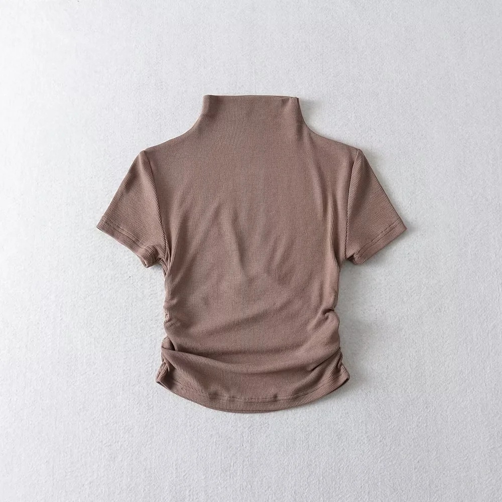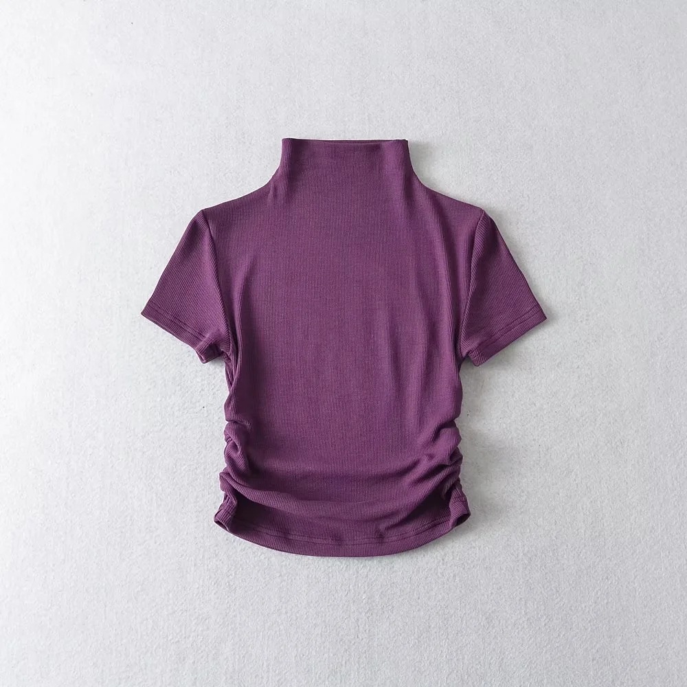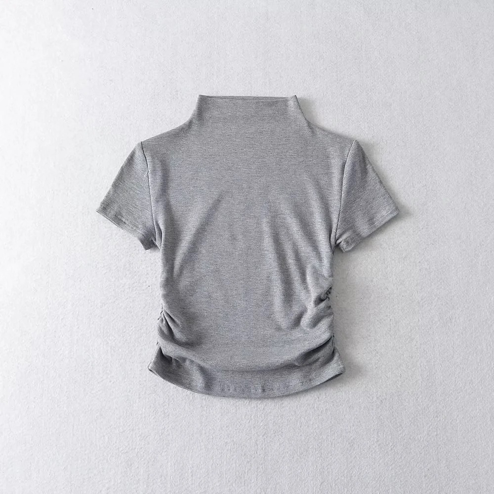 작은 하이 넥 꽉 짧은 소매 유럽과 미국 스타일 여성의 새로운 단색 측면 주름 꽉 탑 향신료 소녀 스레드 티셔츠