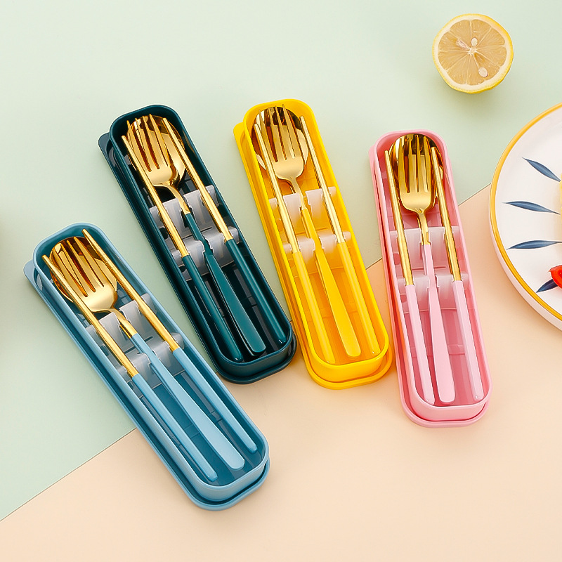 노란색 3 피스 실버 (숟가락 + 젓가락 + 포크 + 상자)