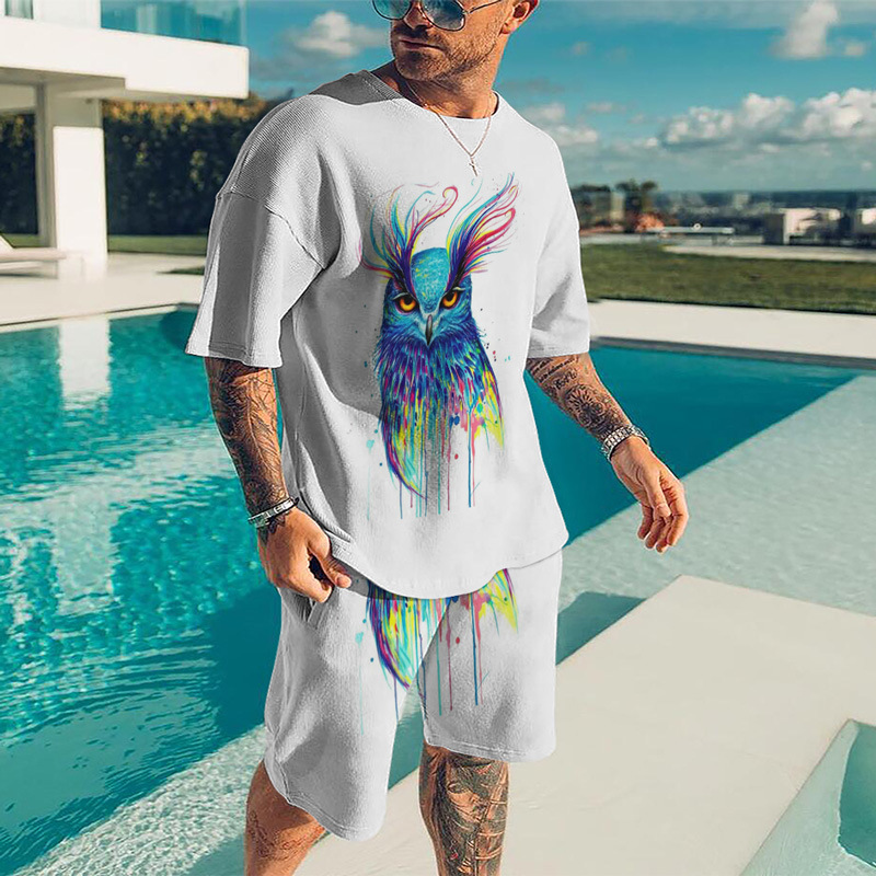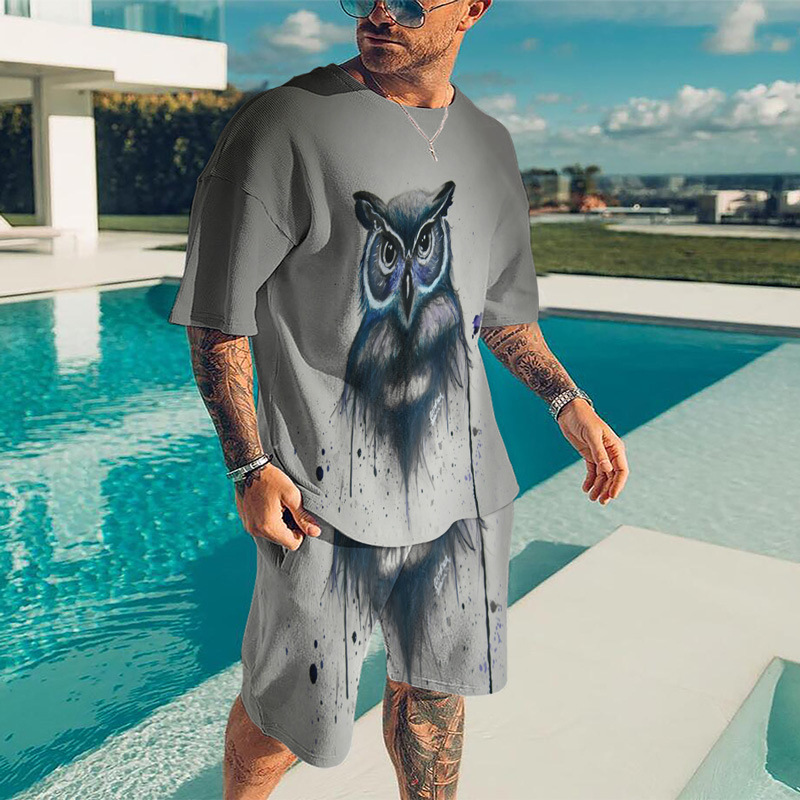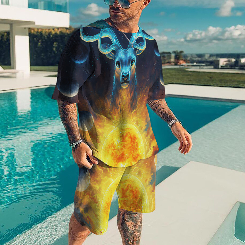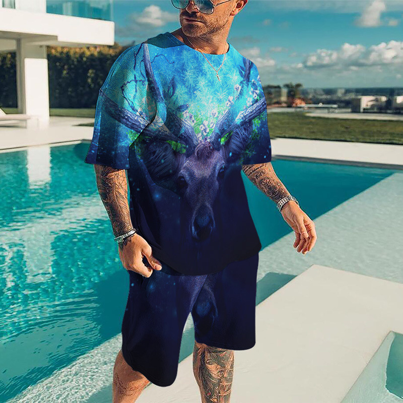 아마존 크로스 보더 동물 디지털 인쇄 3D 남성 캐주얼 비치 바지 티셔츠 반바지 세트
