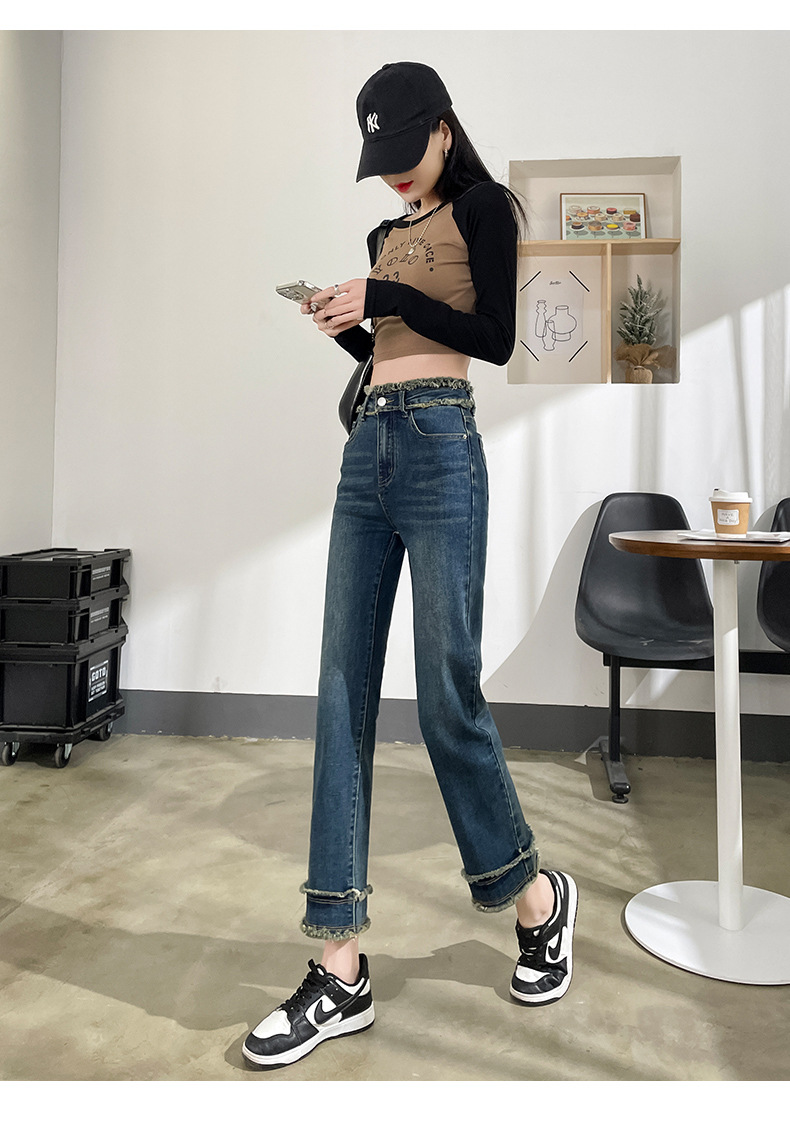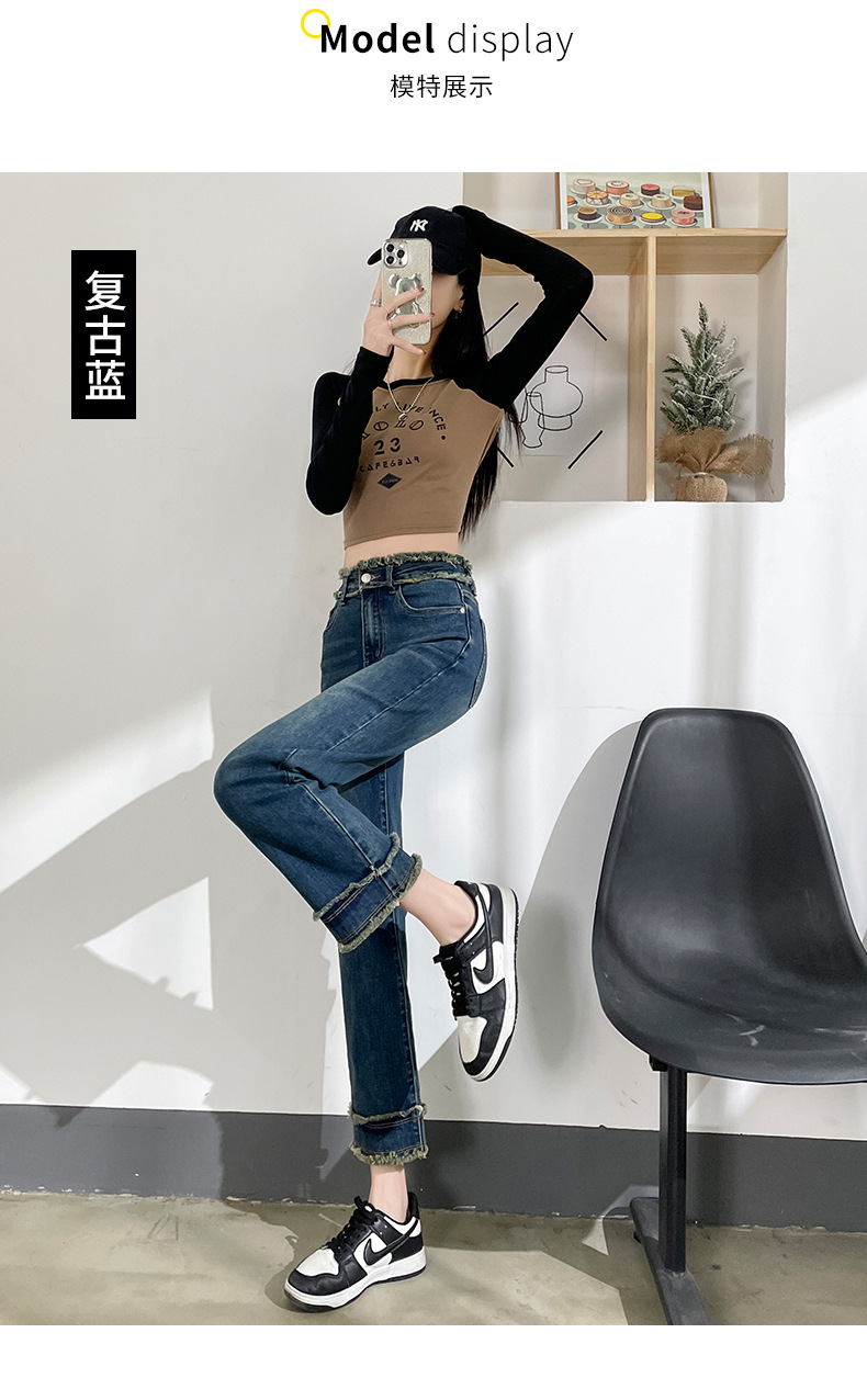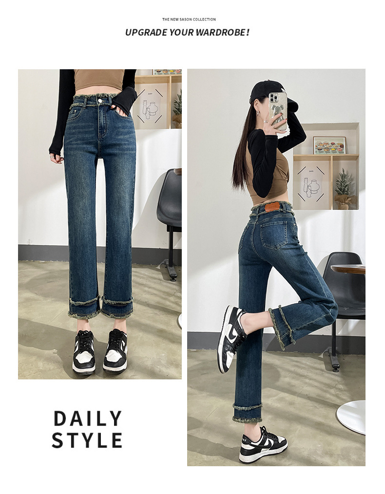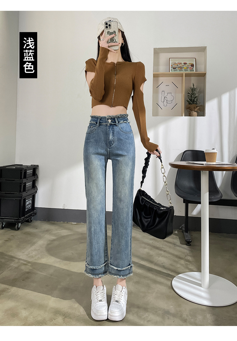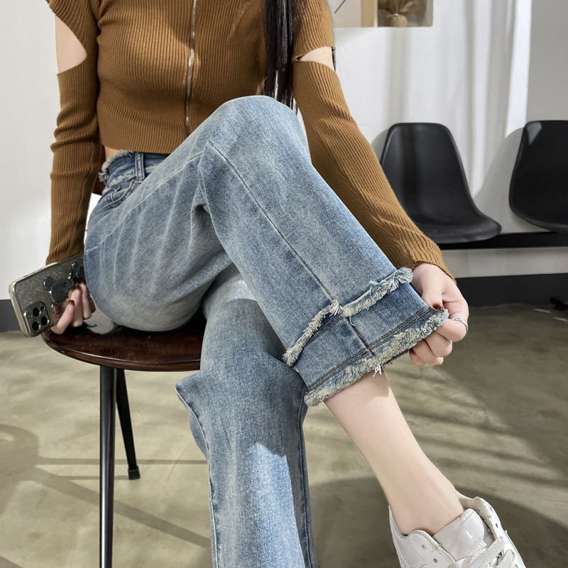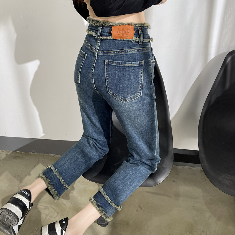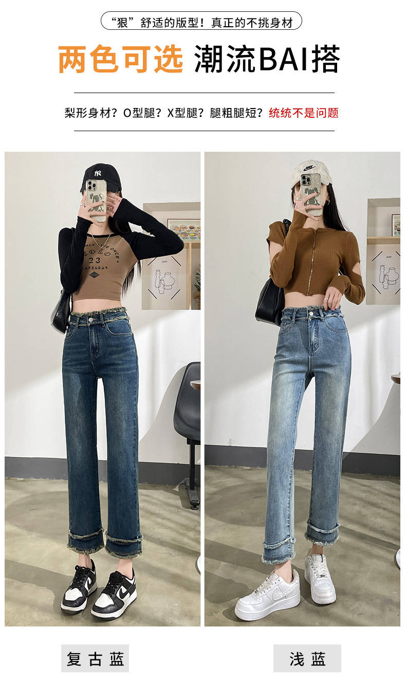 루즈 하이 웨이스트 스트레이트 청바지 여자의 2023 봄과 가을 새로운 작은 느슨한 슬리밍 기모 자른 담배 바지