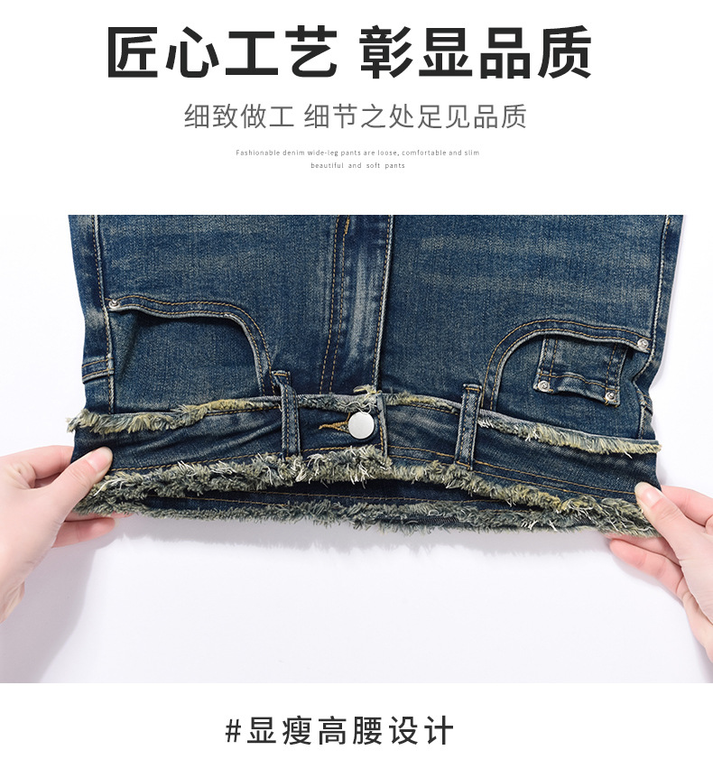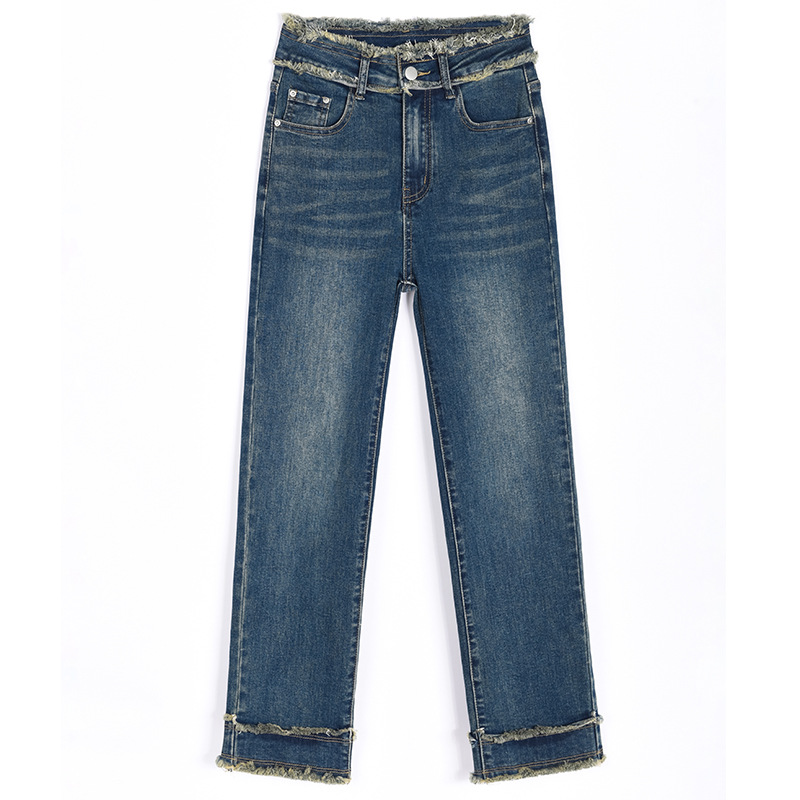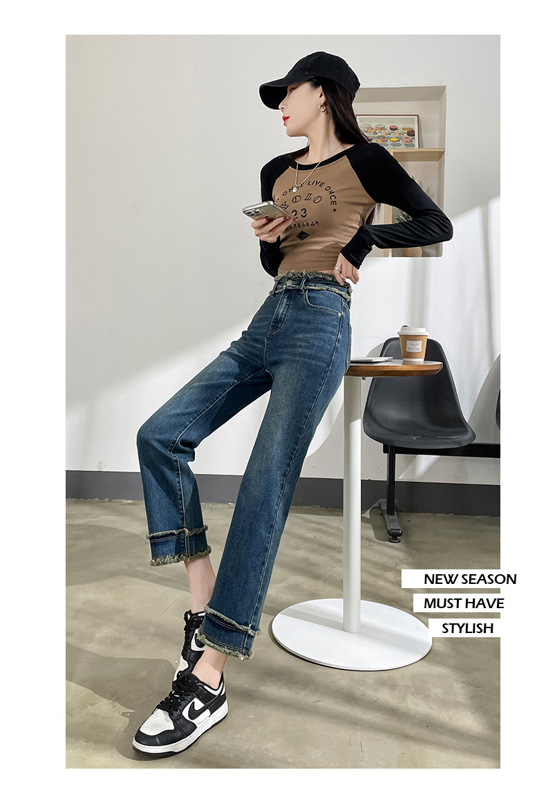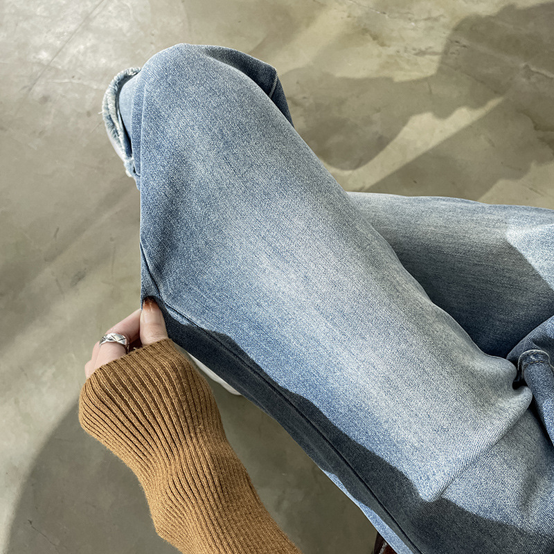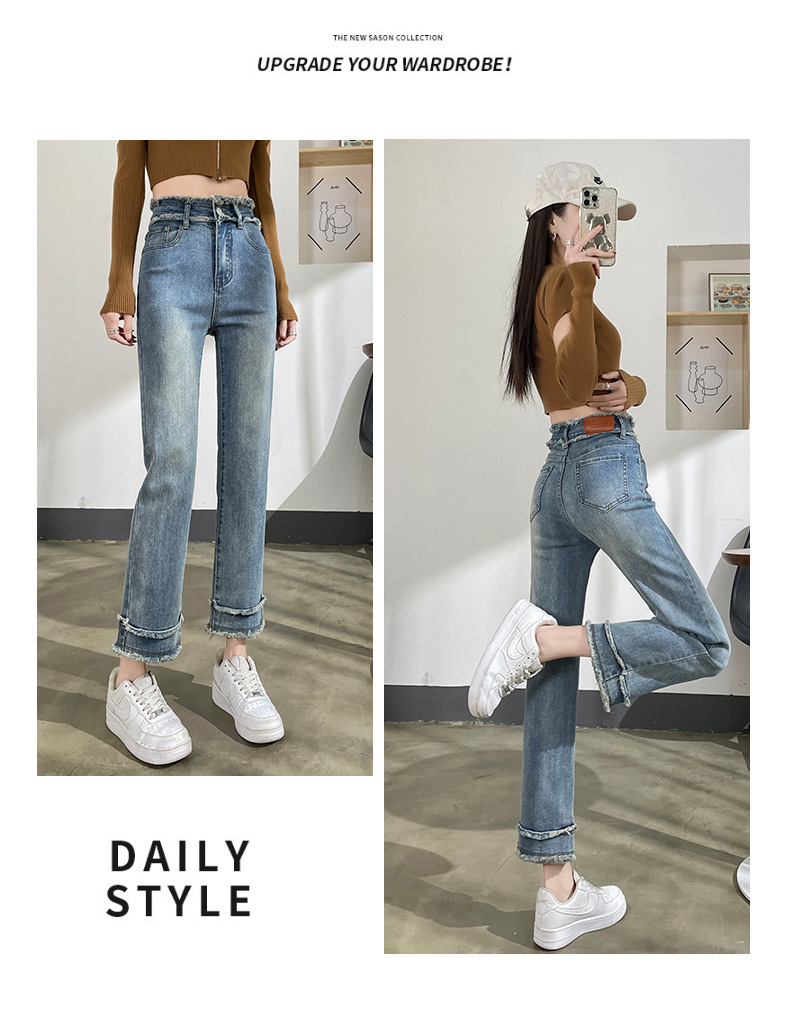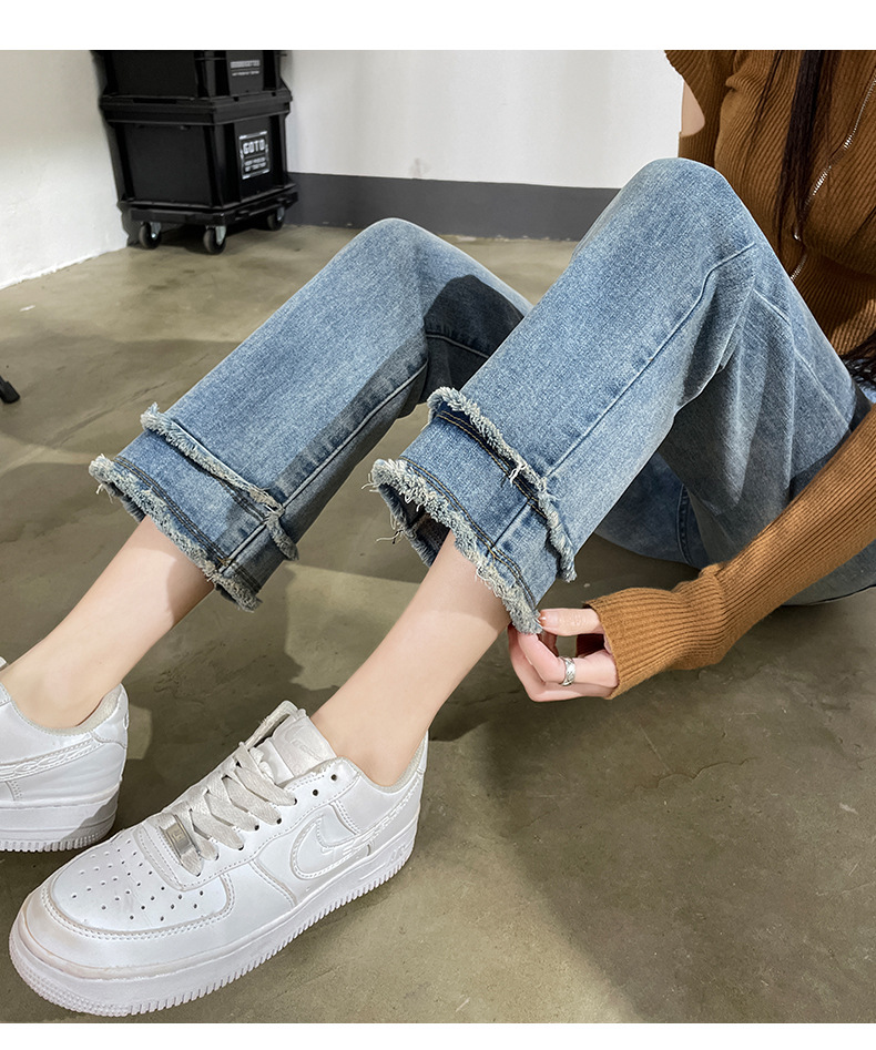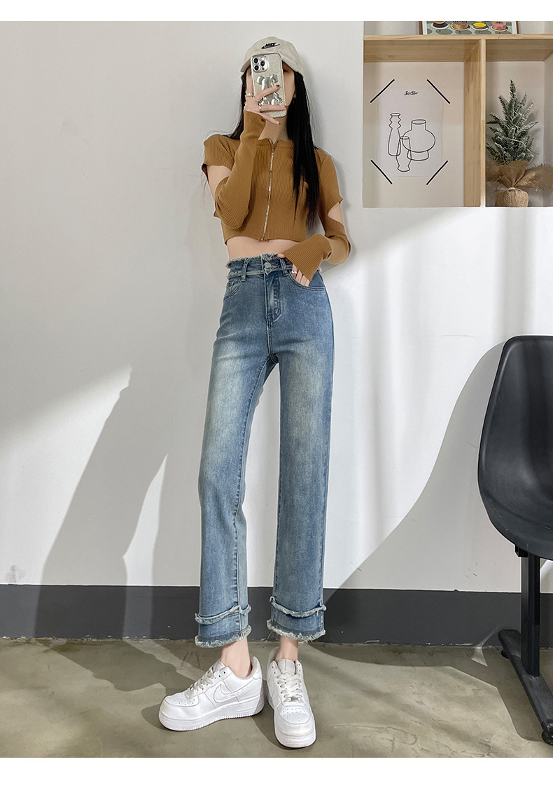 루즈 하이 웨이스트 스트레이트 청바지 여자의 2023 봄과 가을 새로운 작은 느슨한 슬리밍 기모 자른 담배 바지