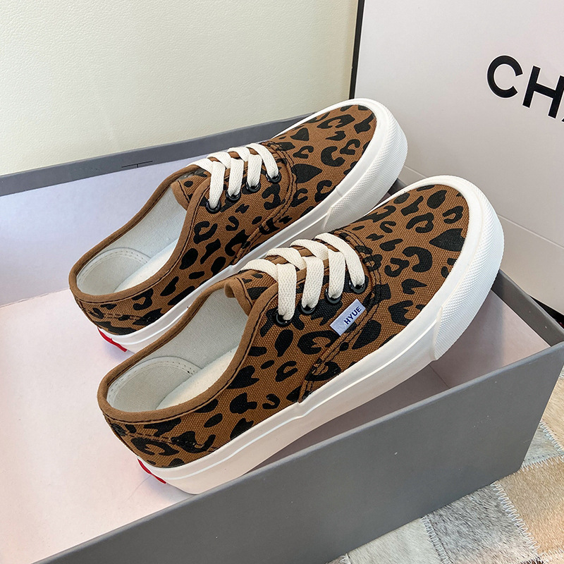 흰색 신발 내부 높이 증가 6cm 여성용 신발 슬립온 레오파드 프린트 천 신발 플랫 슈즈 두꺼운 밑창 레이스업 학생용 신발 여성용