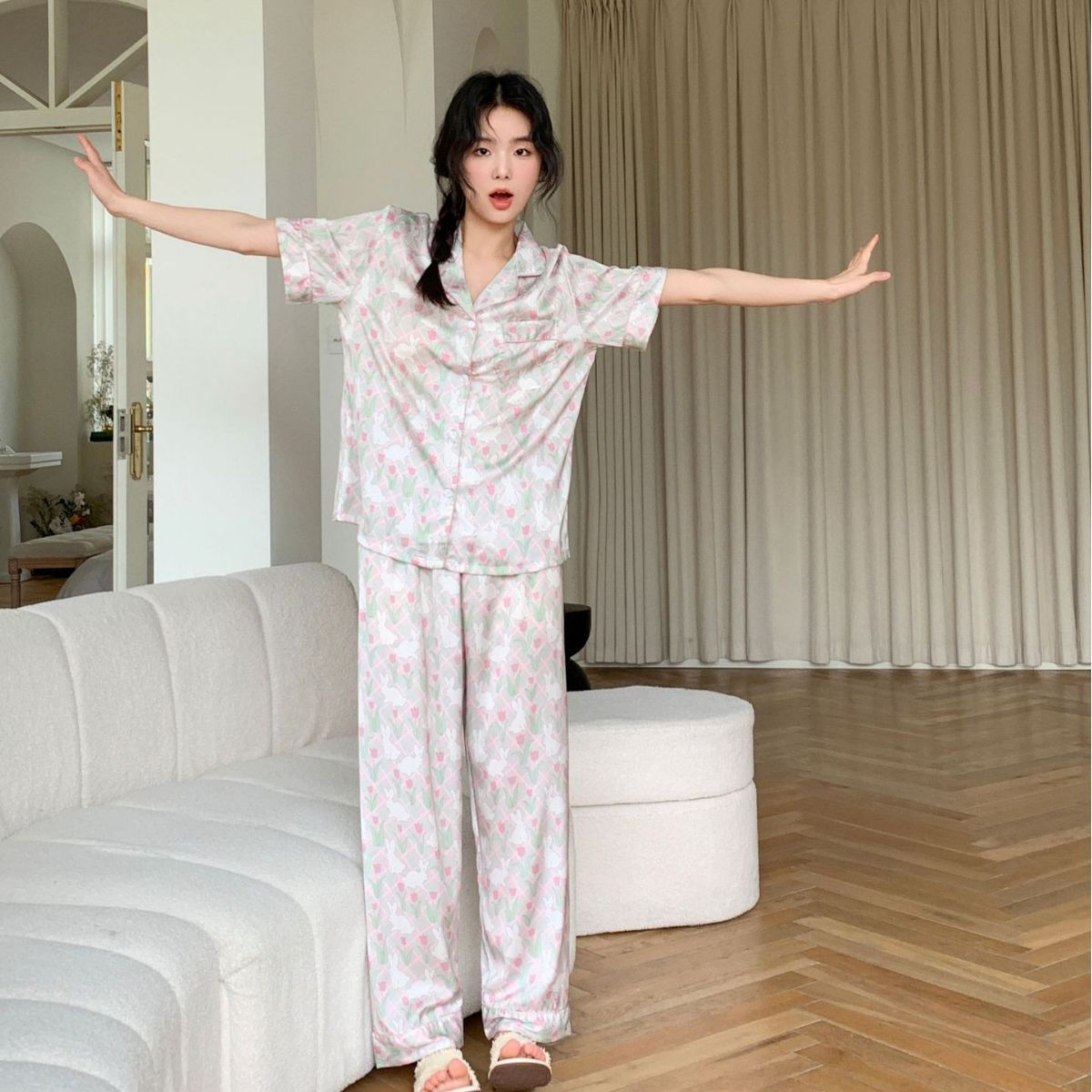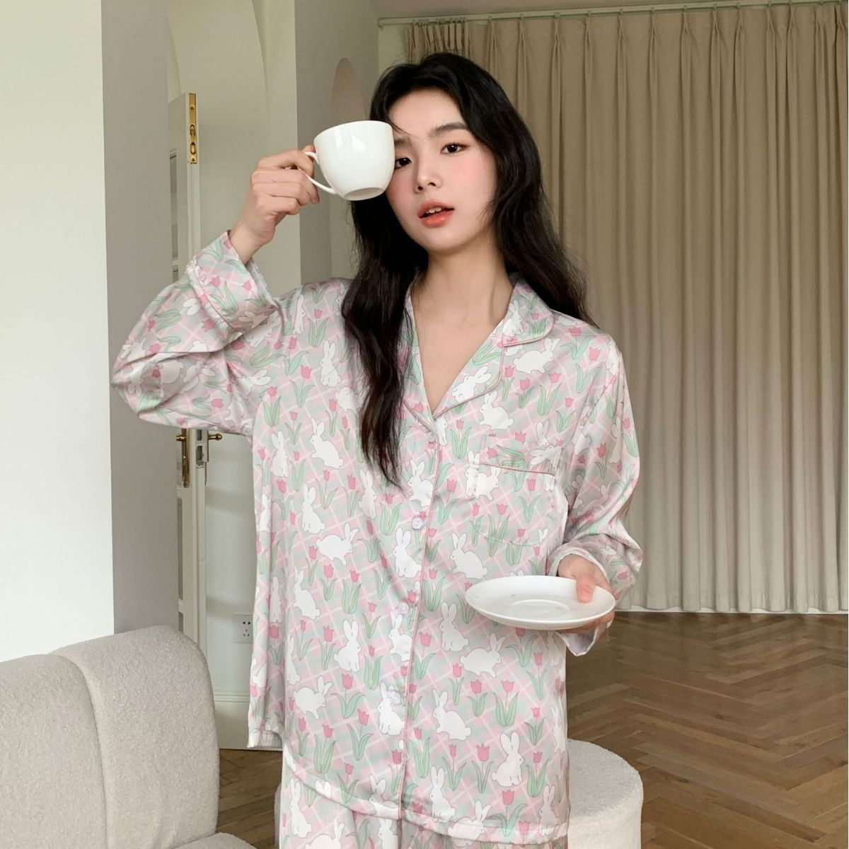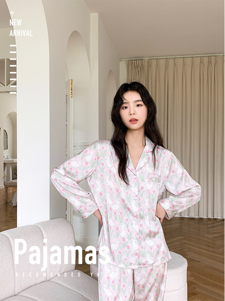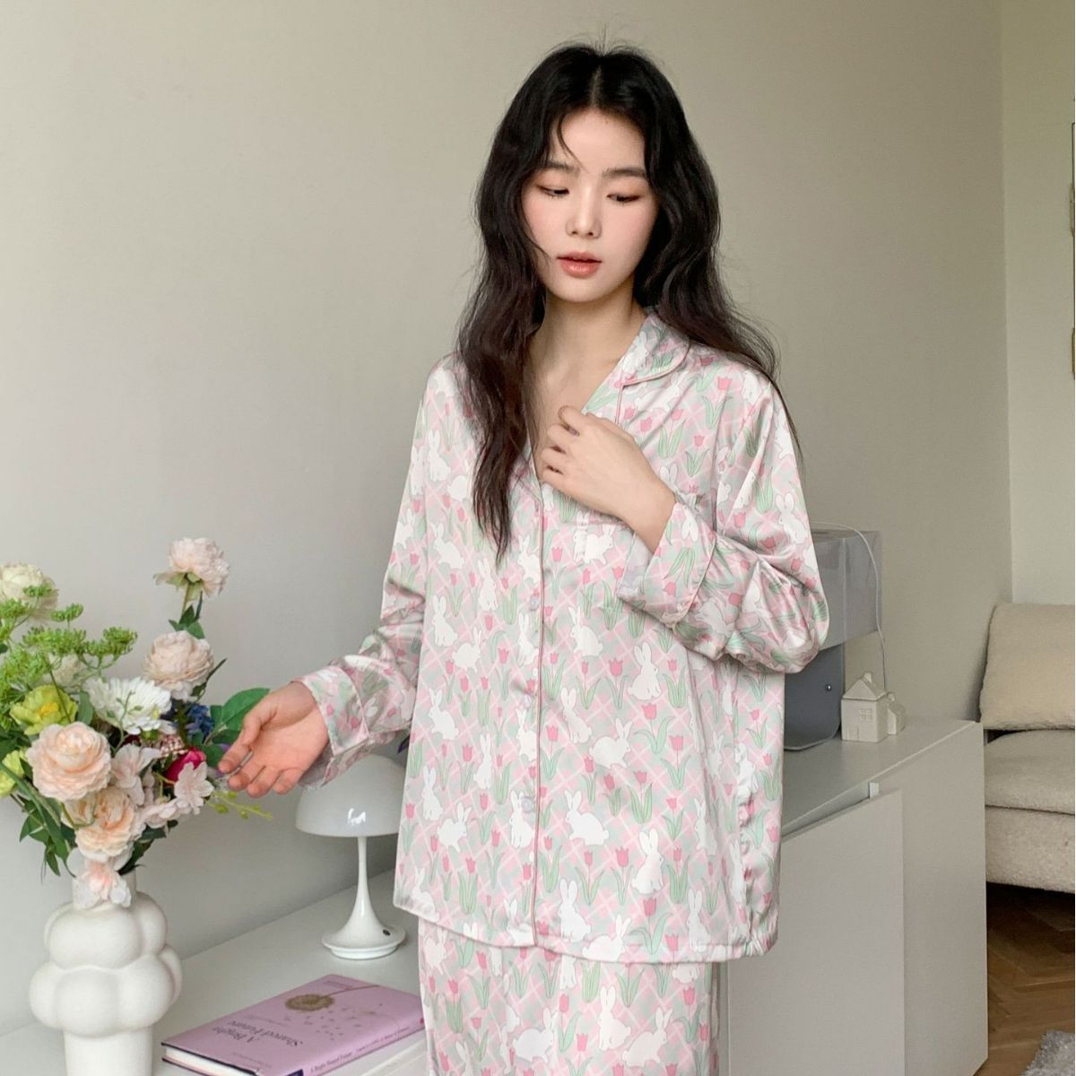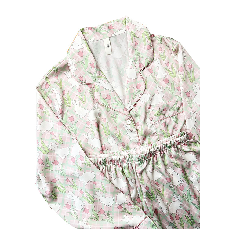 튤립 토끼 잠옷 여성 달콤한 소녀 얼음 실크 새틴 가정 옷 긴 소매 2023 봄 여름 얇은