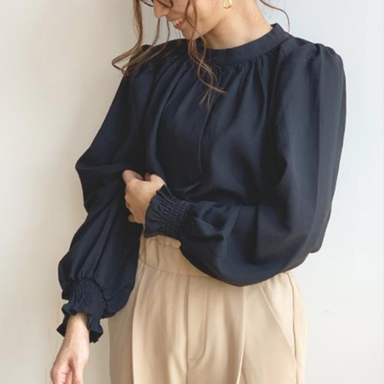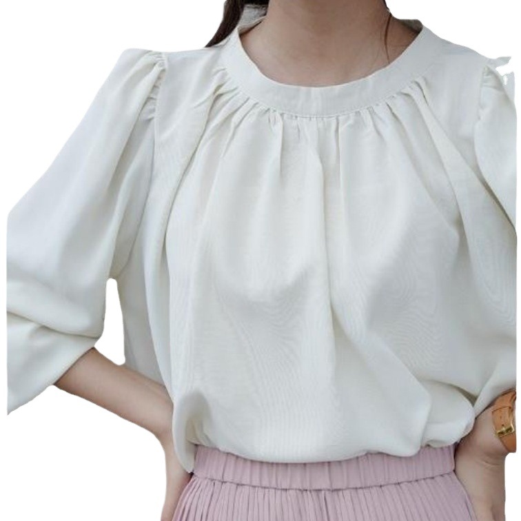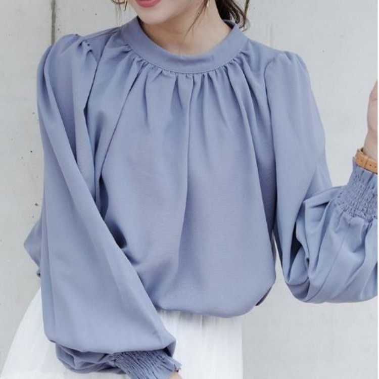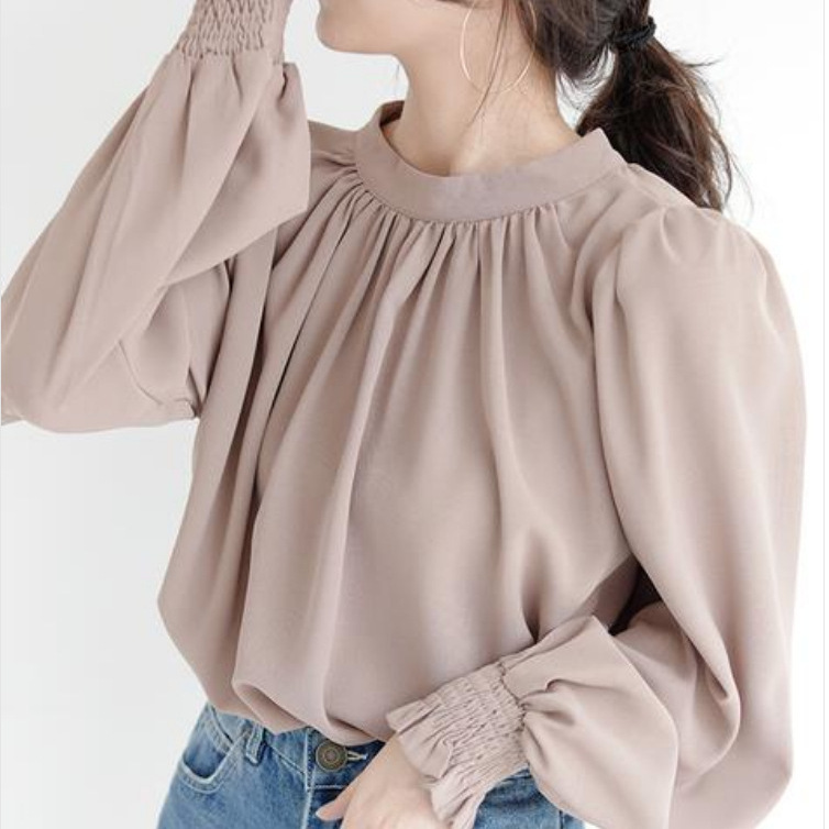 유럽역 롯데 같은 스타일 2025 봄 한국식 속건성 주름 방지 라운드 하이넥 퍼프 슬리브 쉬폰 셔츠 탑