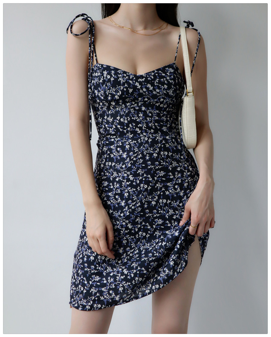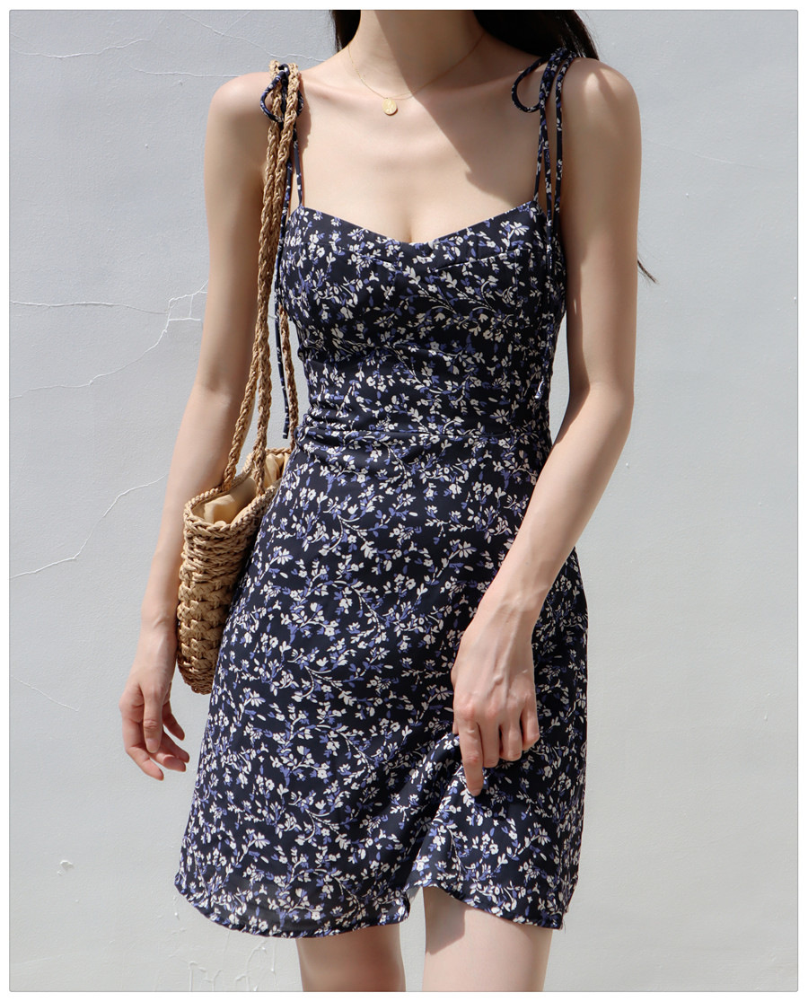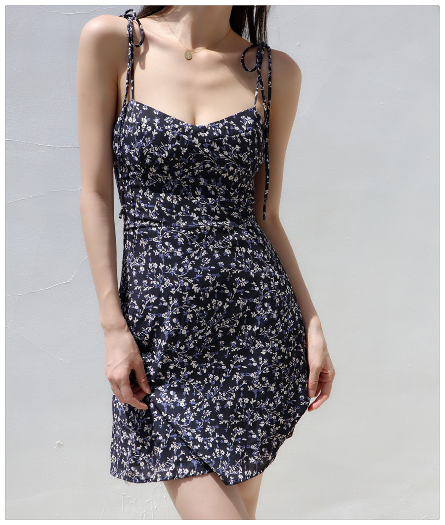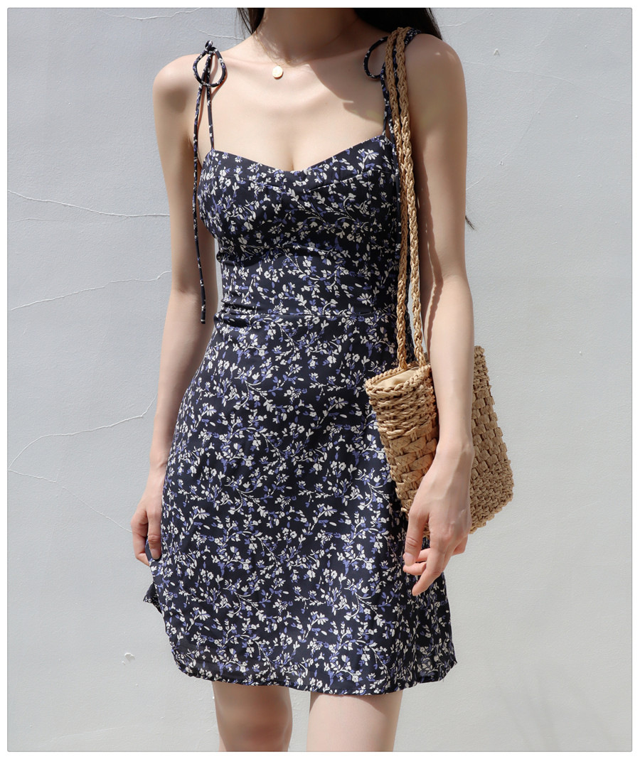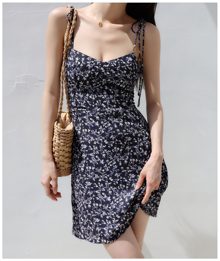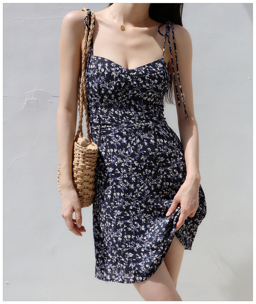 Little Zou Ju 꽃 칼집 원피스 여성 여름 섹시한 로우 컷 레이스 업 스트랩 A 라인 스커트 짧은 스커트 비치 스커트