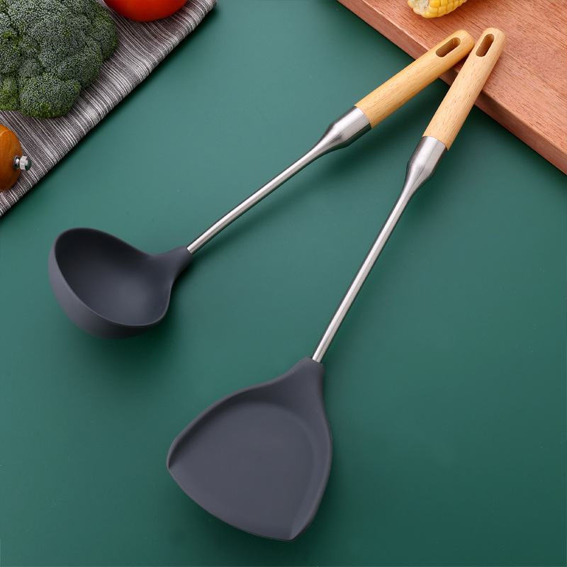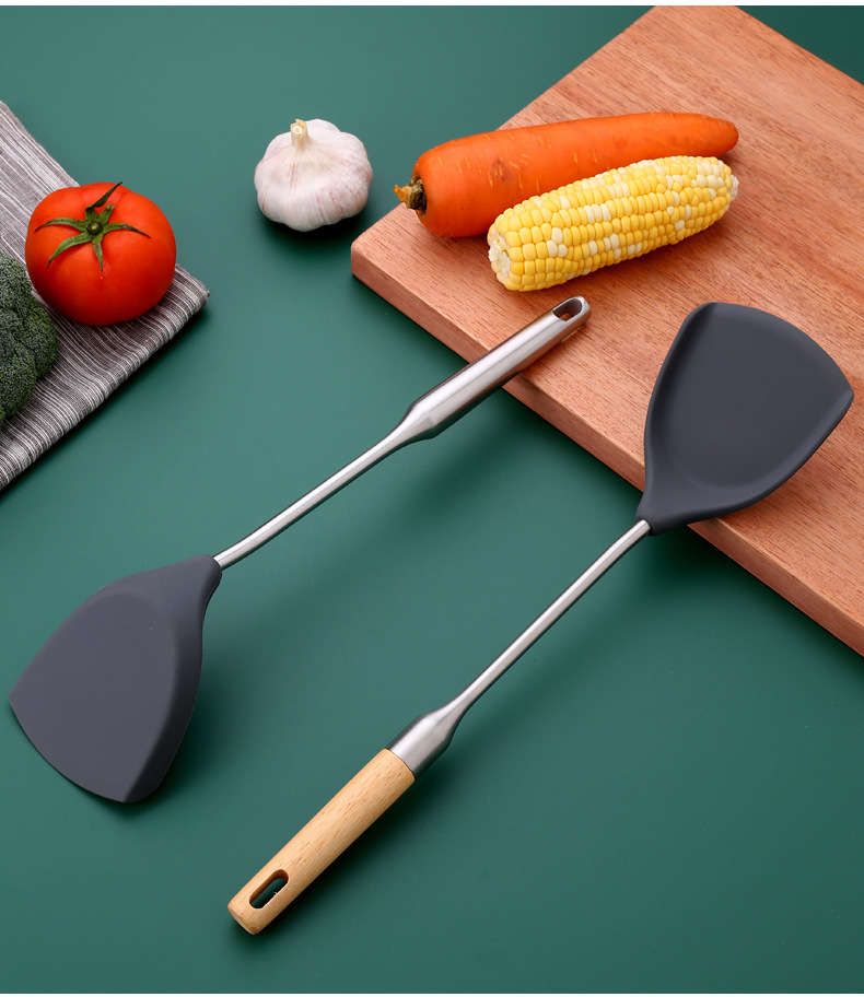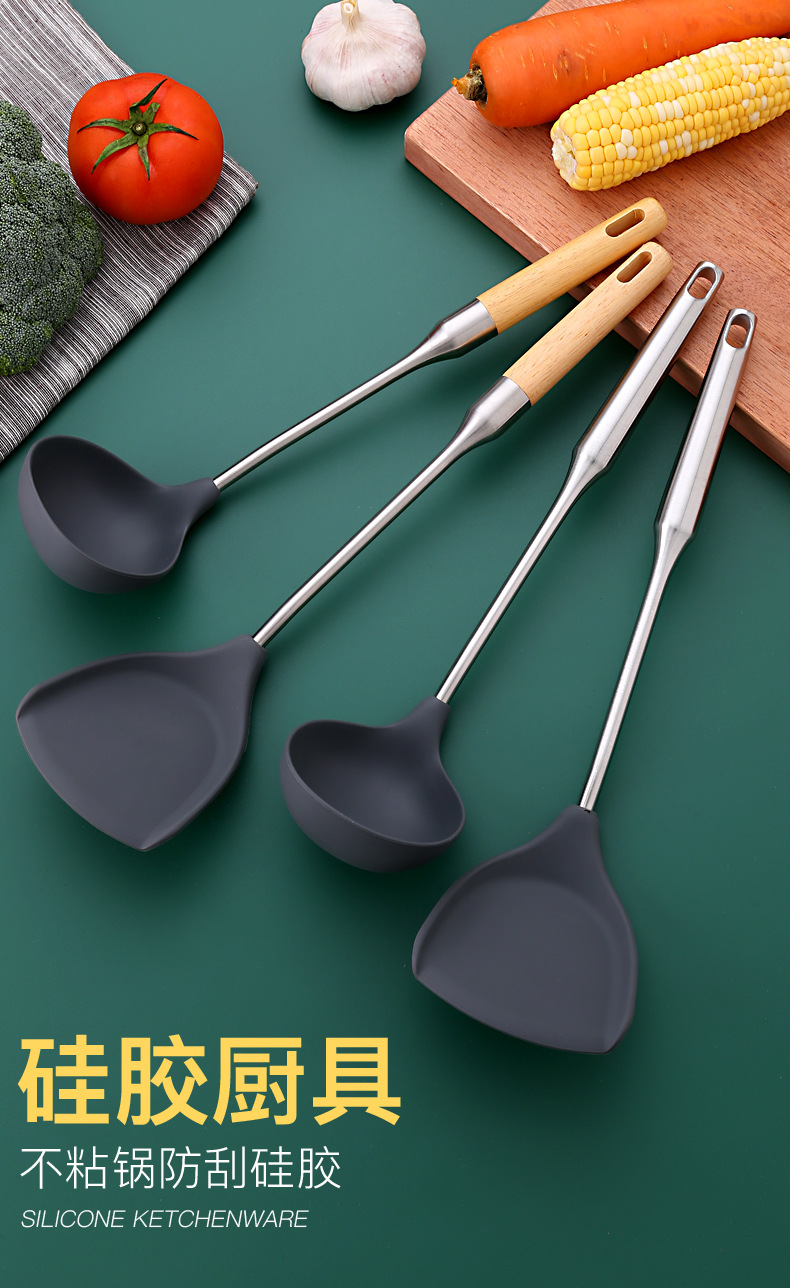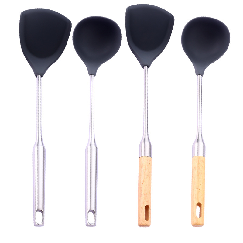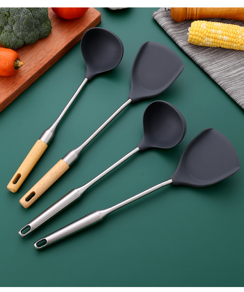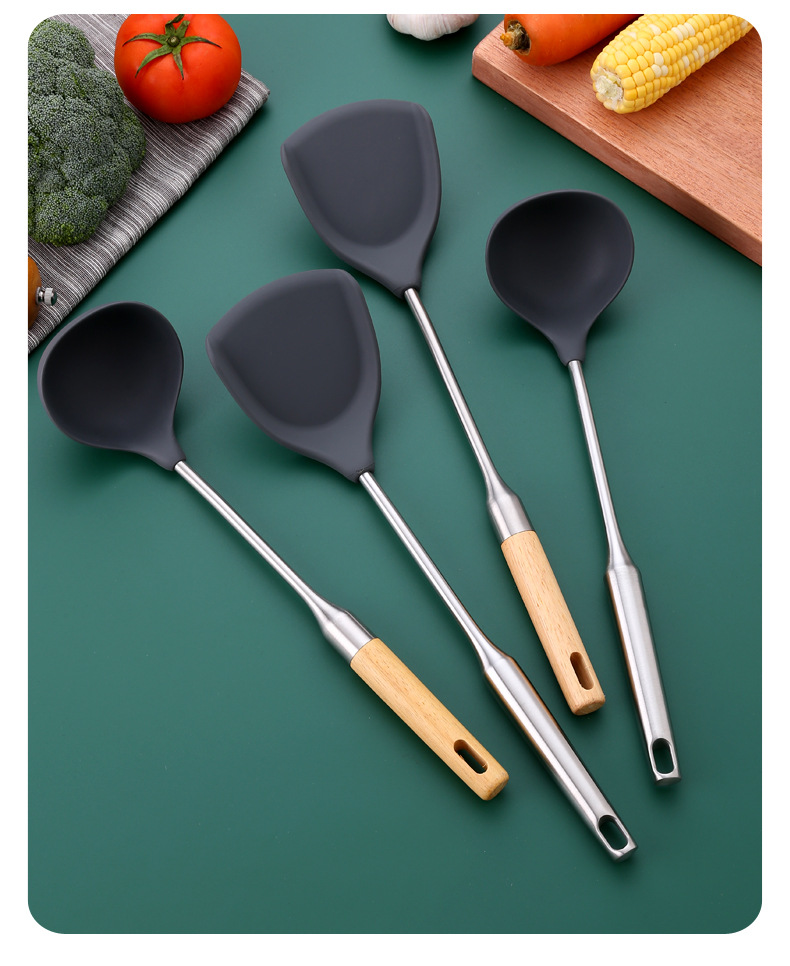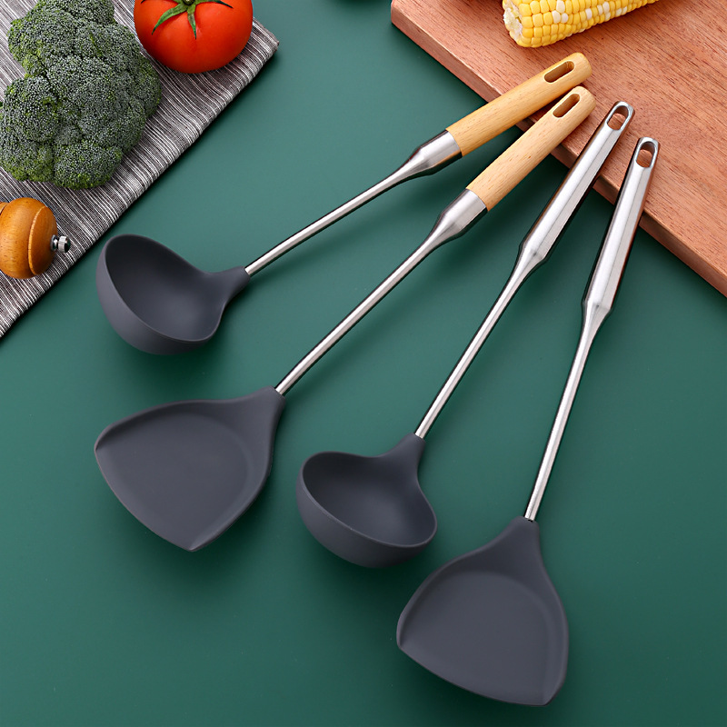 스테인레스 스틸 실리콘 냄비 삽 숟가락 주방 용품 세트 가정용 나무 손잡이 볶음 숟가락 숟가락 숟가락 숟가락 요리 4 종 세트 도매