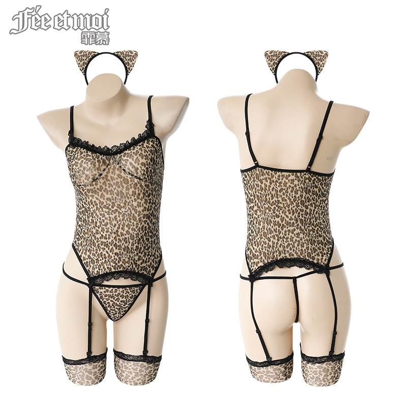 섹시한 속옷 여자의 섹시한 레오파드 무늬 유혹 세트 원피스 속옷 유니폼 가터 벨트 탄성 잠옷 레이스 머리