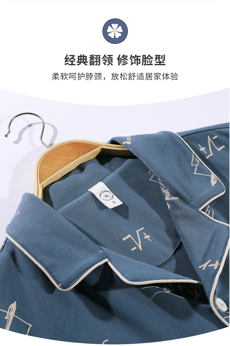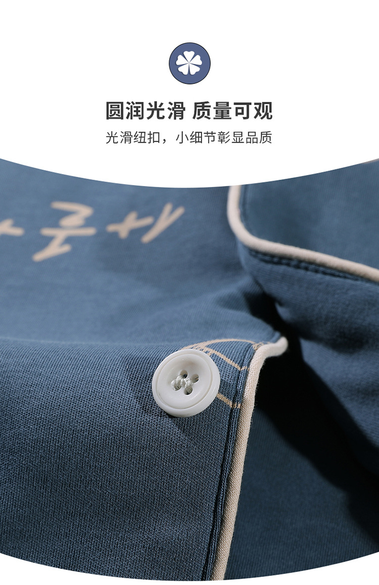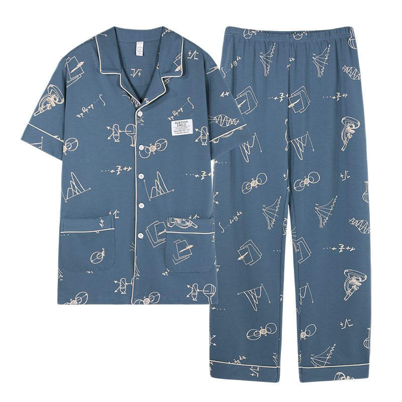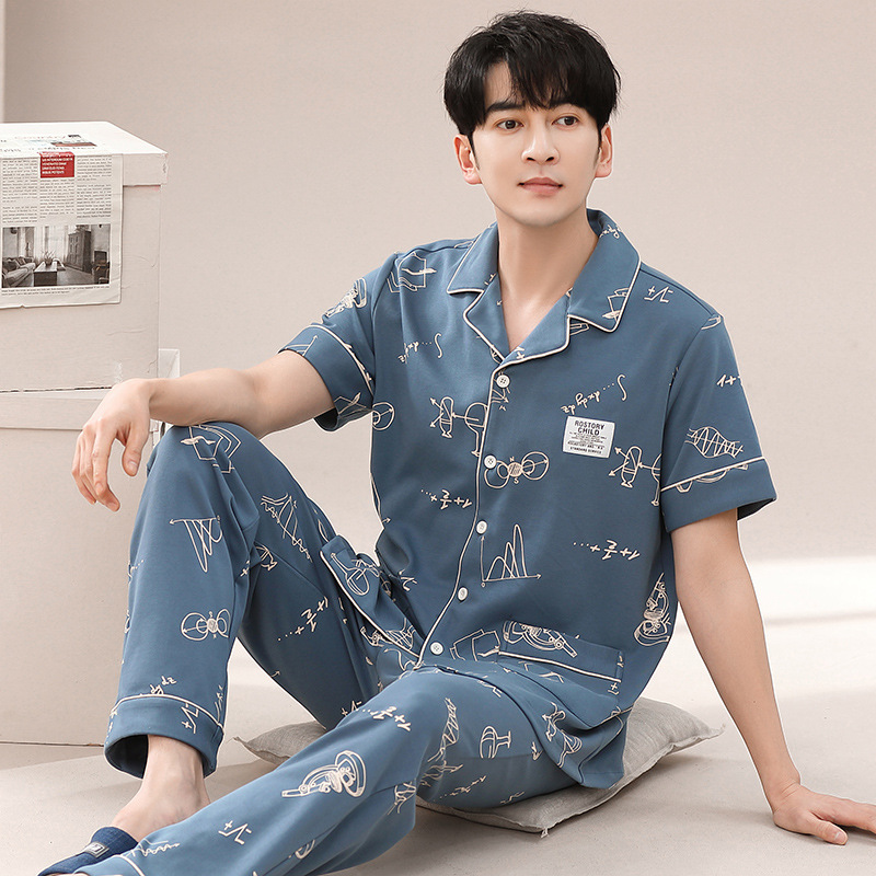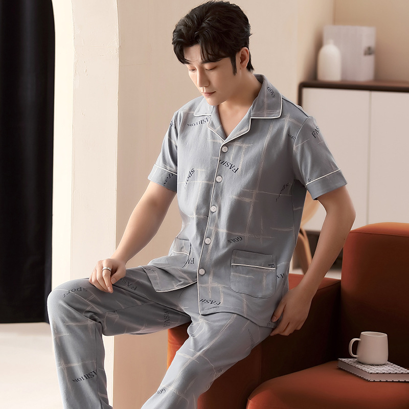남성용 잠옷, 순면, 여름용, 한국 스타일, 카디건, 라펠, 반팔, 긴바지, 고급스러운 느낌, 순면 홈웨어, 외부에서 착용 가능